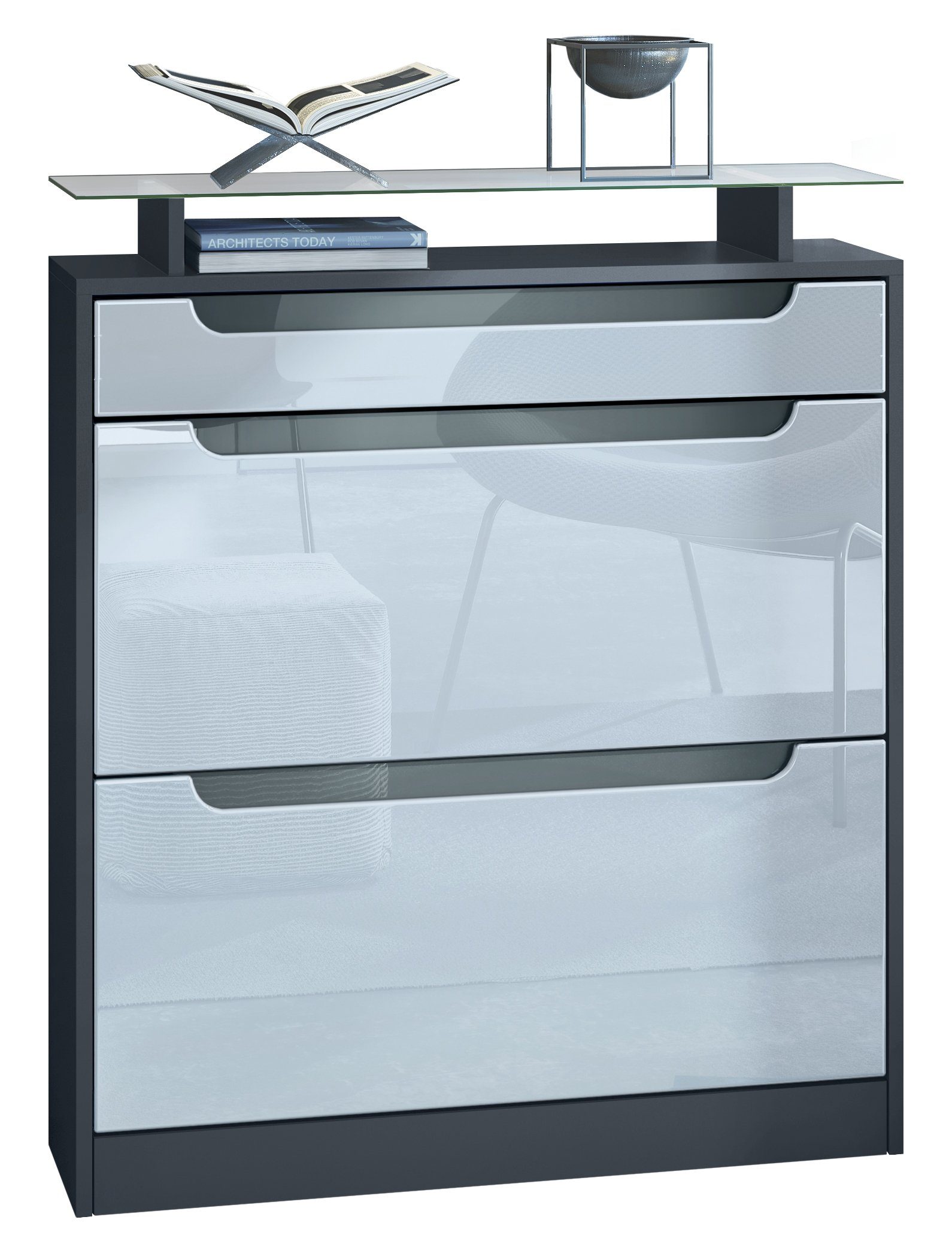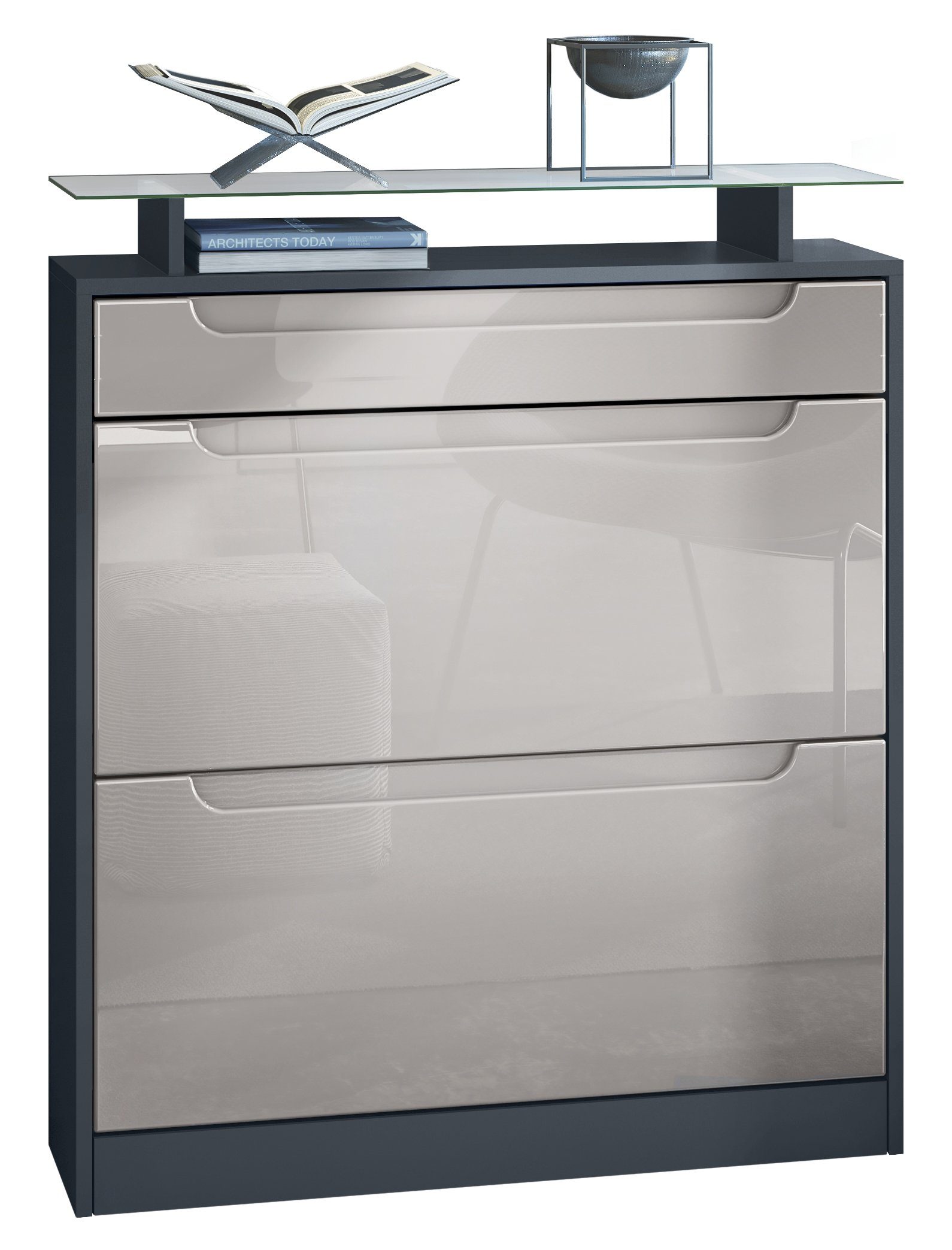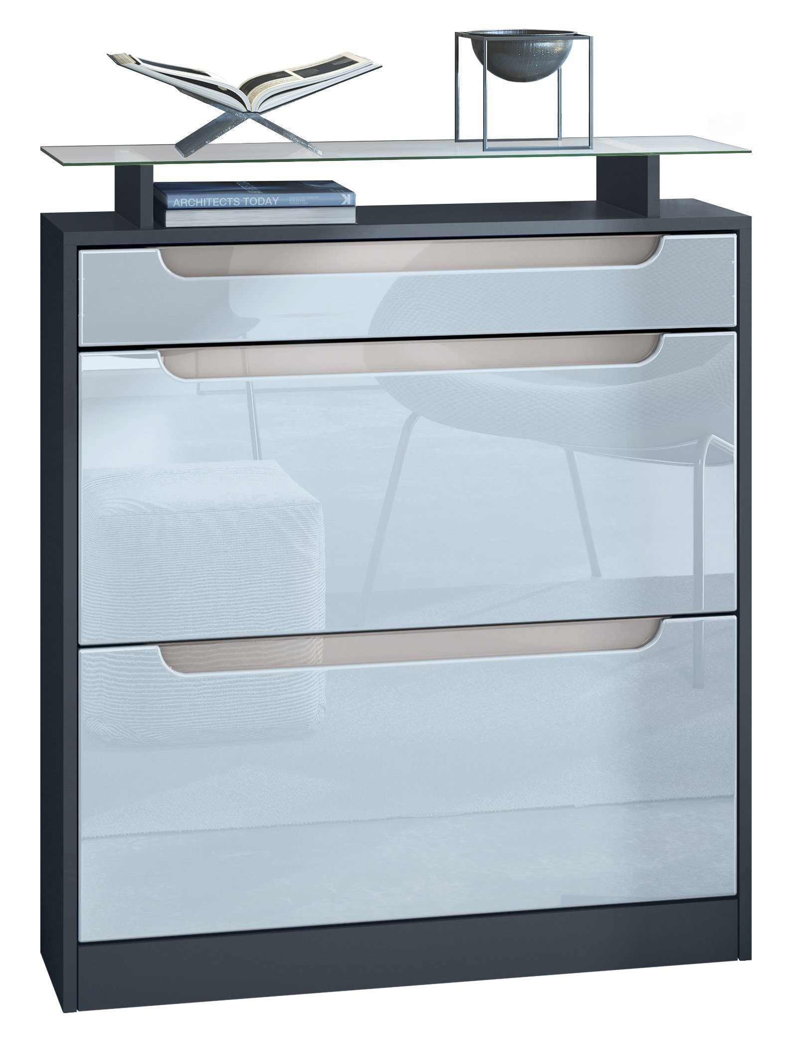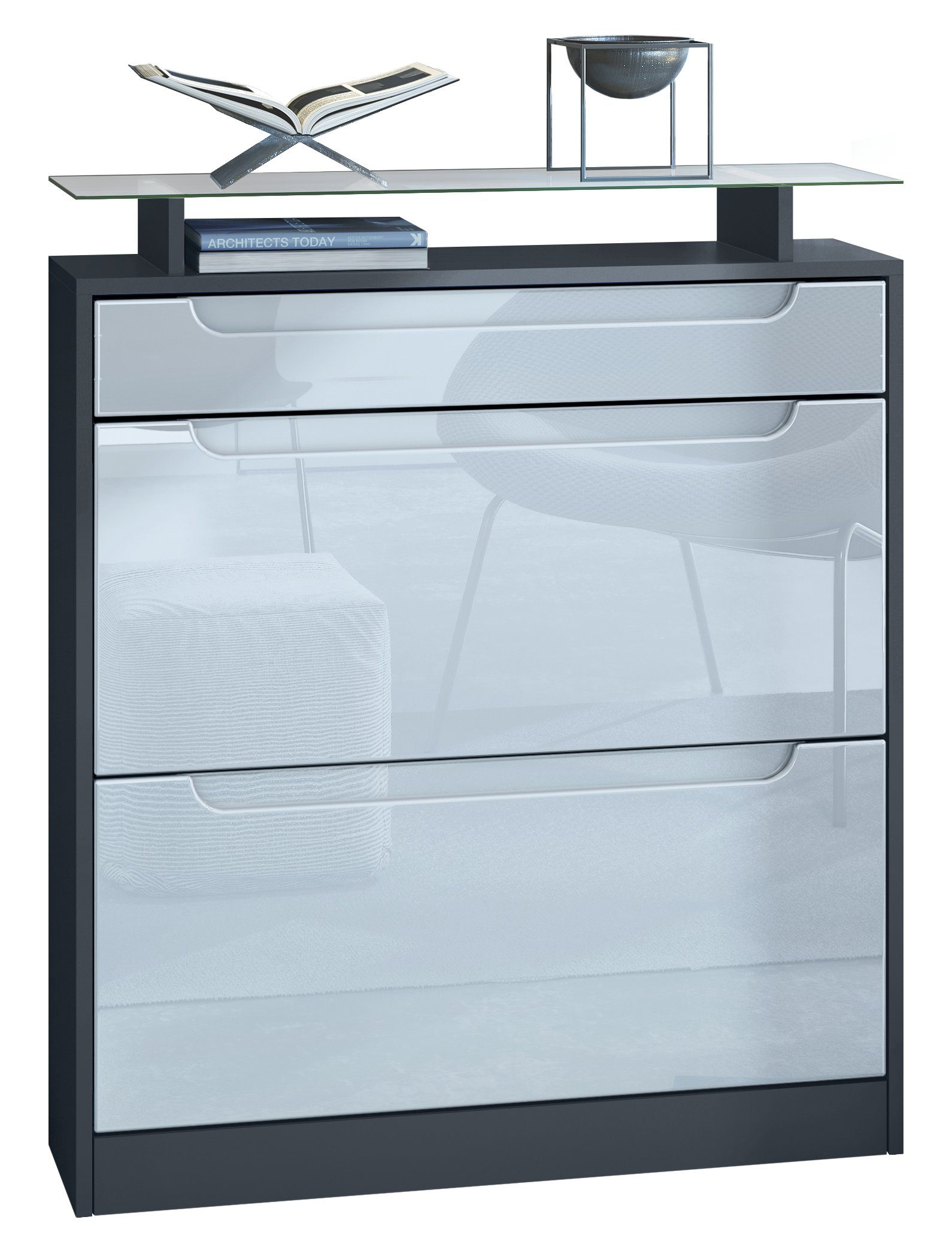 Der geräumige Standschuhschrank Fiesta präsentiert sich als praktisches Möbelstück mit modernem Design für die Diele, hergestellt in Deutschland. Das schmale Schuhregal ist mit zwei doppelreihigen Schuhkippern und mit einer leichtgängigen Schublade ausgerüstet. Diese verläuft dank Laufschienen aus Metall nahezu geräuschlos und sorgt für eine leichte Handhabung. Der Schuhorganizer ist mit praktischen Griffmulden ausgestattet und fügt sich durch die grifflose Optik schlicht in Ihren Flur ein. Zusätzlich gibt es eine aufgesetzte Glasablage für den Schuhschrank mit Schublade. Der Glasaufsatz bietet weitere Ablagefläche und lädt zum Dekorieren ein. Mit den inkludierten Beschlägen fixieren Sie das Standschuhregal, für zusätzliche Sicherheit, an der Wand. Eine Rückwand ist nicht enthalten.