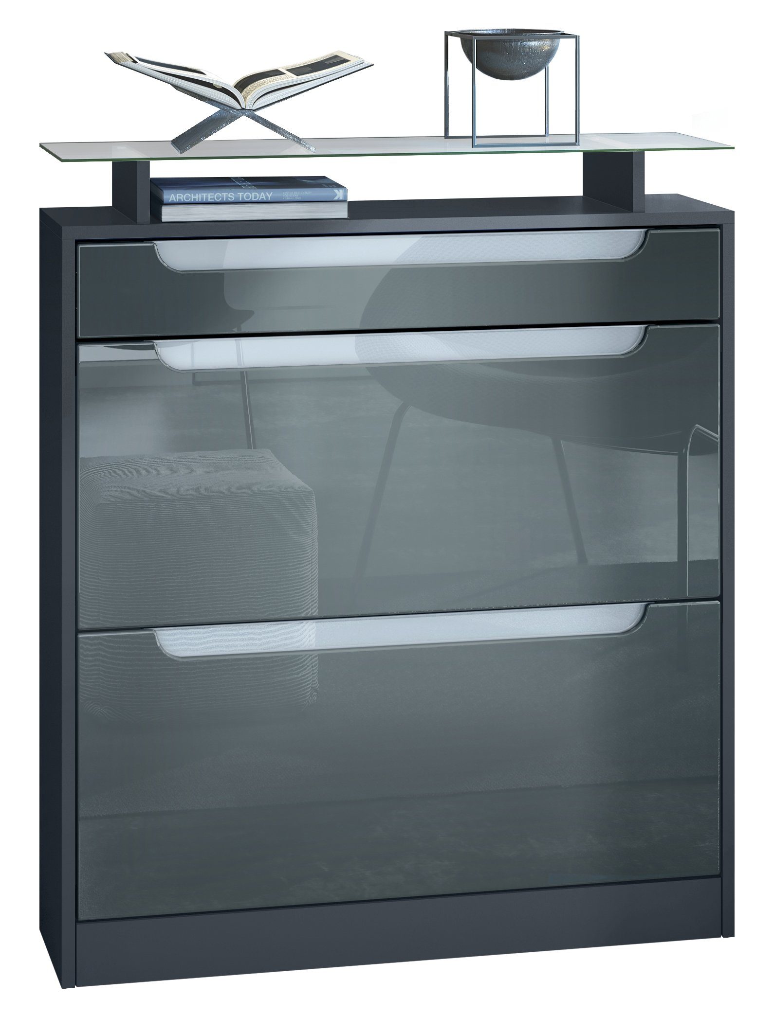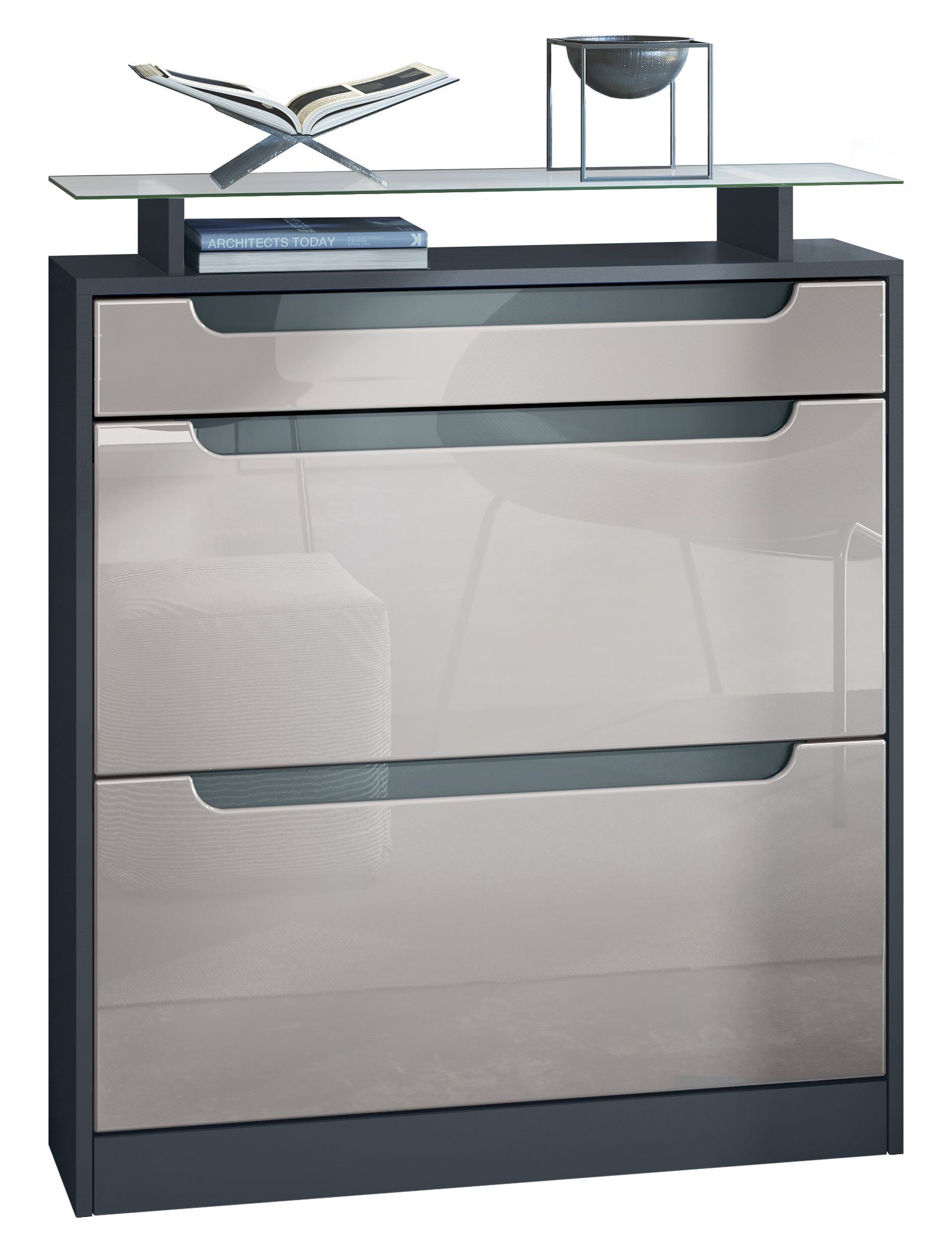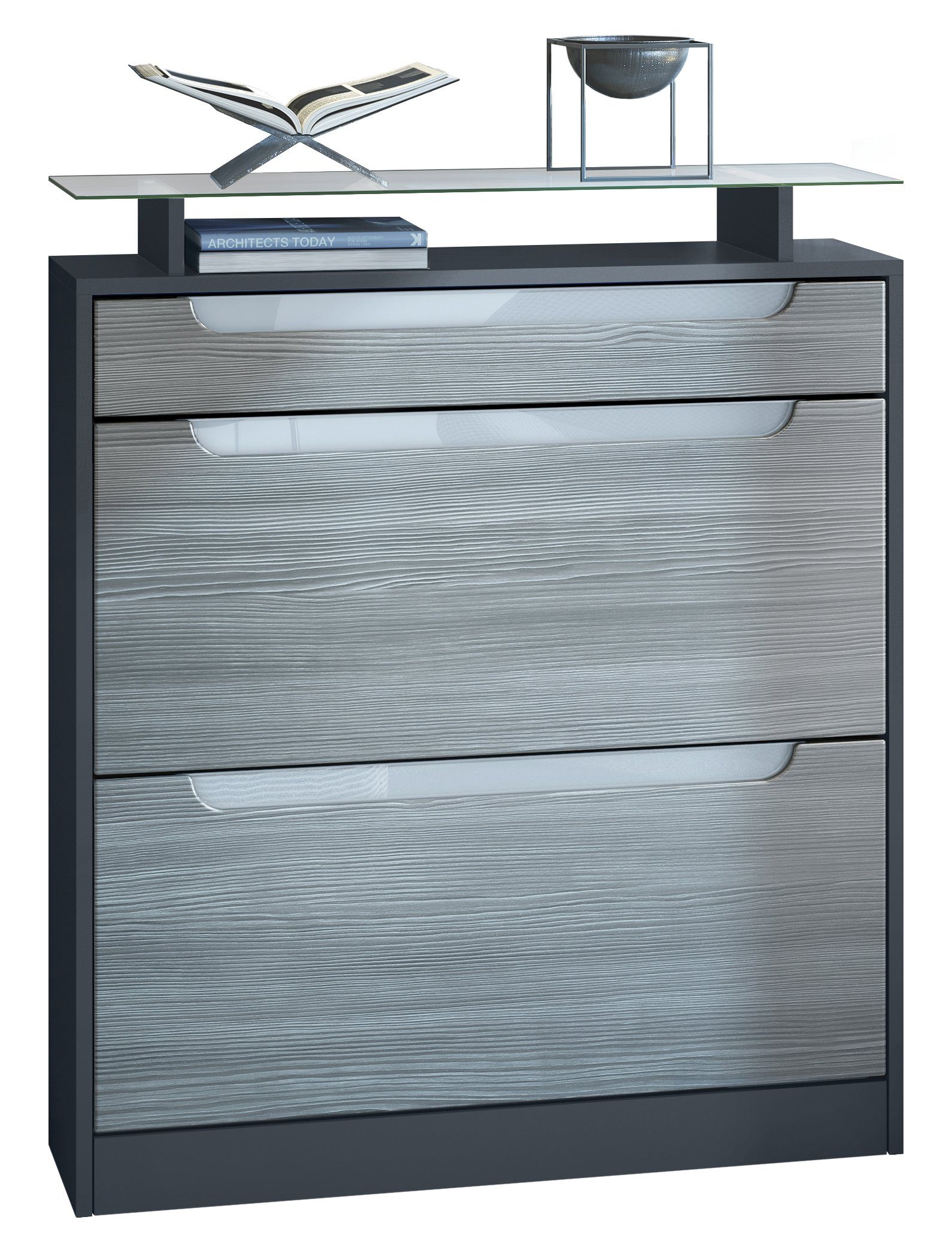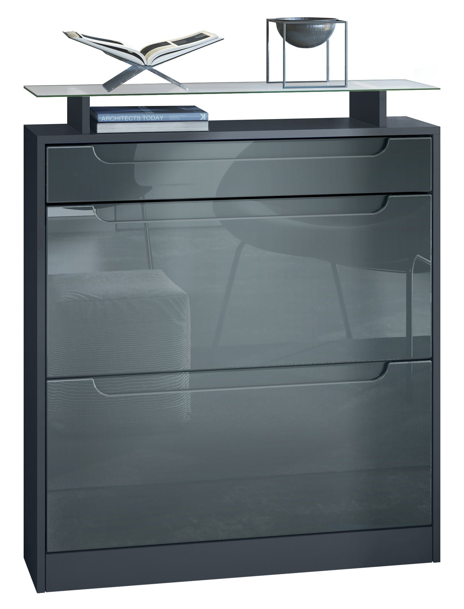Der geräumige Standschuhschrank Fiesta präsentiert sich als praktisches Möbelstück mit modernem Design für die Diele, hergestellt in Deutschland. Das schmale Schuhregal ist mit zwei doppelreihigen Schuhkippern und mit einer leichtgängigen Schublade ausgerüstet. Diese verläuft dank Laufschienen aus Metall nahezu geräuschlos und sorgt für eine leichte Handhabung. Der Schuhorganizer ist mit praktischen Griffmulden ausgestattet und fügt sich durch die grifflose Optik schlicht in Ihren Flur ein. Zusätzlich gibt es eine aufgesetzte Glasablage für den Schuhschrank mit Schublade. Der Glasaufsatz bietet weitere Ablagefläche und lädt zum Dekorieren ein. Mit den inkludierten Beschlägen fixieren Sie das Standschuhregal, für zusätzliche Sicherheit, an der Wand. Eine Rückwand ist nicht enthalten.