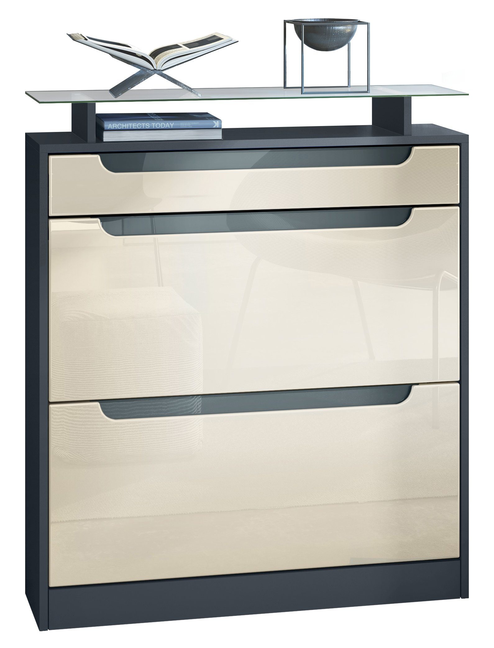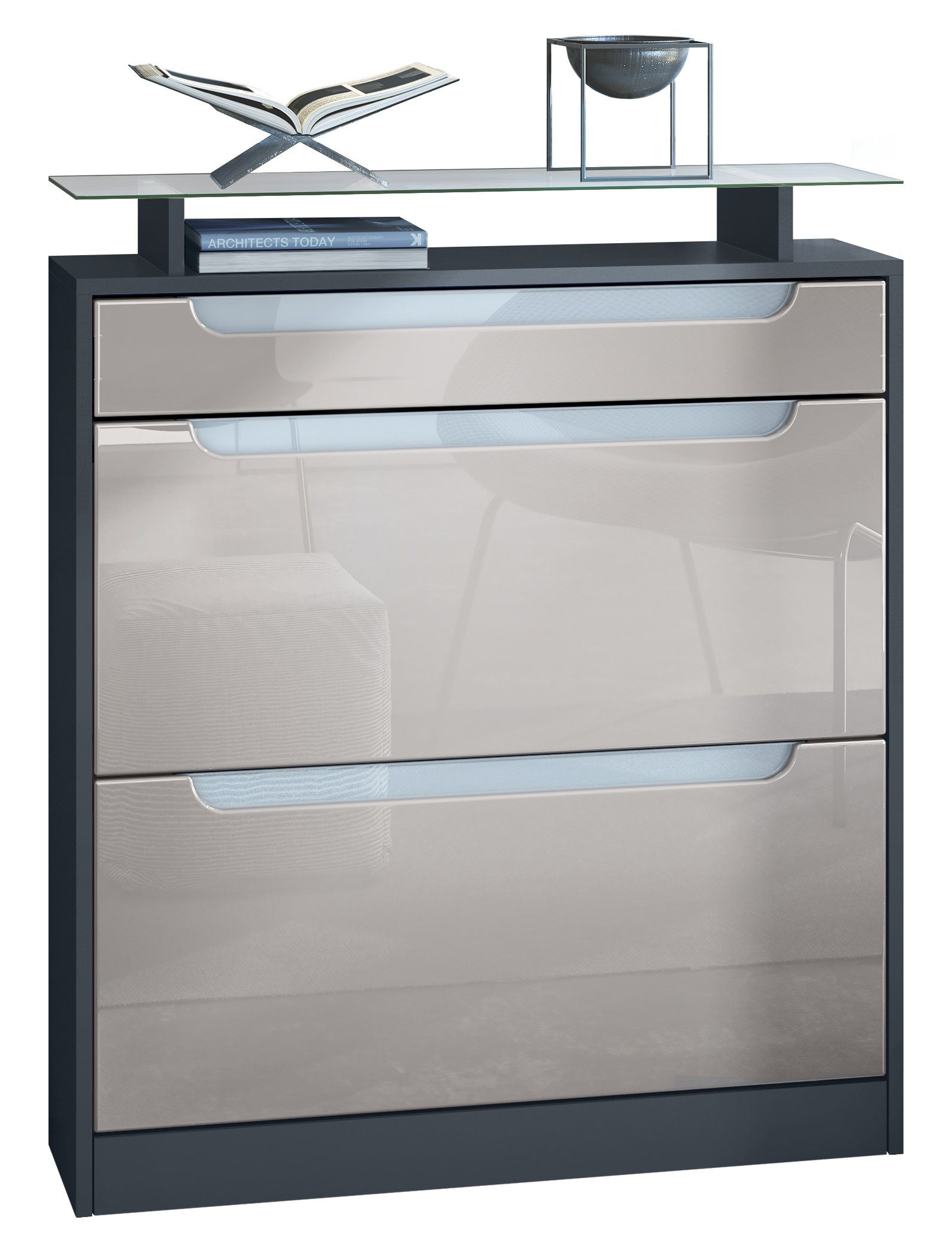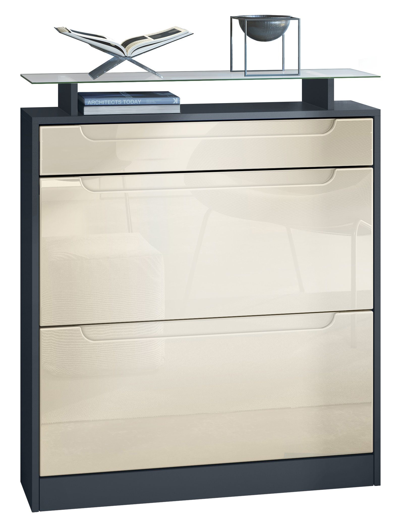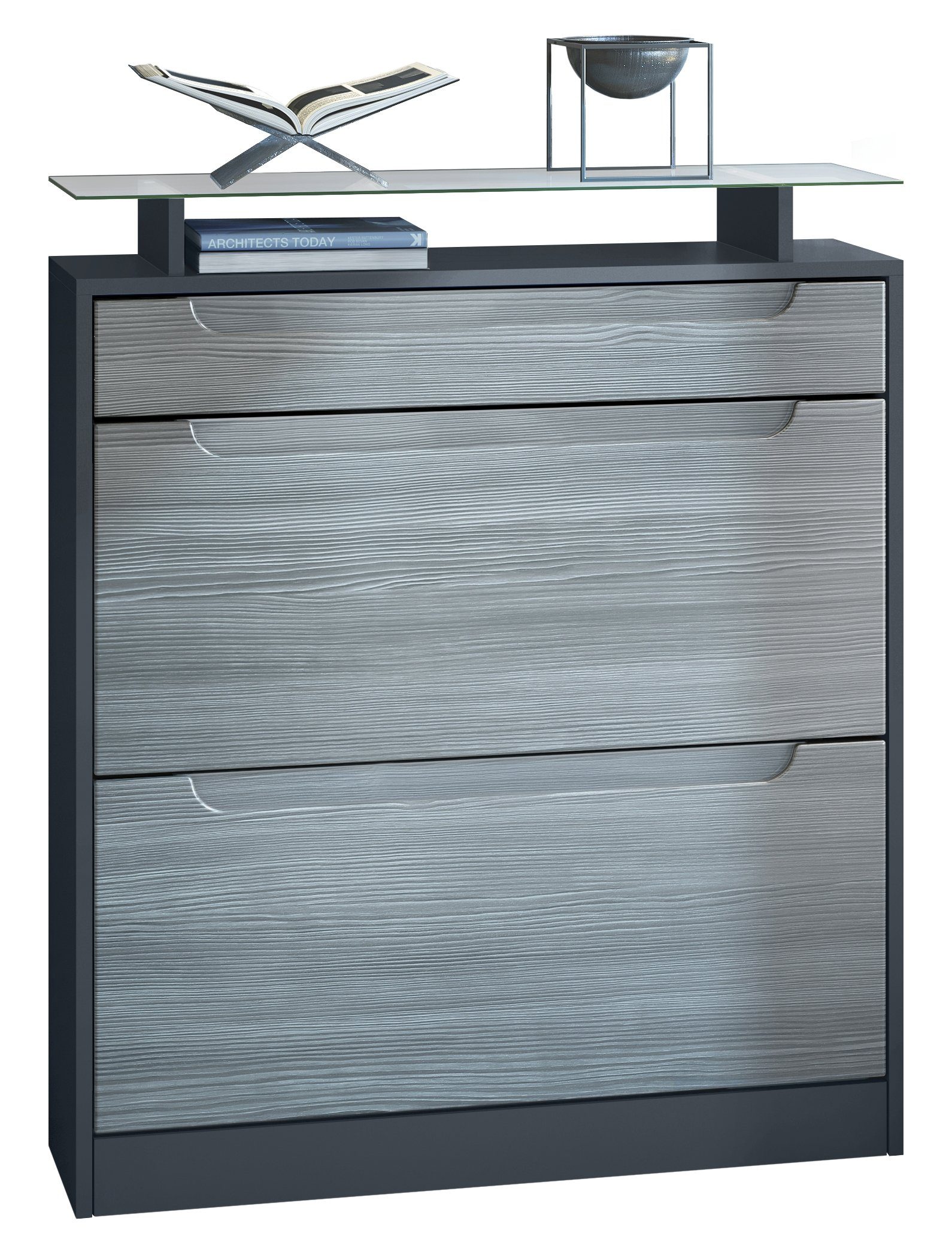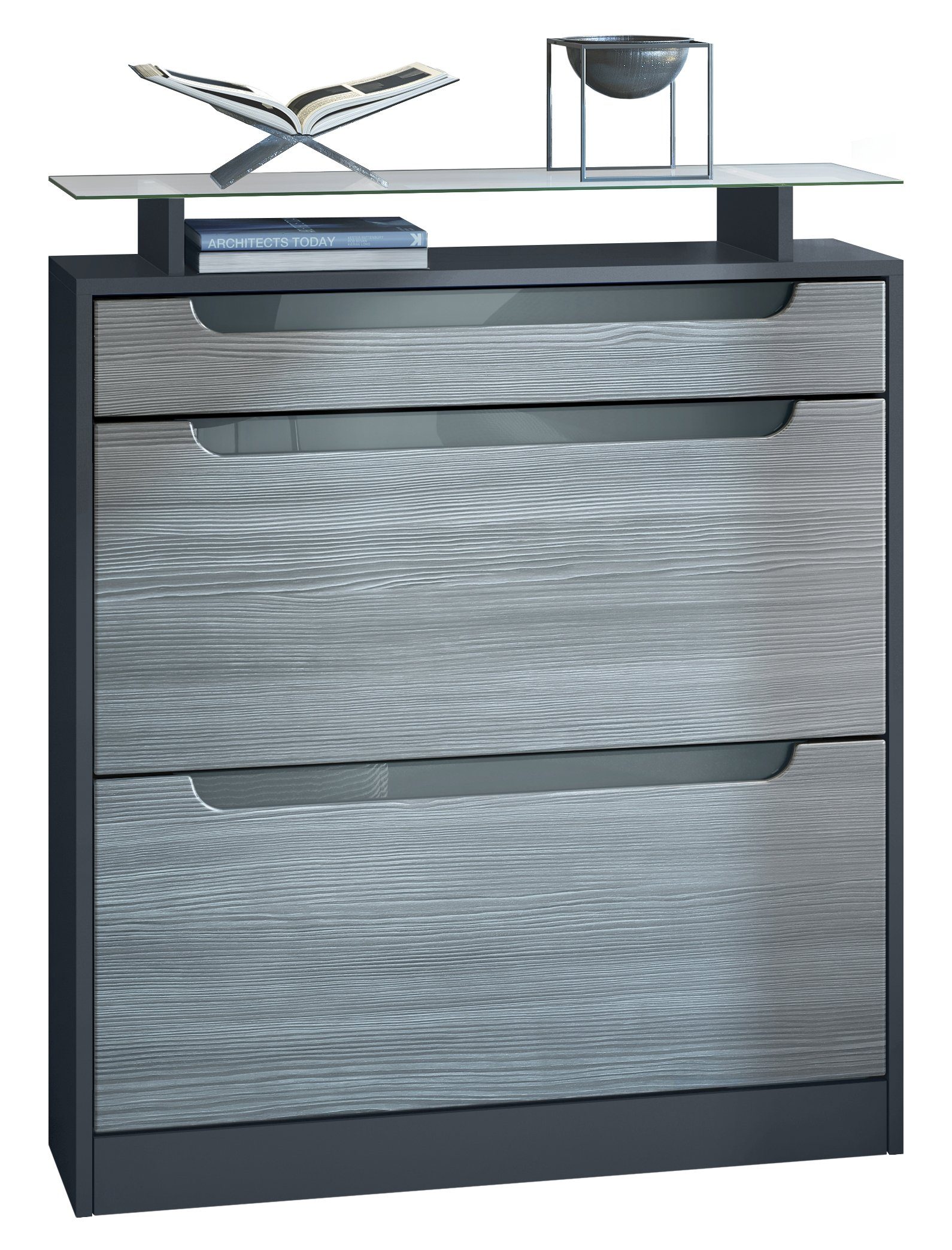 Der geräumige Standschuhschrank Fiesta präsentiert sich als praktisches Möbelstück mit modernem Design für die Diele, hergestellt in Deutschland. Das schmale Schuhregal ist mit zwei doppelreihigen Schuhkippern und mit einer leichtgängigen Schublade ausgerüstet. Diese verläuft dank Laufschienen aus Metall nahezu geräuschlos und sorgt für eine leichte Handhabung. Der Schuhorganizer ist mit praktischen Griffmulden ausgestattet und fügt sich durch die grifflose Optik schlicht in Ihren Flur ein. Zusätzlich gibt es eine aufgesetzte Glasablage für den Schuhschrank mit Schublade. Der Glasaufsatz bietet weitere Ablagefläche und lädt zum Dekorieren ein. Mit den inkludierten Beschlägen fixieren Sie das Standschuhregal, für zusätzliche Sicherheit, an der Wand. Eine Rückwand ist nicht enthalten.