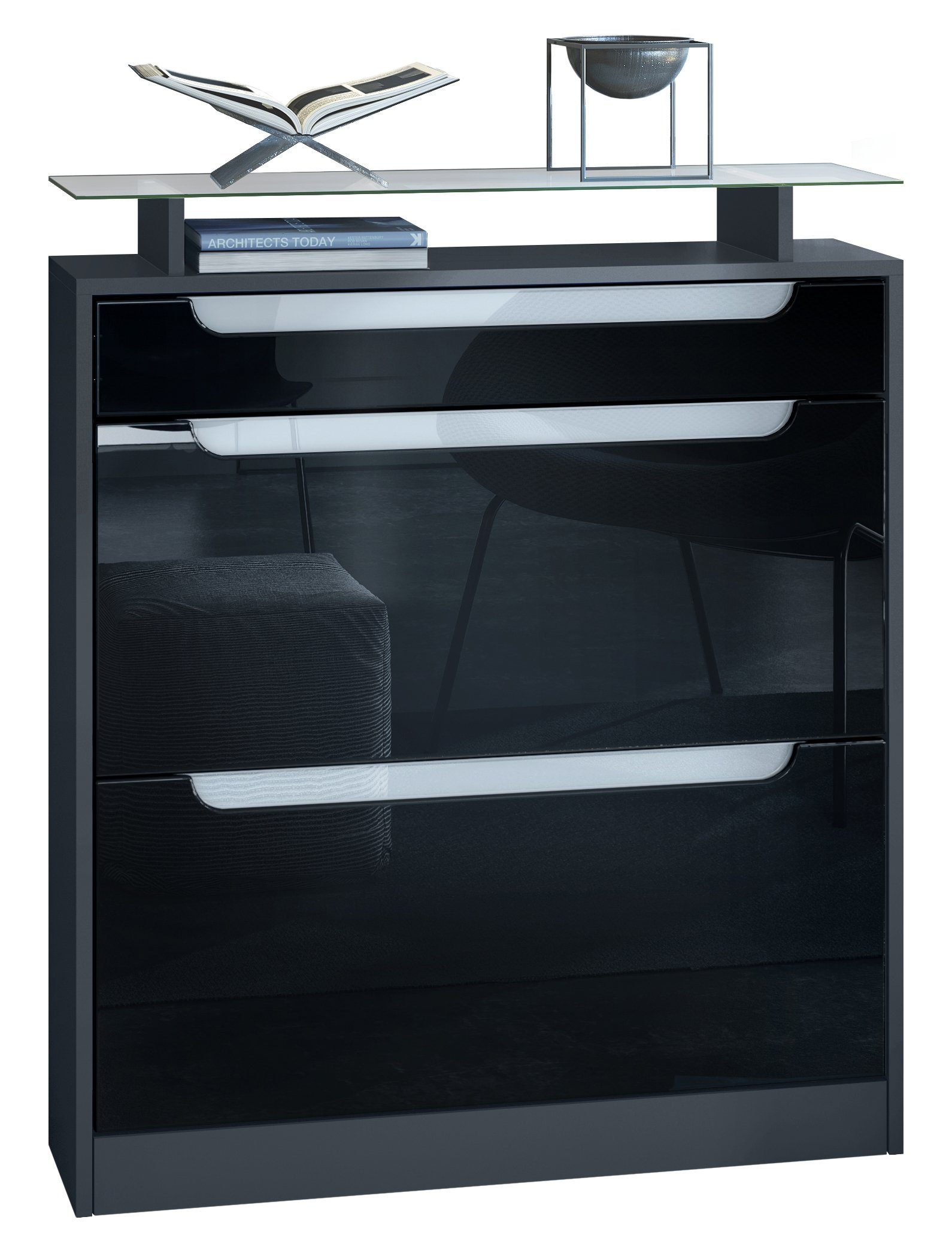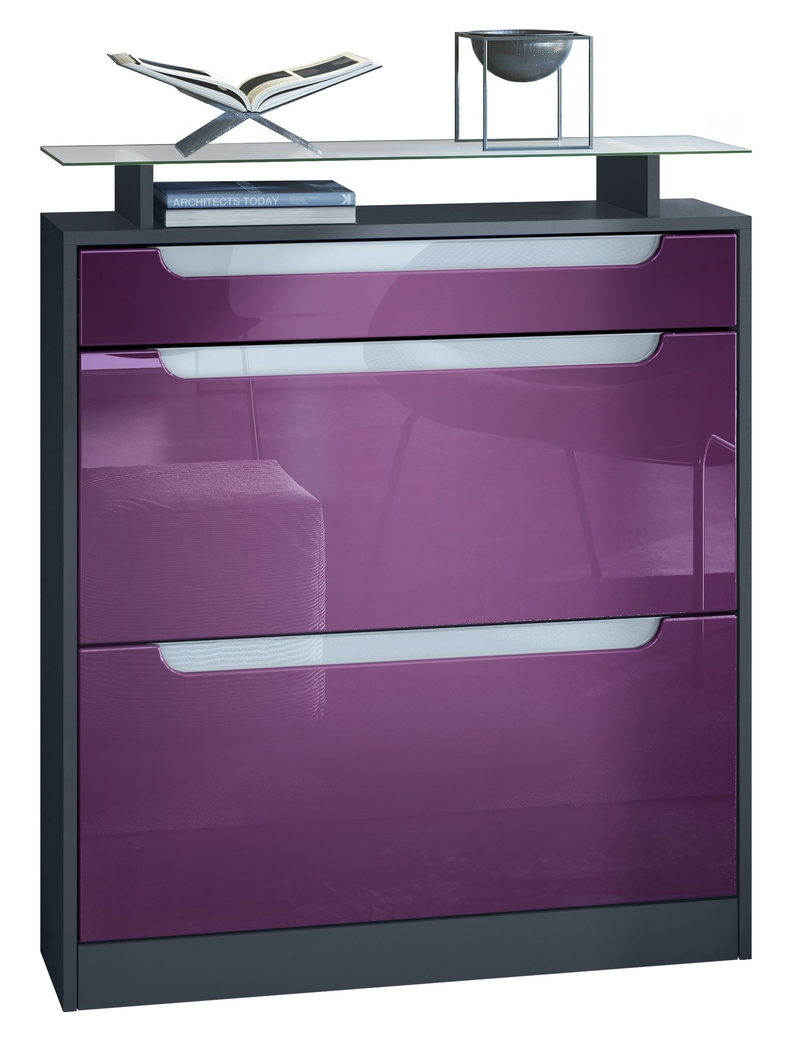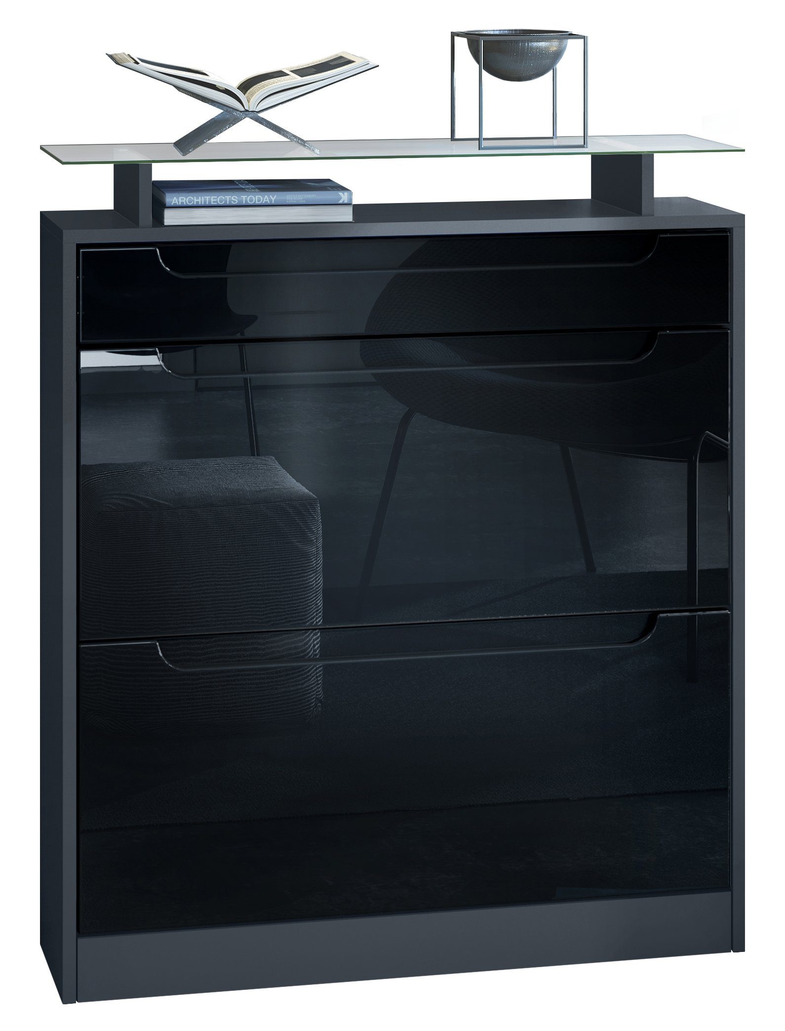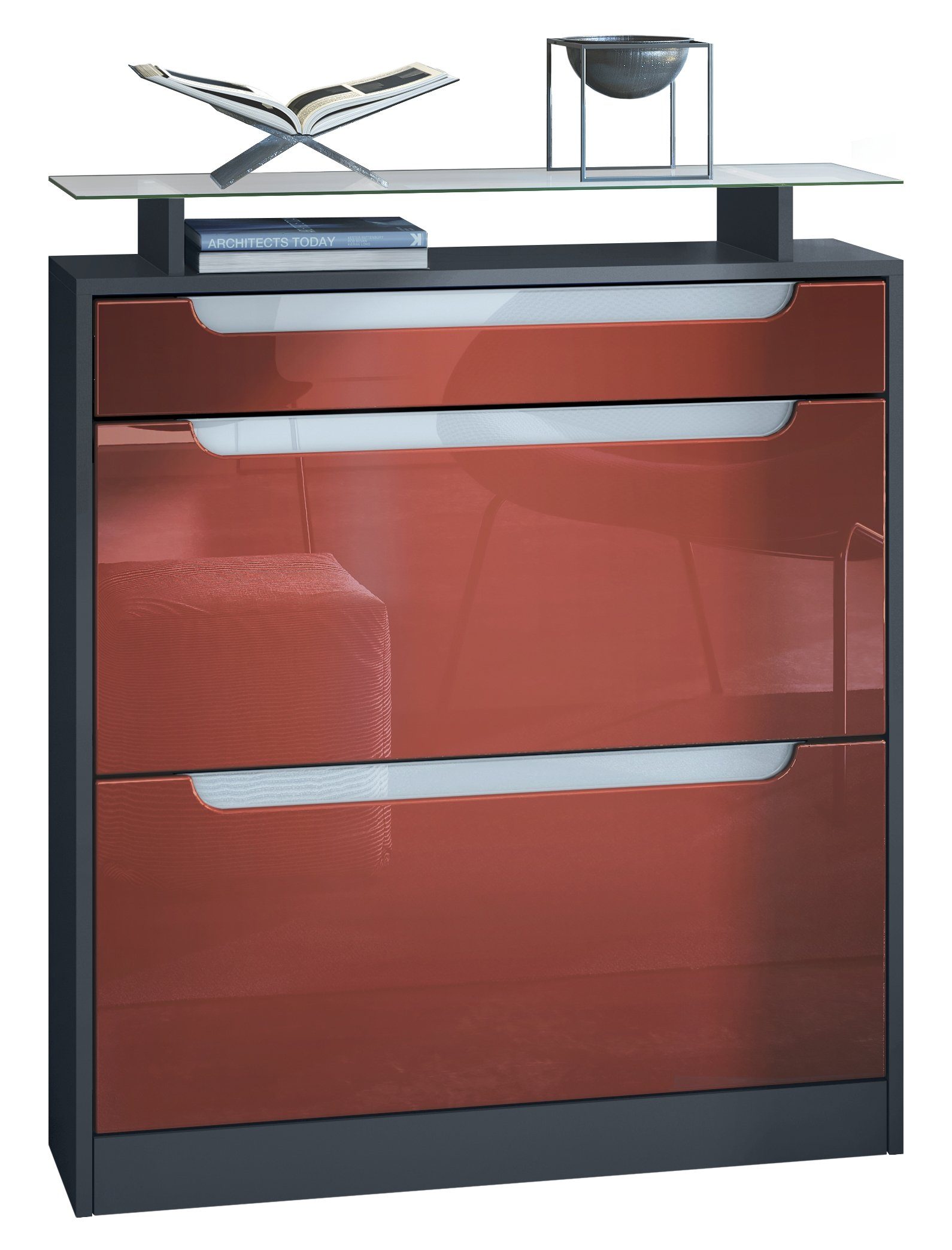 Der geräumige Standschuhschrank Fiesta präsentiert sich als praktisches Möbelstück mit modernem Design für die Diele, hergestellt in Deutschland. Das schmale Schuhregal ist mit zwei doppelreihigen Schuhkippern und mit einer leichtgängigen Schublade ausgerüstet. Diese verläuft dank Laufschienen aus Metall nahezu geräuschlos und sorgt für eine leichte Handhabung. Der Schuhorganizer ist mit praktischen Griffmulden ausgestattet und fügt sich durch die grifflose Optik schlicht in Ihren Flur ein. Zusätzlich gibt es eine aufgesetzte Glasablage für den Schuhschrank mit Schublade. Der Glasaufsatz bietet weitere Ablagefläche und lädt zum Dekorieren ein. Mit den inkludierten Beschlägen fixieren Sie das Standschuhregal, für zusätzliche Sicherheit, an der Wand. Eine Rückwand ist nicht enthalten.