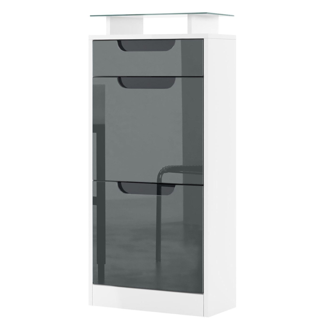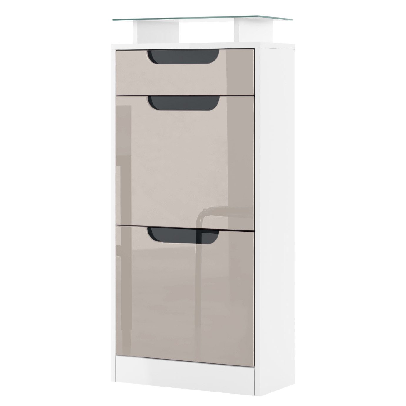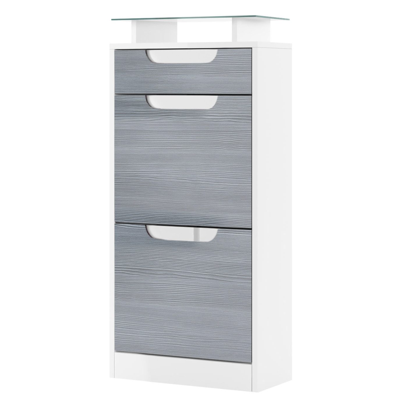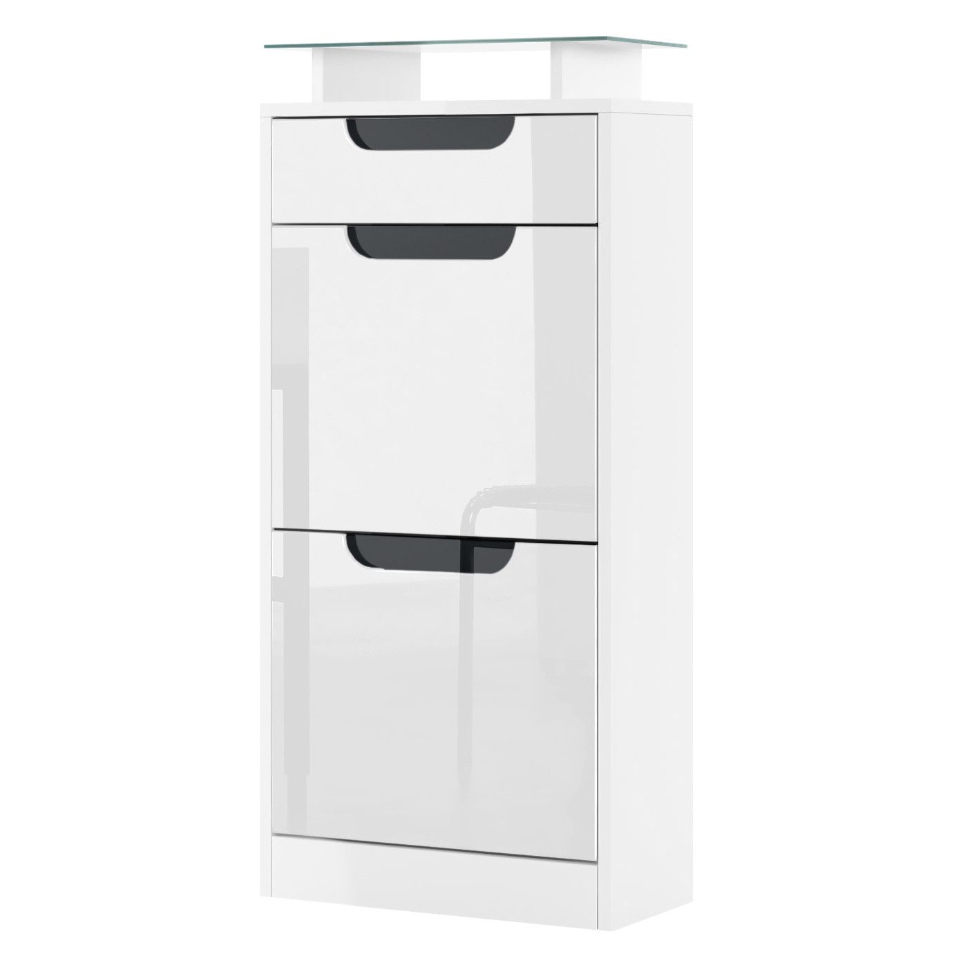 Der Schuhschrank verfügt über zwei Kippvorrichtungen, die je nach Form und Размер bis zu 8 Paar Schuhe sicher verstauen können. Ein zusätzlicher Schubkasten bietet Platz für die kleinen Dinge des täglichen Lebens. Die reizvolle Glasablage dient als perfekte Ablagefläche für Telefon, Schlüssel und andere wichtige Utensilien. Die eleganten Griffleisten setzen stilvolle Akzente und schaffen einen harmonischen Kontrast zum matten, melamin-beschichteten Korpus in trendigem Weiß.