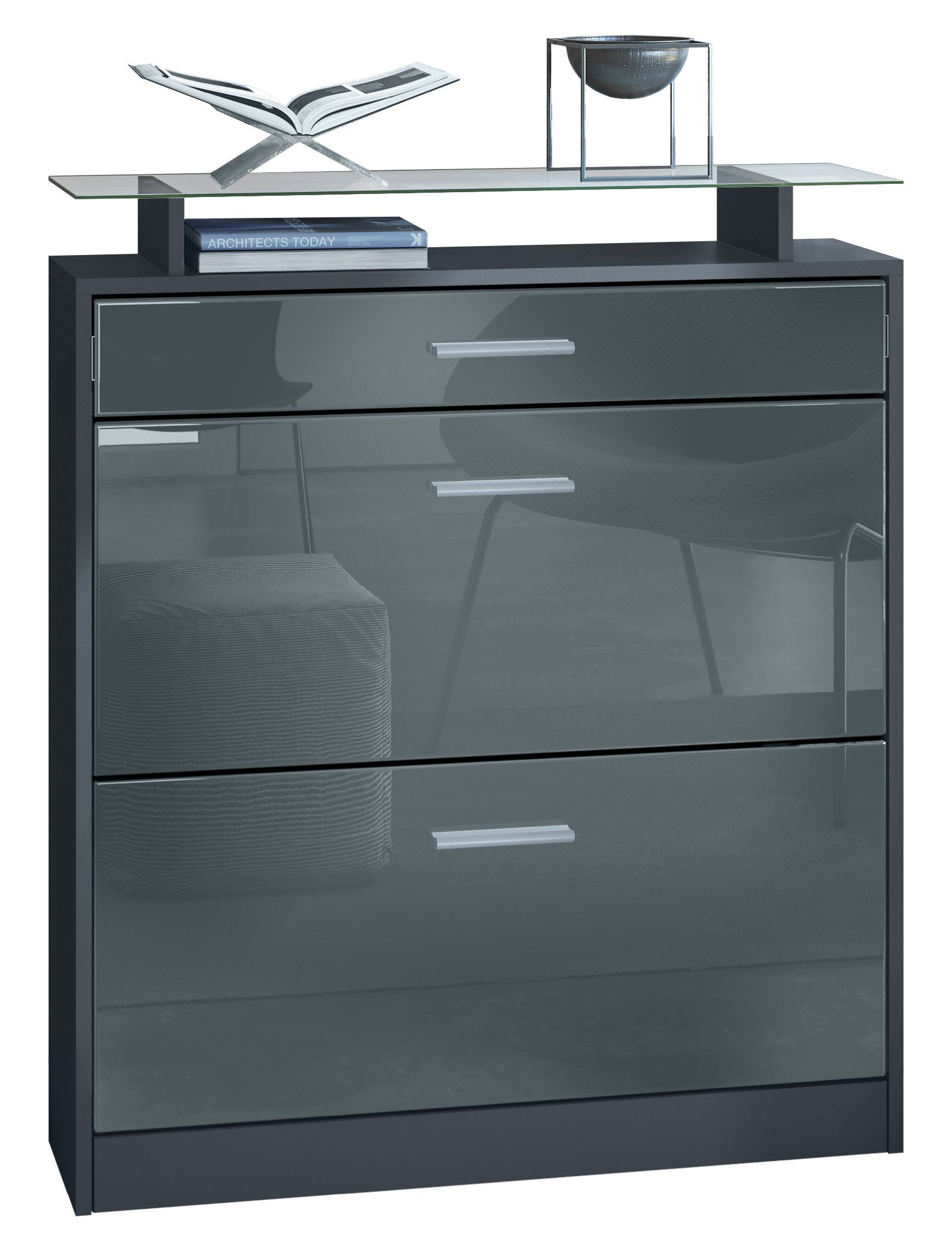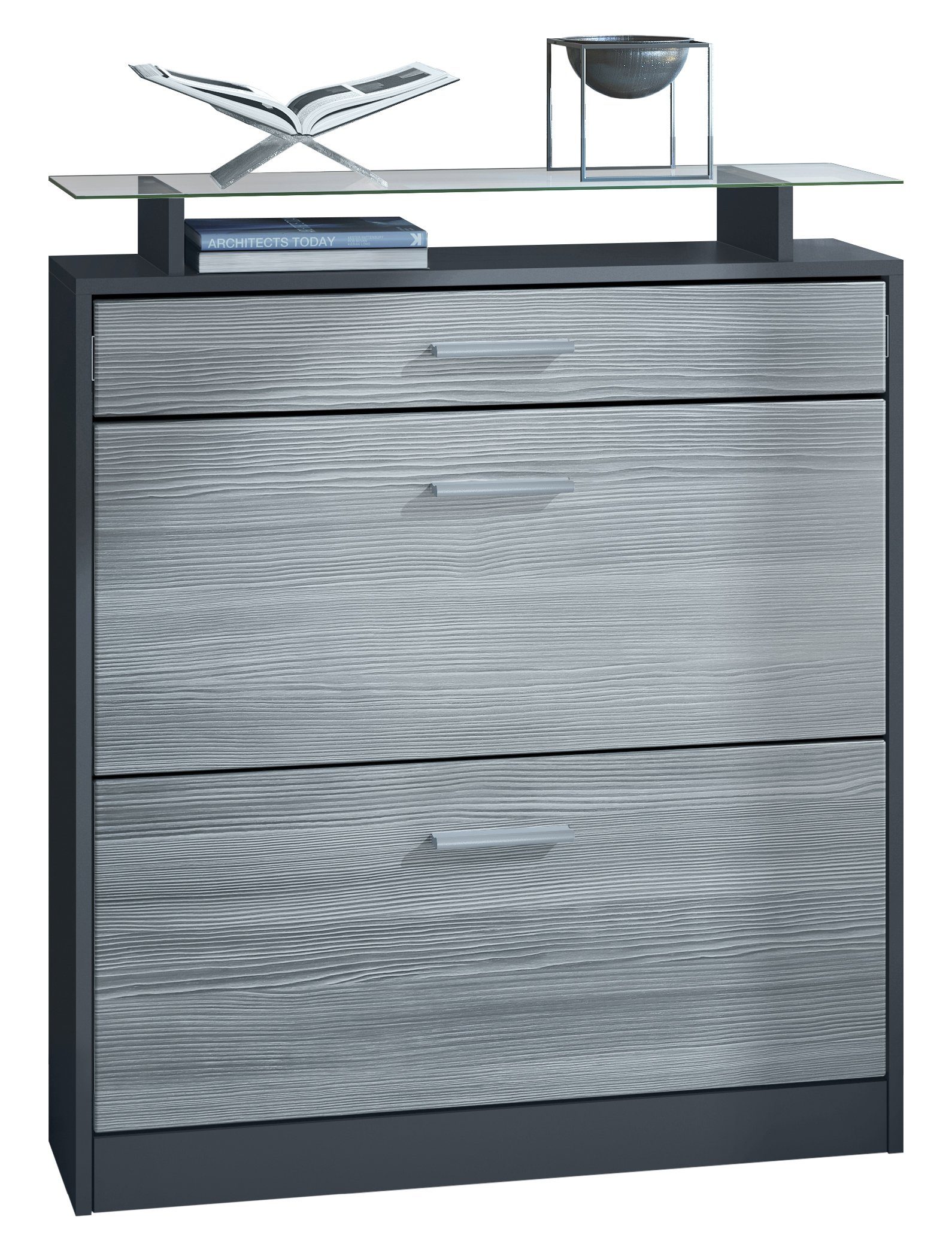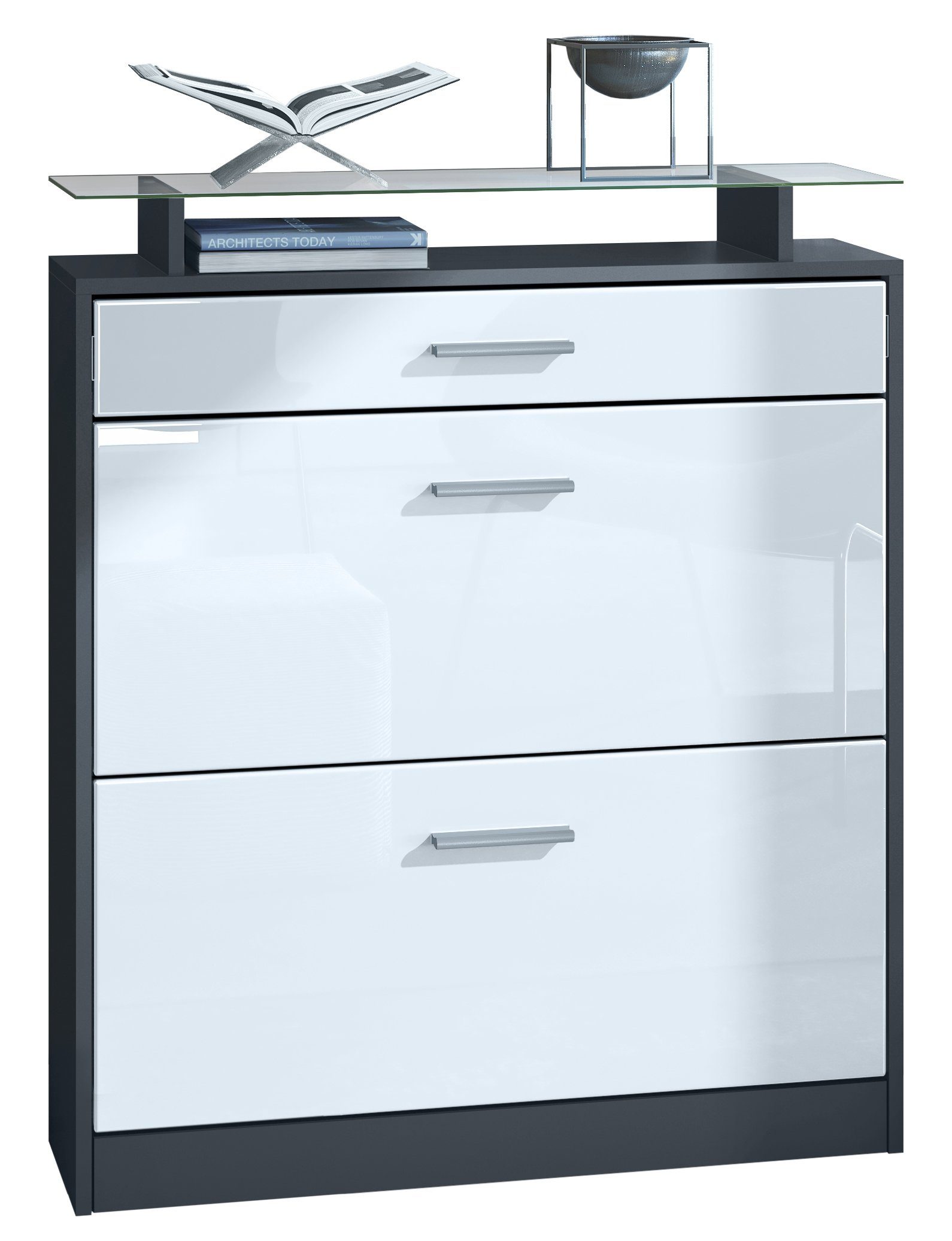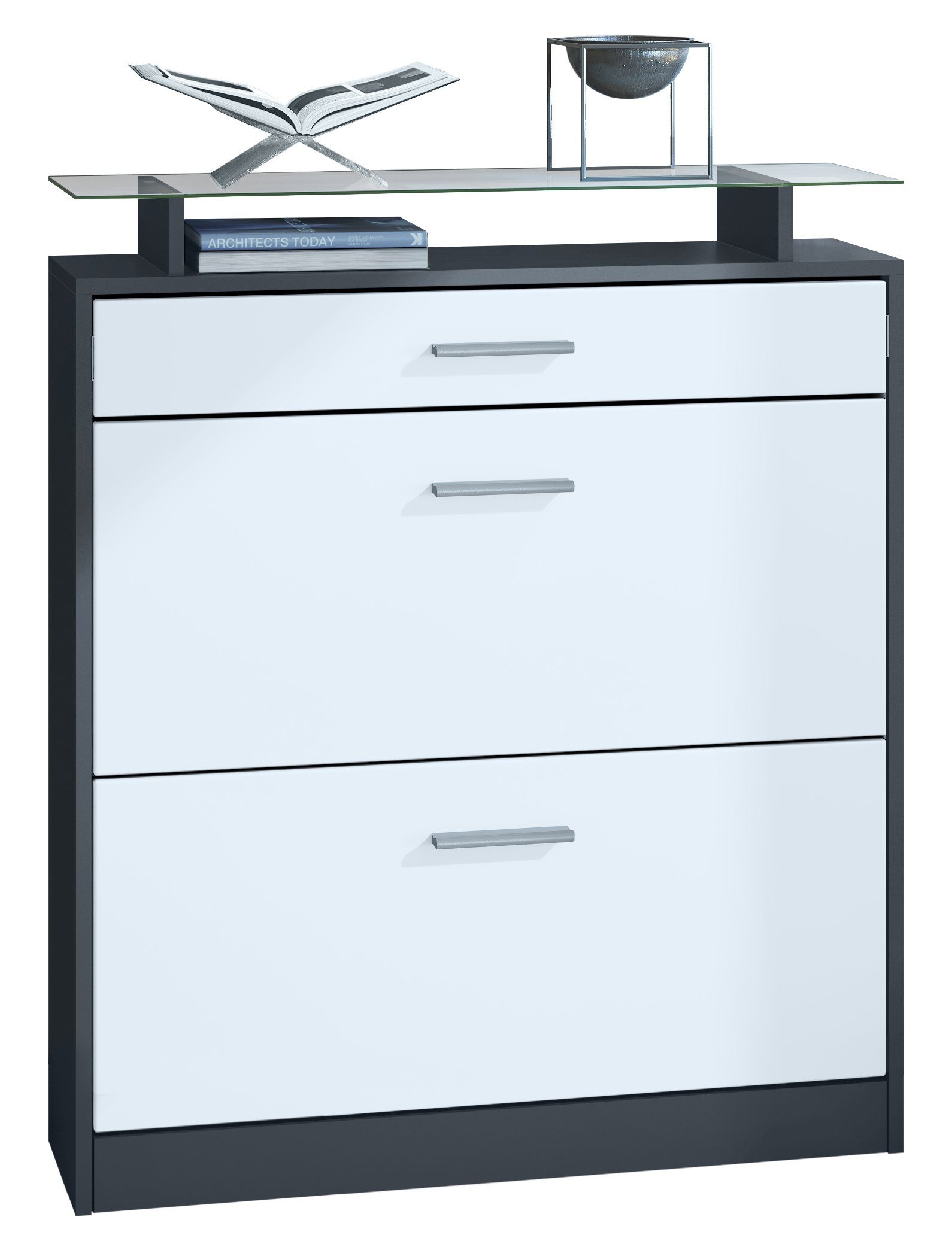 Das geräumige Schuhschregal Loret präsentiert sich als praktisches Möbelstück mit modernem Design für die Diele, hergestellt in Deutschland. Der schmale Schuhschrank ist mit zwei Schuhkippern mit doppelten Schuhhalterungen und mit einer leichtgängigen Schublade ausgerüstet. Diese verläuft dank Laufschienen aus Metall nahezu geräuschlos und sorgt für eine leichte Handhabung. Der Schuhorganizer ist mit dezenten, silbernen Griffen ausgestattet. Zusätzlich gibt es eine aufgesetzte Glasablage für den Schuhschrank. Der Glasaufsatz bietet weitere Ablagefläche und lädt zum Dekorieren ein. Mit den inkludierten Beschlägen fixieren Sie das Schuhregal für zusätzliche Sicherheit an der Wand. Eine Rückwand ist nicht enthalten.