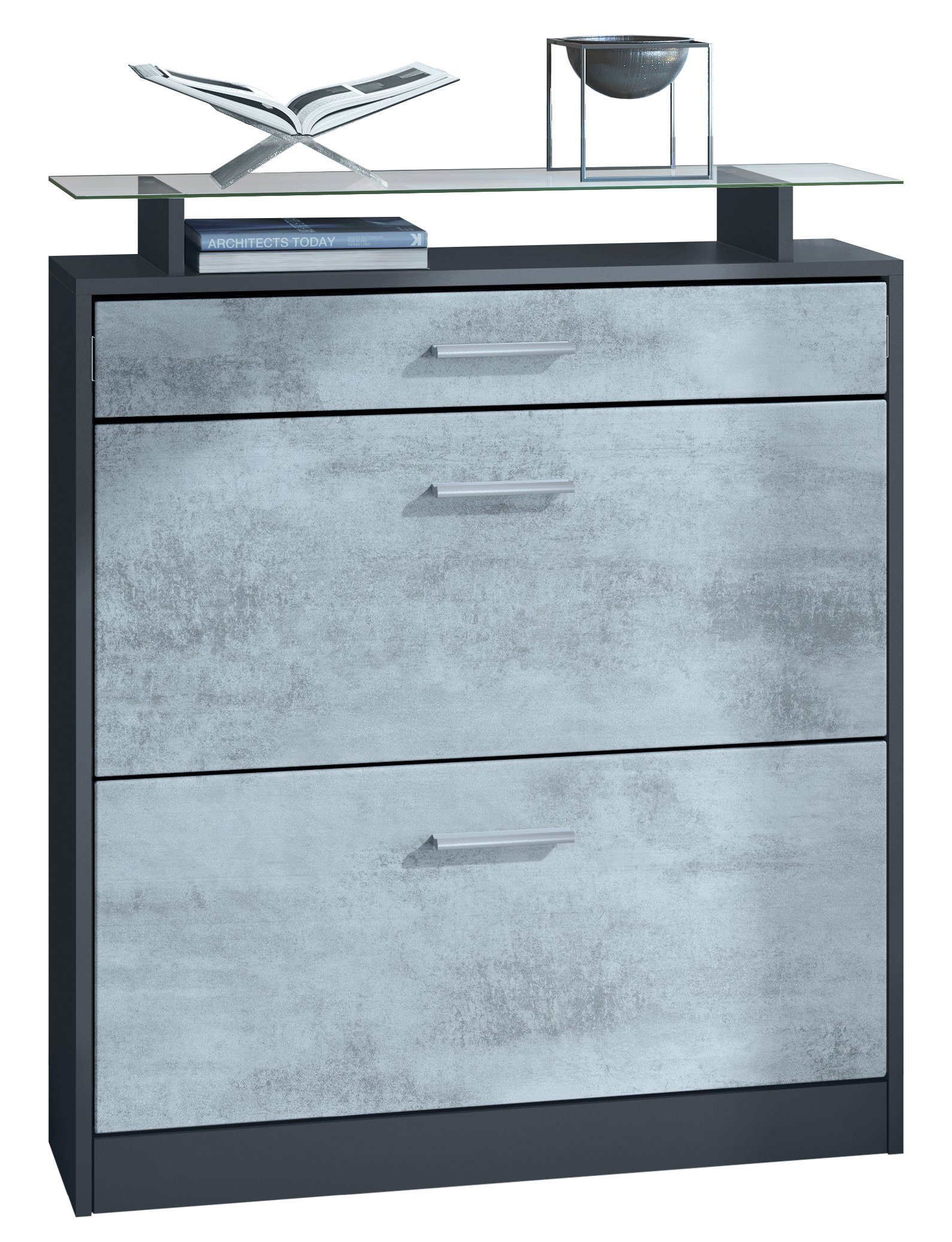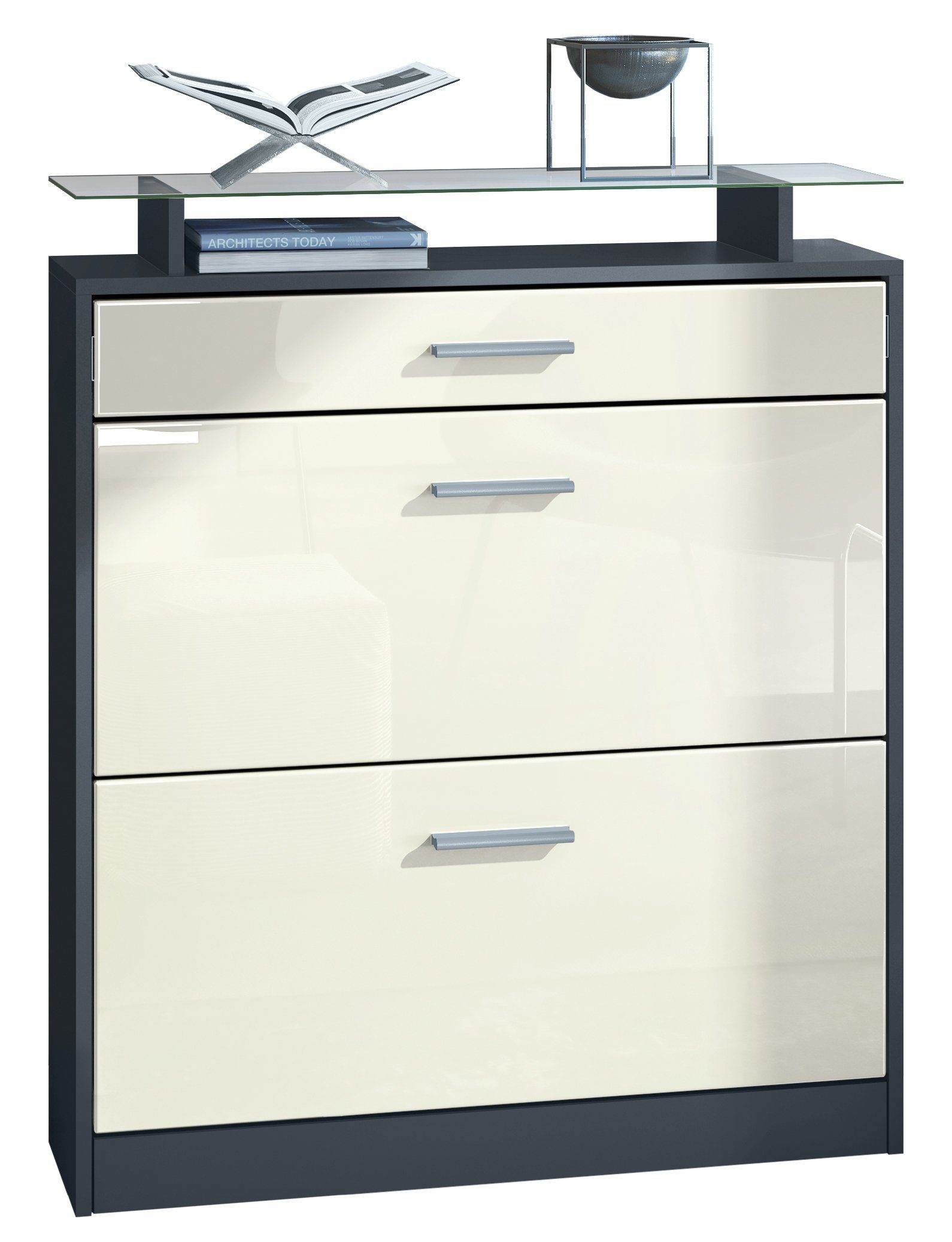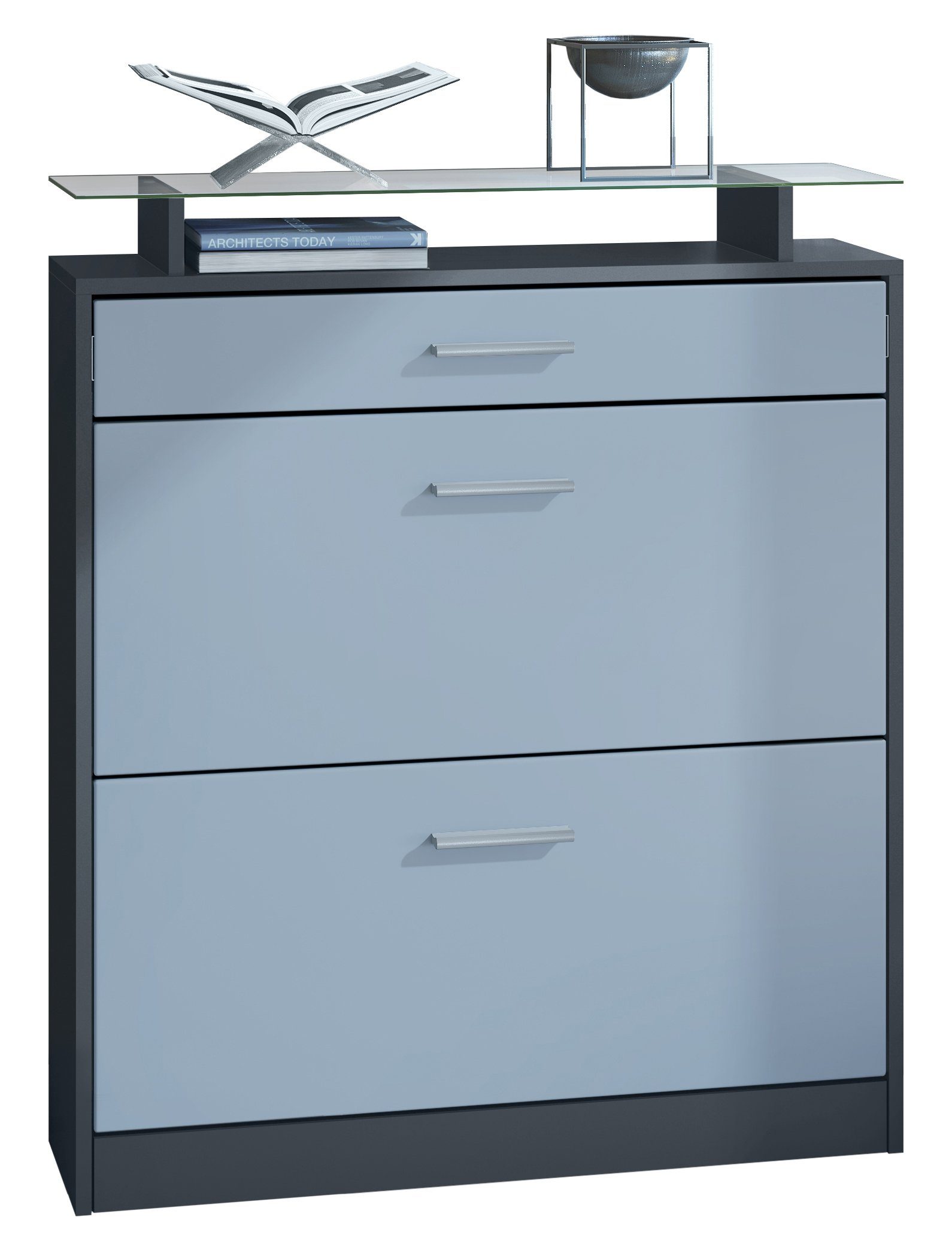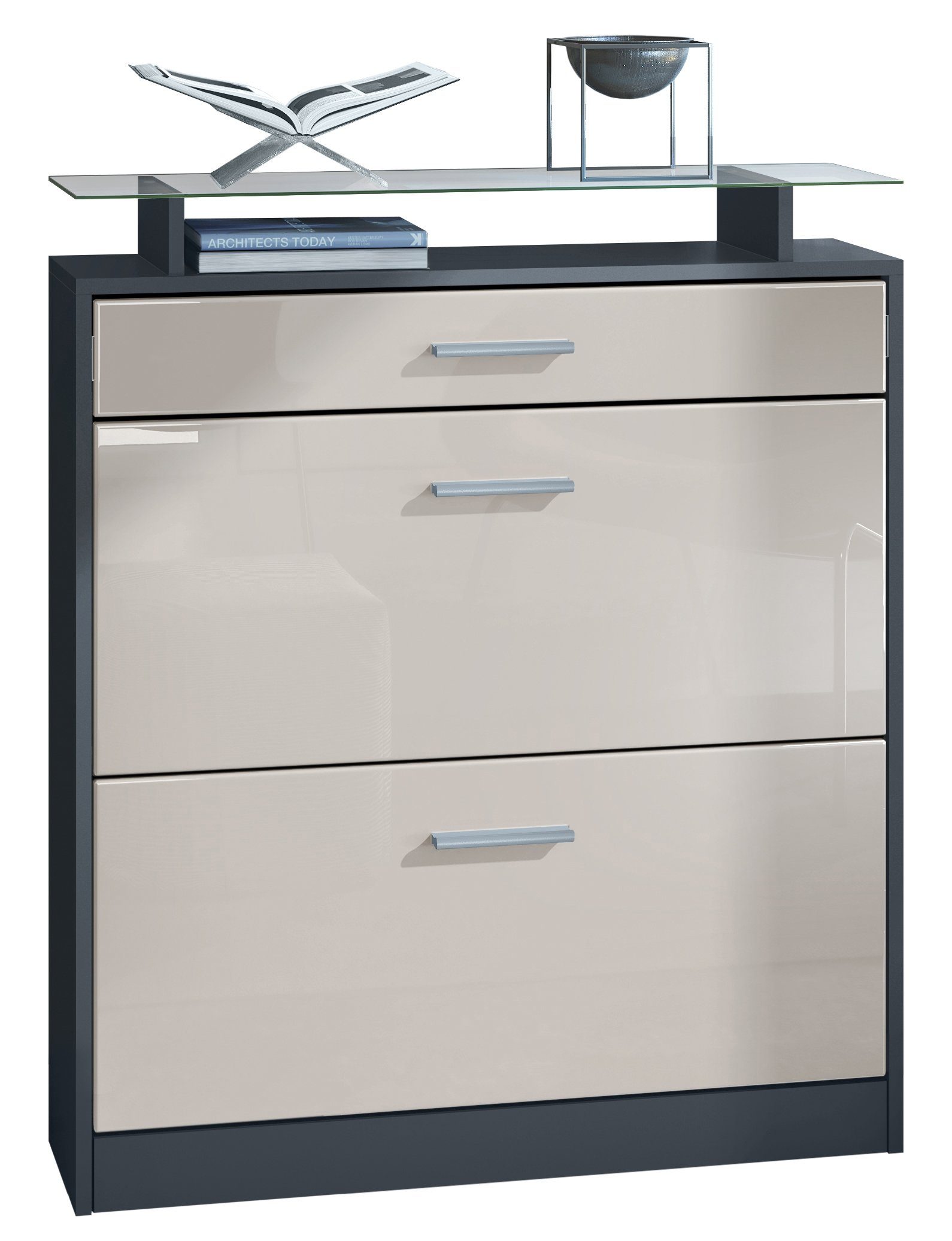Das geräumige Schuhschregal Loret präsentiert sich als praktisches Möbelstück mit modernem Design für die Diele, hergestellt in Deutschland. Der schmale Schuhschrank ist mit zwei Schuhkippern mit doppelten Schuhhalterungen und mit einer leichtgängigen Schublade ausgerüstet. Diese verläuft dank Laufschienen aus Metall nahezu geräuschlos und sorgt für eine leichte Handhabung. Der Schuhorganizer ist mit dezenten, silbernen Griffen ausgestattet. Zusätzlich gibt es eine aufgesetzte Glasablage für den Schuhschrank. Der Glasaufsatz bietet weitere Ablagefläche und lädt zum Dekorieren ein. Mit den inkludierten Beschlägen fixieren Sie das Schuhregal für zusätzliche Sicherheit an der Wand. Eine Rückwand ist nicht enthalten.