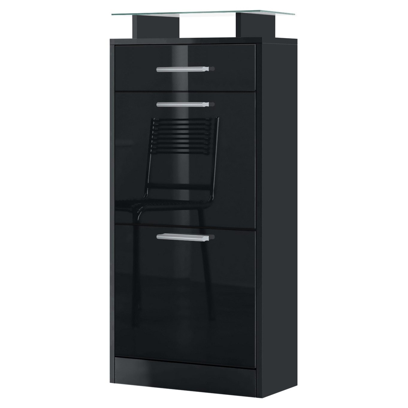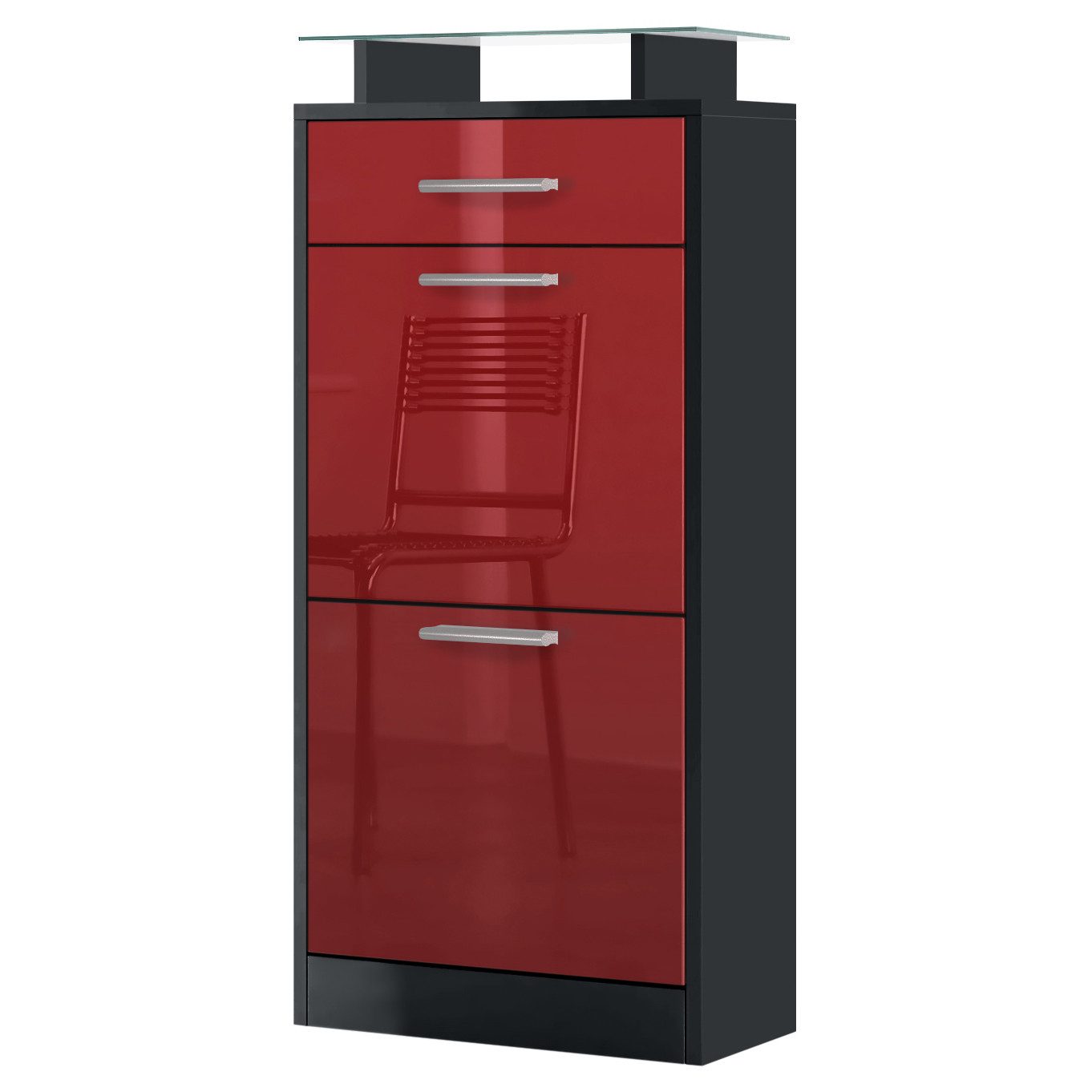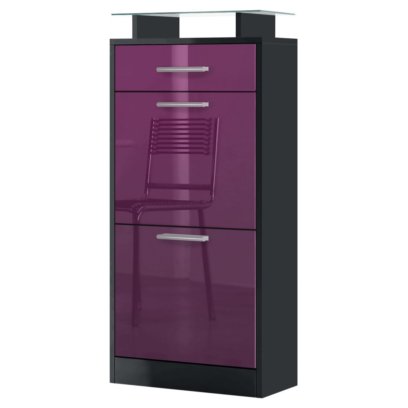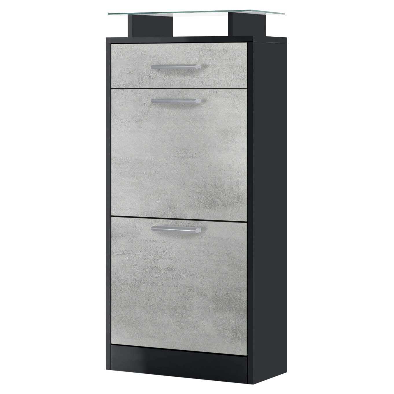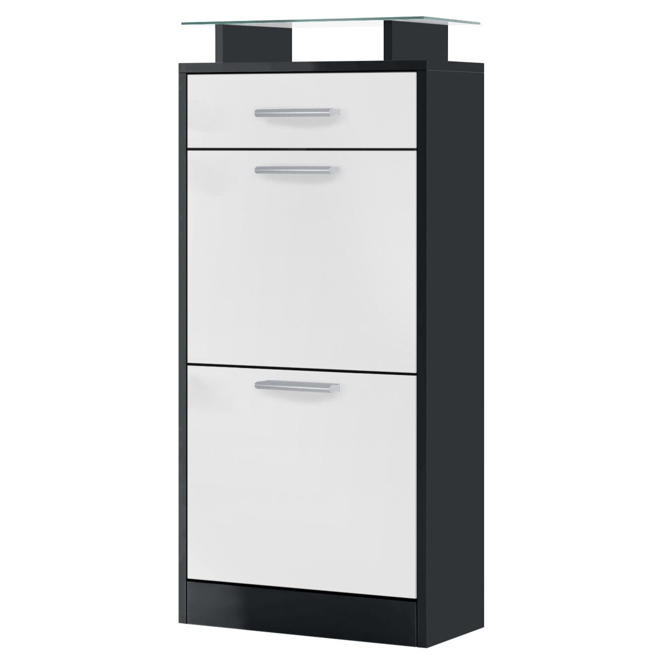 Der geräumige Schuhschrank Loret V2 präsentiert sich als praktisches Möbelstück mit modernem Design für die Diele, hergestellt in Deutschland. Das schmale Schuhregal ist mit 2 Schuhkippern mit doppelten Schuhhalterungen und mit einer leichtgängigen Schublade ausgerüstet. Diese verläuft dank Laufschienen aus Metall nahezu geräuschlos und sorgt für eine leichte Handhabung. Der Schuhorganizer ist mit dezenten, silbernen Griffen ausgestattet. Zusätzlich gibt es eine aufgesetzte Glasablage für das Schuhregal. Der Glasaufsatz bietet weitere Ablagefläche und lädt zum Dekorieren ein. Mit den inkludierten Beschlägen fixieren Sie das Schuhregal an der Wand und sichern ihr Möbelstück zusätzlich ab. Eine Rückwand ist nicht enthalten.