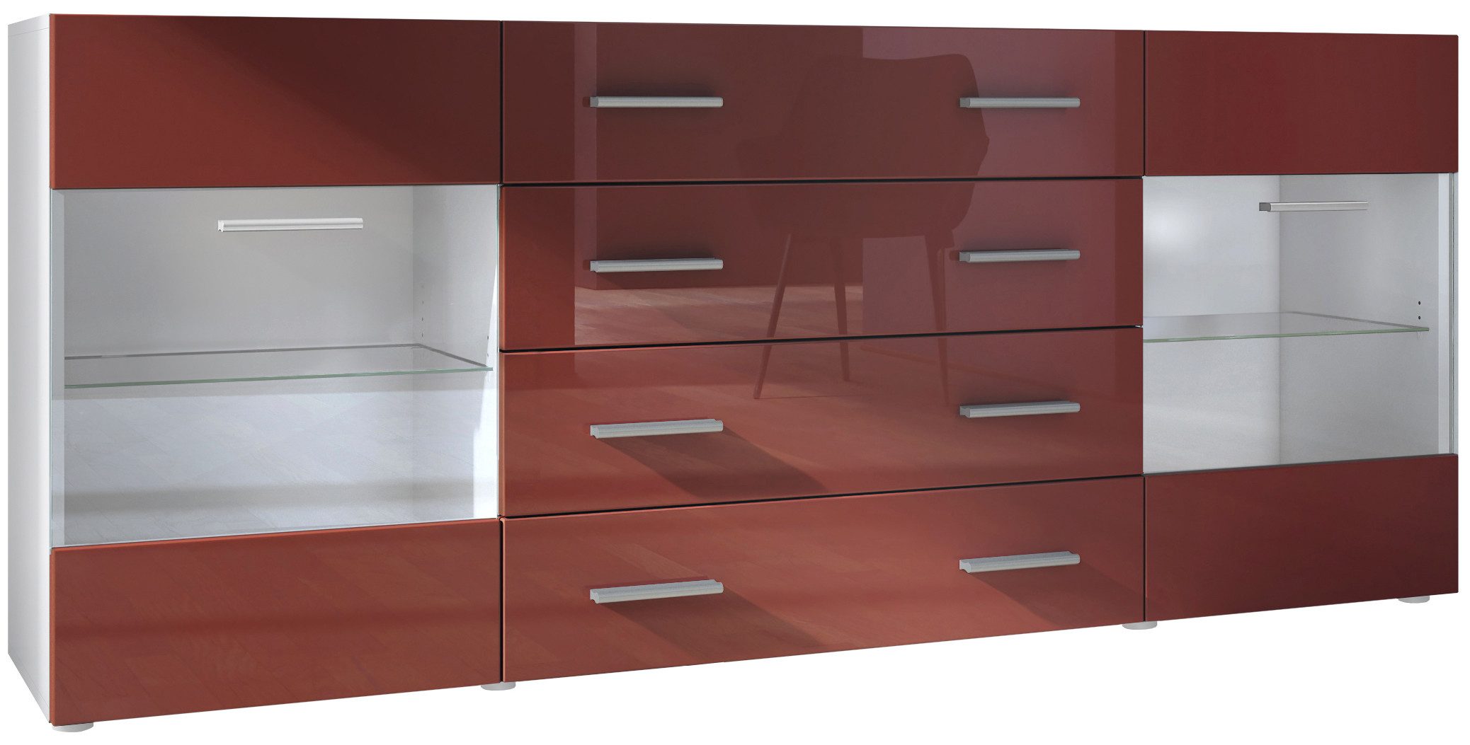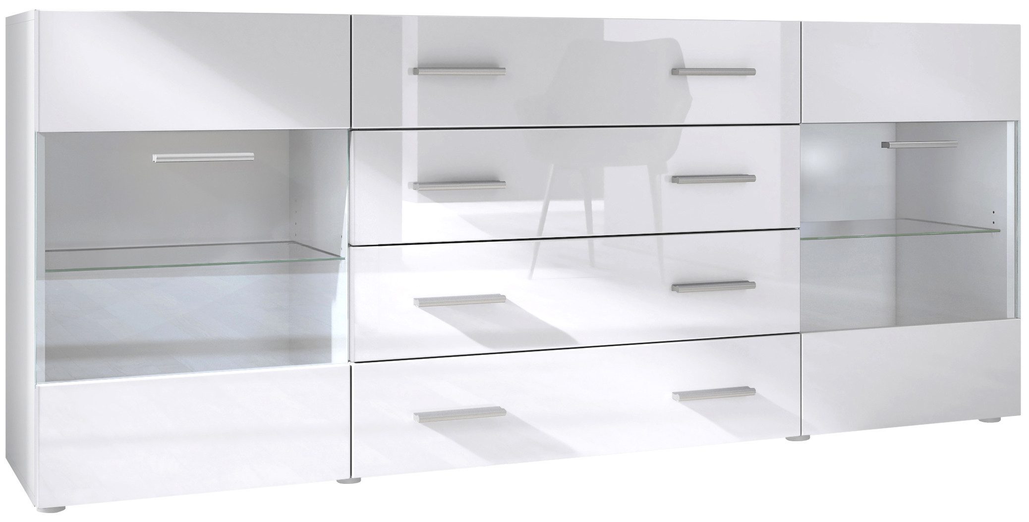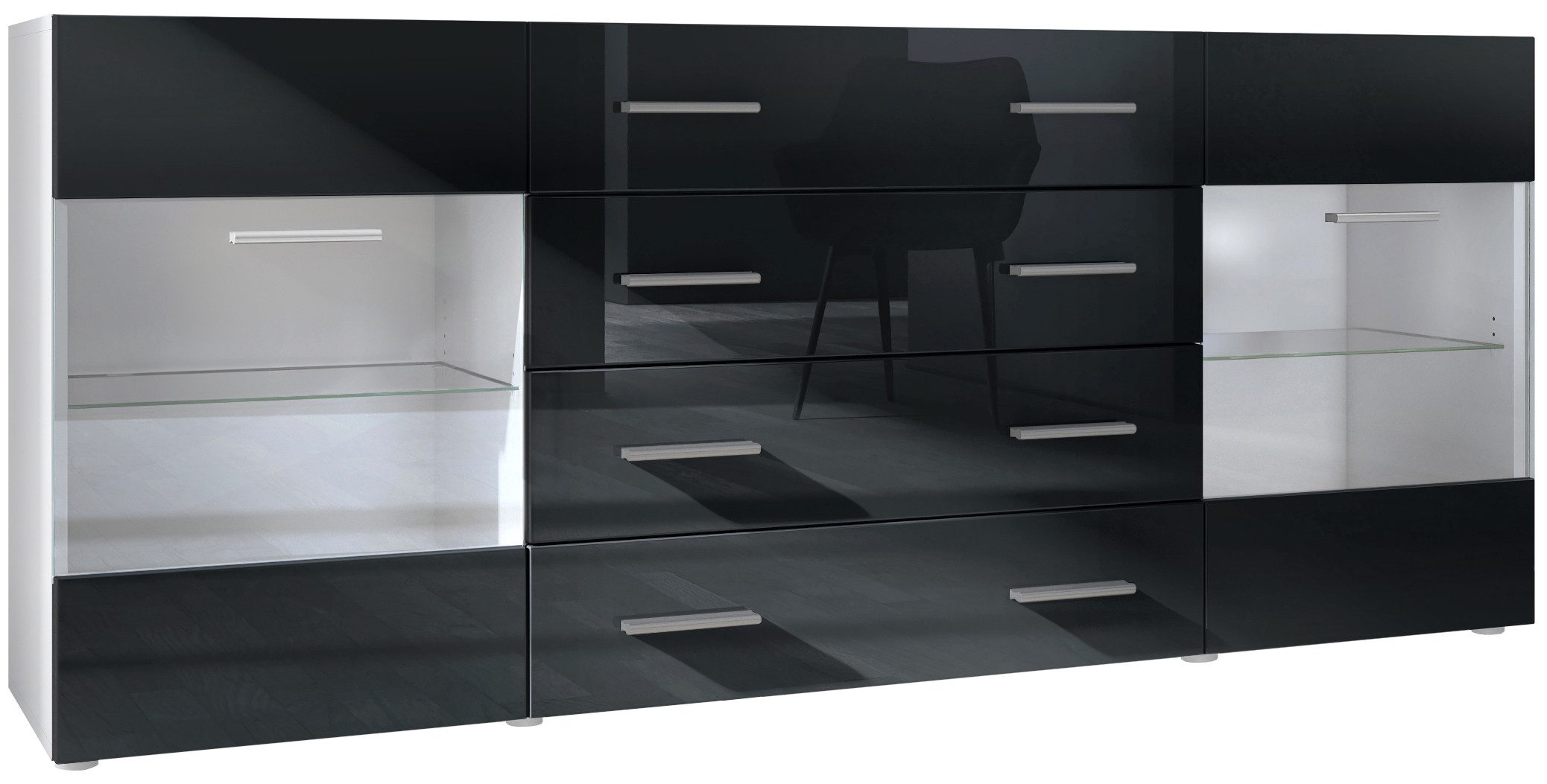Silberfarbene Kunststoffgriffe fügen sich harmonisch ins Design ein. Der stabile Korpus aus melaminbeschichteter Spanplatte und die hochwertigen MDF-Fronten garantieren Langlebigkeit, Pflegeleichtigkeit und einen dauerhaft glänzenden Look.
