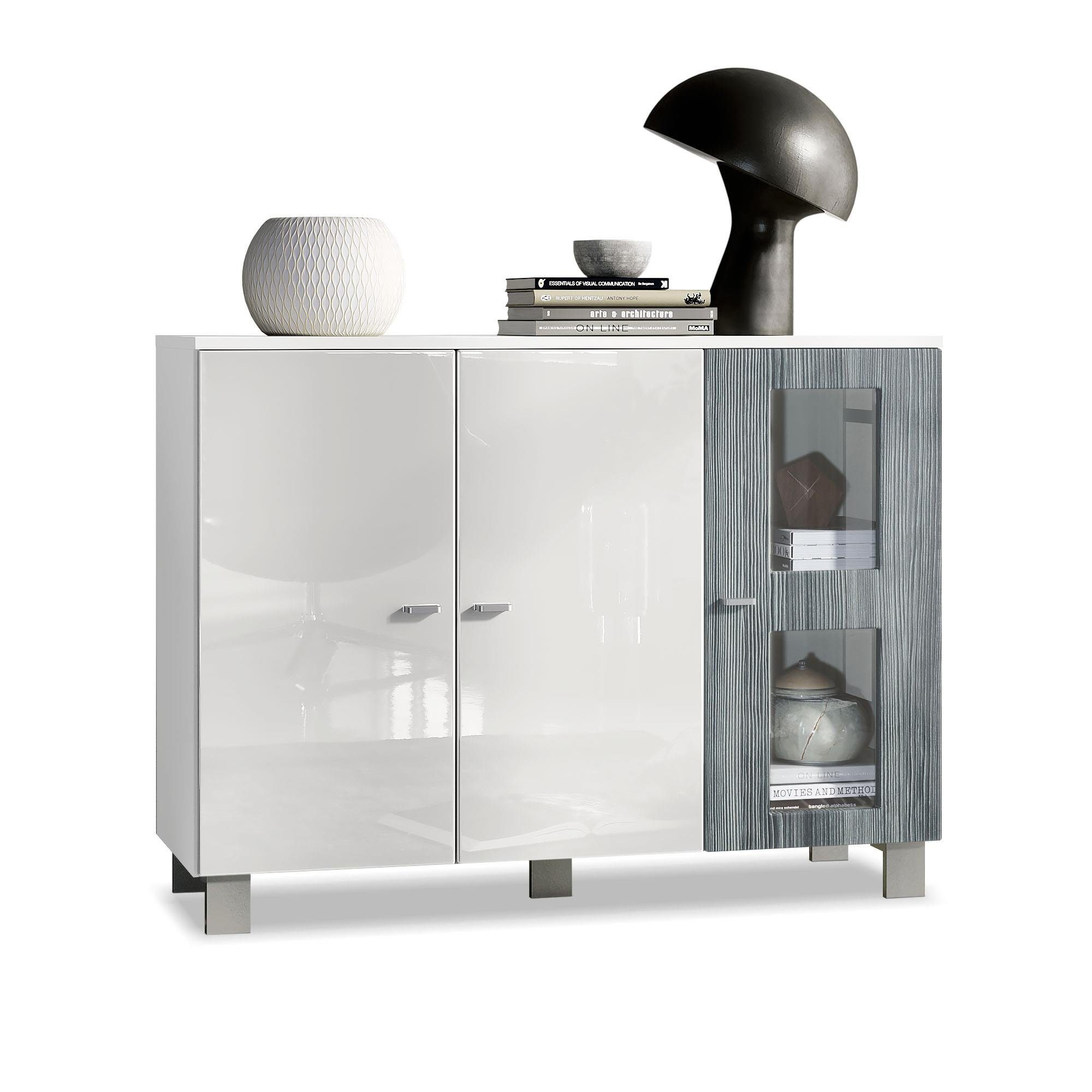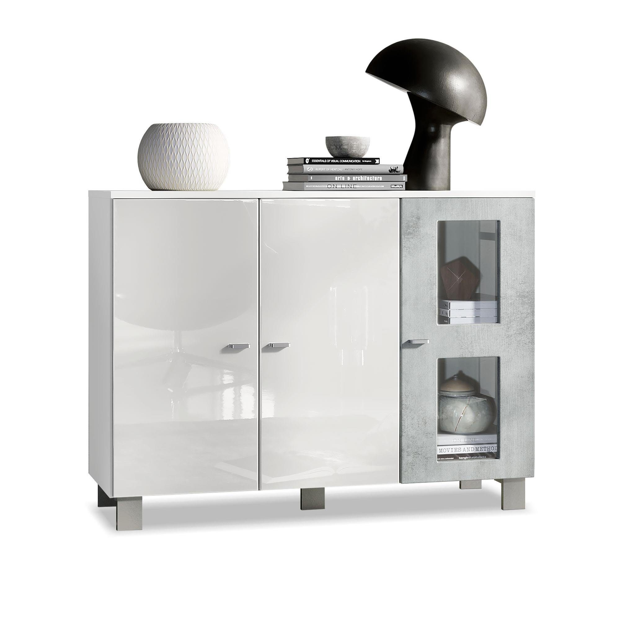 Ob als modernes Sideboard im Wohnzimmer, Kommodenschrank für's Schlafzimmer, Anrichte im Flur oder als Kommode im Kinderzimmer - die geräumige Kommode Denjo präsentiert sich als praktisches Möbelstück mit modernem Design, hergestellt in Deutschland. Der Beistellschrank steht auf fünf Füßen in matter Aluminiumoptik und ist mit drei großen Türen ausgerüstet. Hinter den beiden Türen auf der linken Seite befinden sich zwei geräumige Fächer mit einem Einlegeboden. Hinter der rechten Tür mit Glasfenster befinden sich weitere zwei Fächer mit einem Einlegeboden. Die Türen sind mit dezenten, silbernen Griffen und unserem Soft-Close-Mechanismus ausgestattet. Optional können Sie der Vladon Kommode mit einer LED-Beleuchtung das gewisse Etwas verleihen. Diese besteht aus zwei Unterbaustrahlern in weiß mit Fußschalter. Eine Rückwand in Holzoptik aus Hartfaserplatten ist im Lieferumfang enthalten.