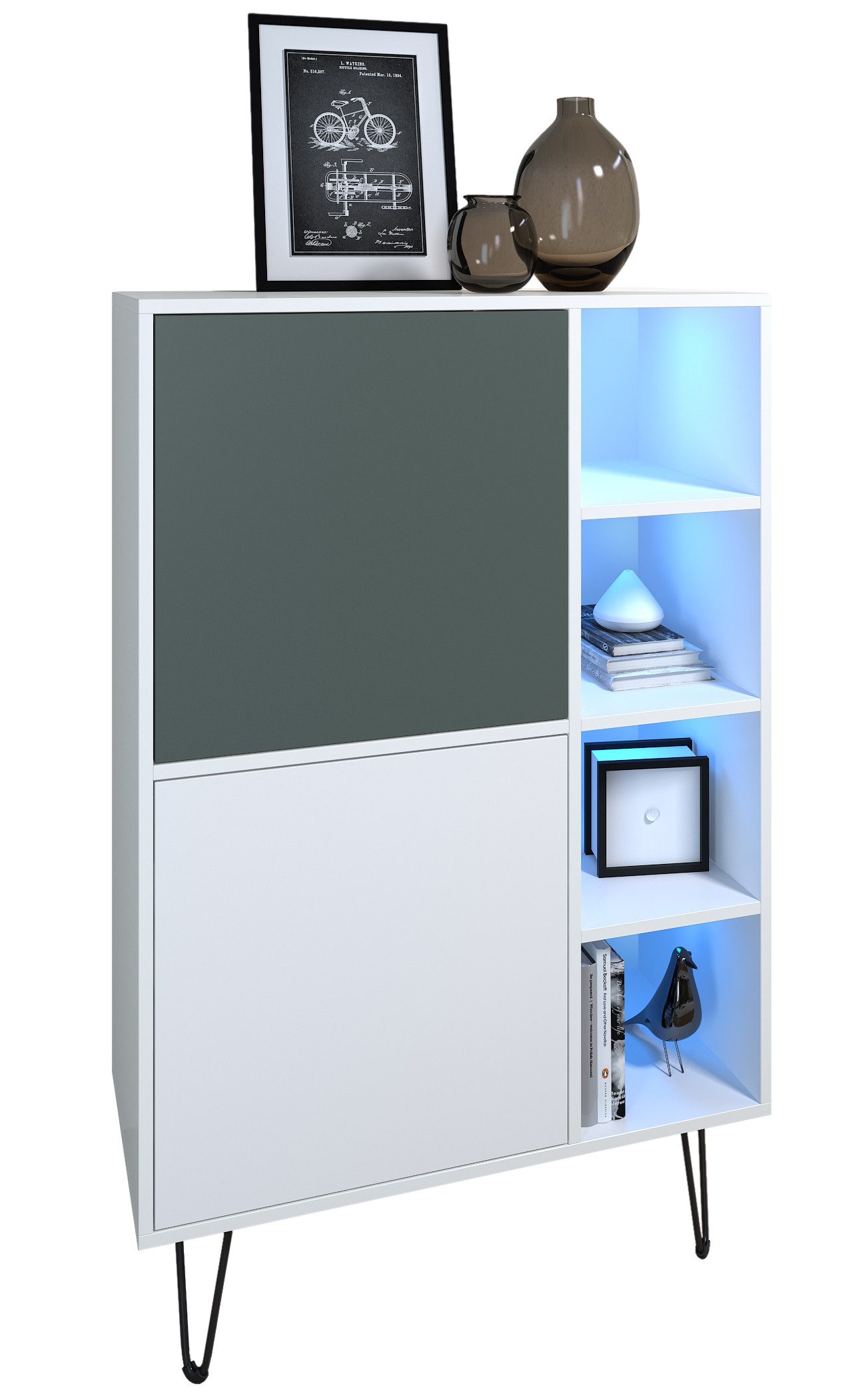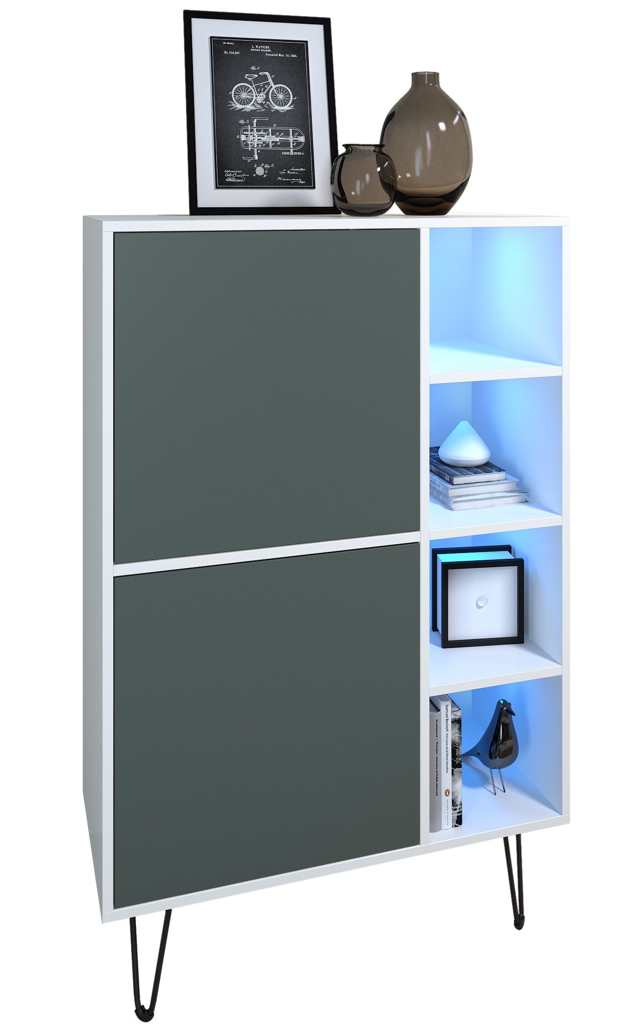 Die Türen mit Push-to-Open-Funktion verbergen großzügige Innenfächer – perfekt als Kommode, Schrank oder Aufbewahrungsschrank für Geschirr, Bücher oder Deko. Die 4 offenen Fächer bieten zusätzlichen Stauraum für Dekoration, Technik oder Pflanzen und werden durch die inklusive LED-Beleuchtung stilvoll in Szene gesetzt. Dank der grifflosen Front wirkt das Möbelstück besonders modern und harmonisch.