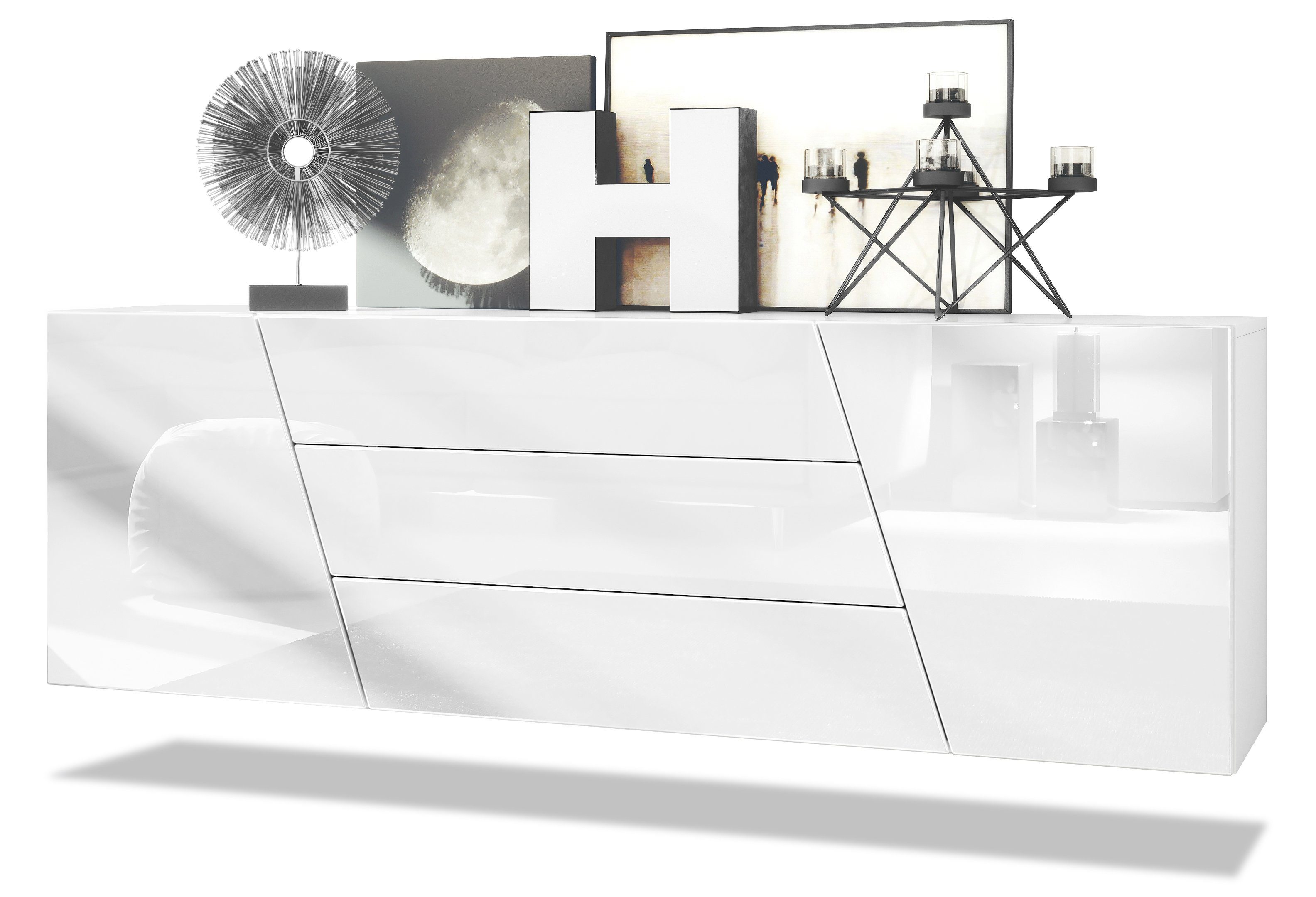Ob als modernes Sideboard im Wohnzimmer, Kommodenschrank für's Schlafzimmer oder als Anrichte im Flur - das geräumige Sideboard Houston präsentiert sich als praktisches Möbelstück mit modernem Design, hergestellt in Deutschland. Der Beistellschrank ist mit zwei diagonal gefrästen Türen und drei leichtgängigen Schubladen ausgerüstet. Hinter den Türen befinden sich jeweils zwei geräumige Fächer mit Einlegeboden. Die Türen und Schubladen sind mit unserem Push-to-Open-System ausgestattet. Eine Rückwand in Holzoptik aus Hartfaserplatten ist im Lieferumfang enthalten. Für die besondere Schwebeoptik wird das Sideboard hängend an der Wand befestigt.
