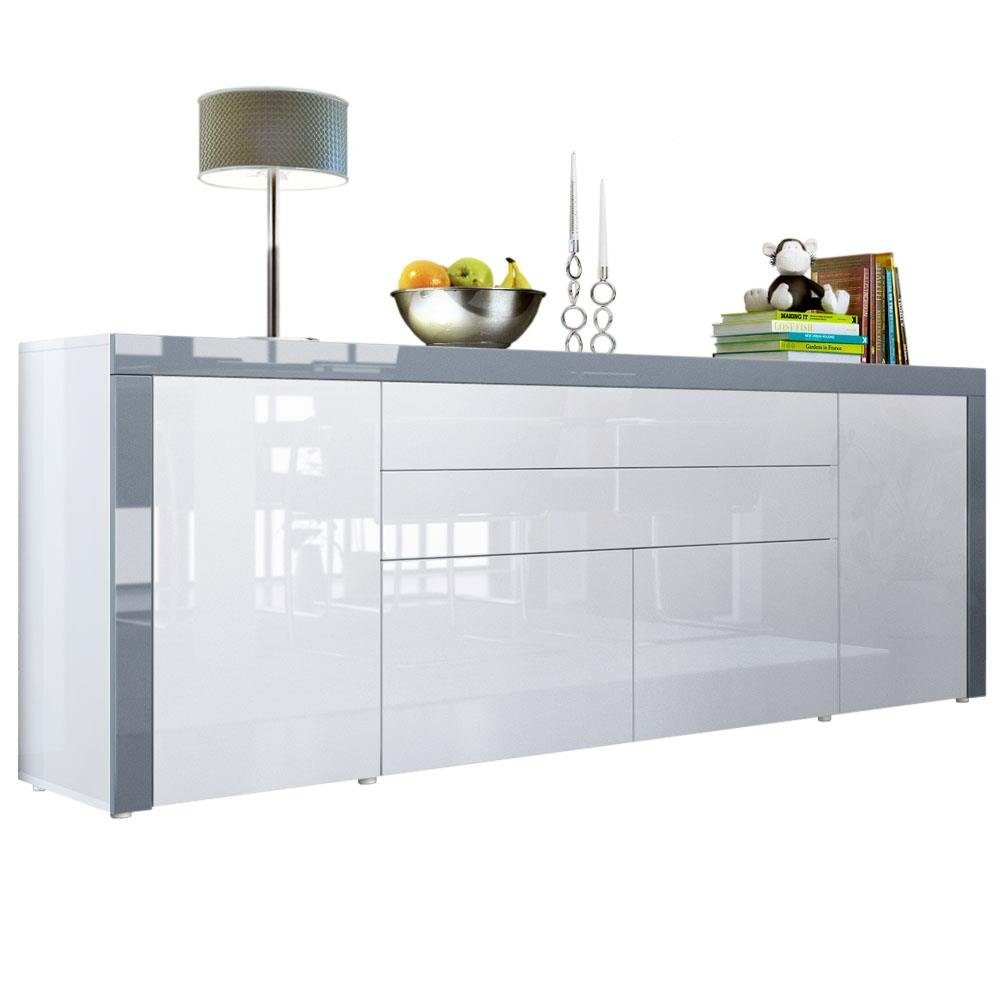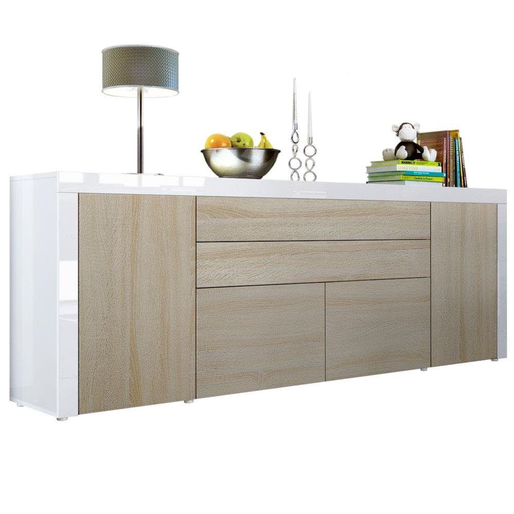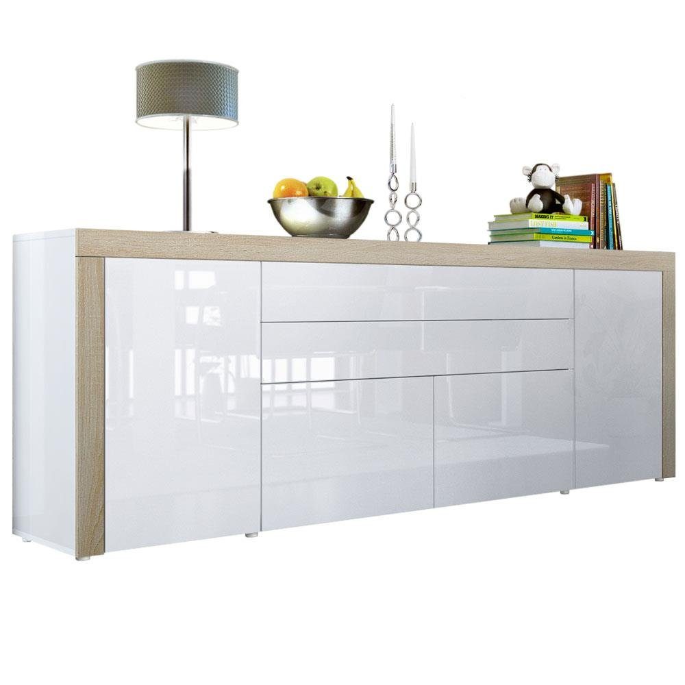 Ob als odernes Sideboard im Wohnzimmer, Kommodenschrank für's Schlafzimmer, Anrichte im Flur oder als Kommode im Kinderzimmer - die geräumige Kommode La Paz V2 präsentiert sich als praktisches Möbelstück mit modernem Design, hergestellt in Deutschland. Der Beistellschrank ist mit zwei Türen, zwei Schubkästen und 2 Klappen ausgerüstet. Hinter den Türen befinden sich je zwei geräumige Fächer. Ein weitflächiger Innenraum befindet sich hinter den zwei Klappen. Die Türen, Schubladen und Klappen sind mit unserem Push-to-Open-System ausgestattet. Die großflächige Deckplatte der Kommode kann als praktische Ablage genutzt werden und lädt zum Dekorieren ein. Eine Rückwand in Holzoptik aus Hartfaserplatten ist im Lieferumfang enthalten.
