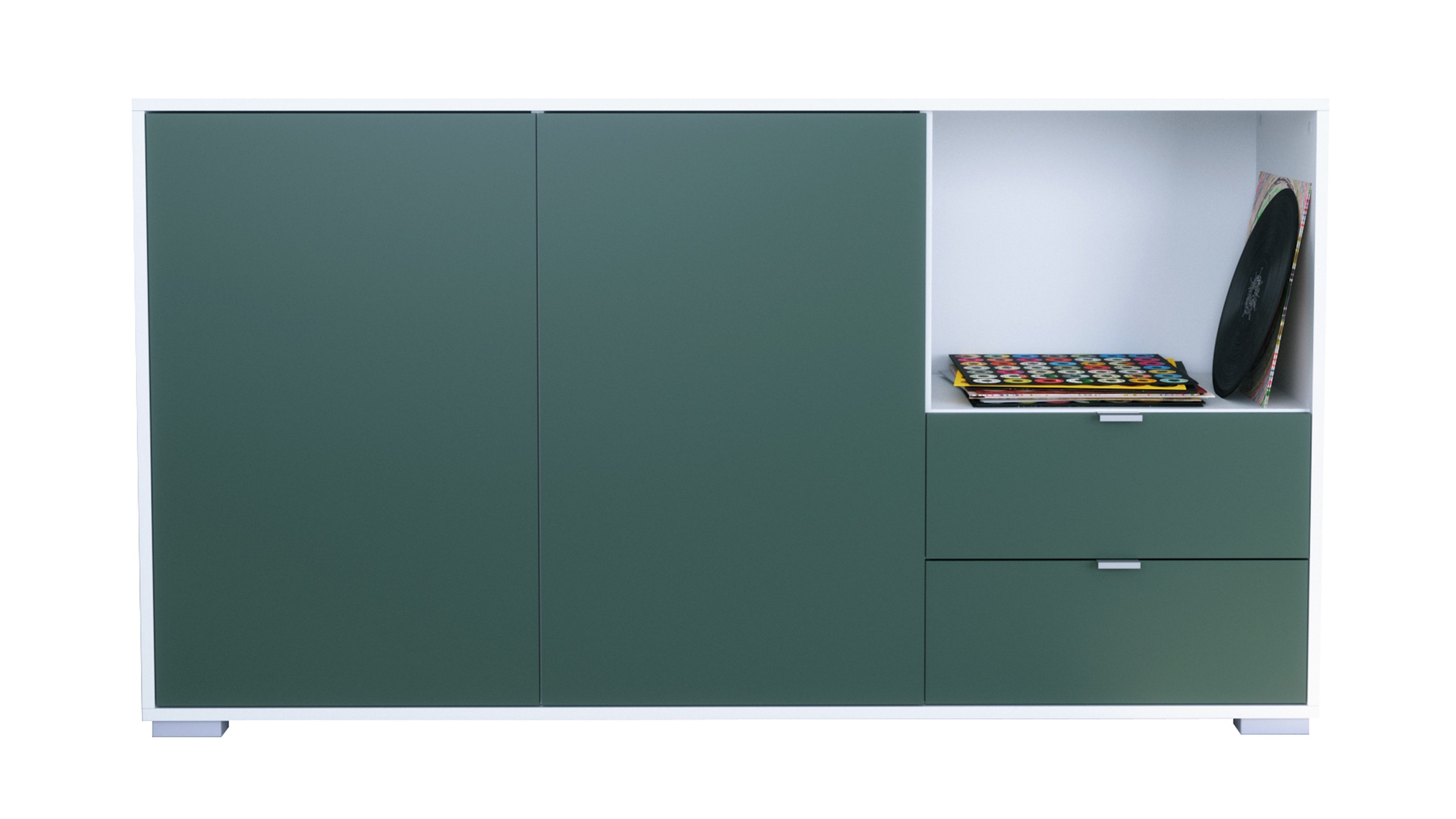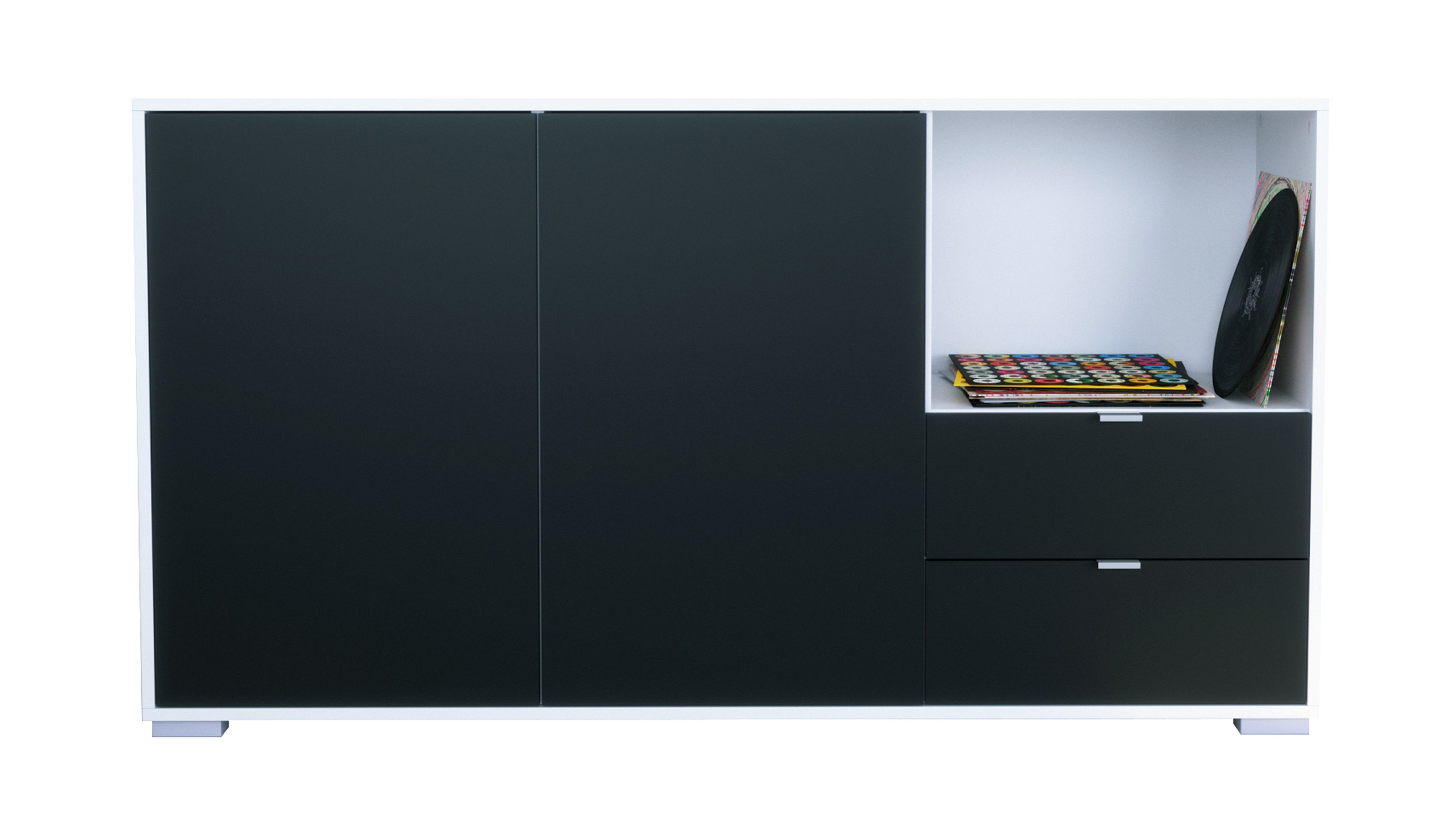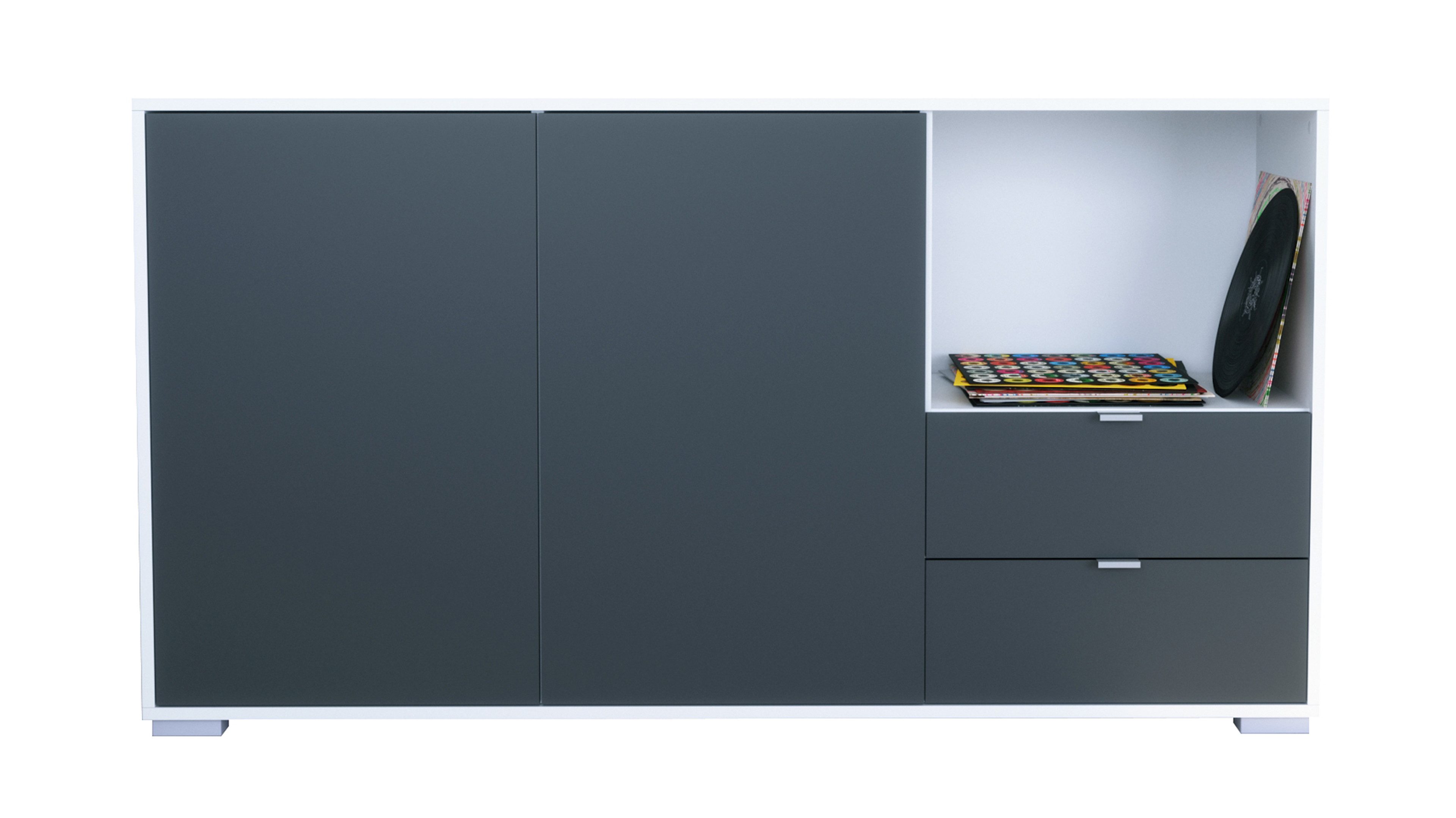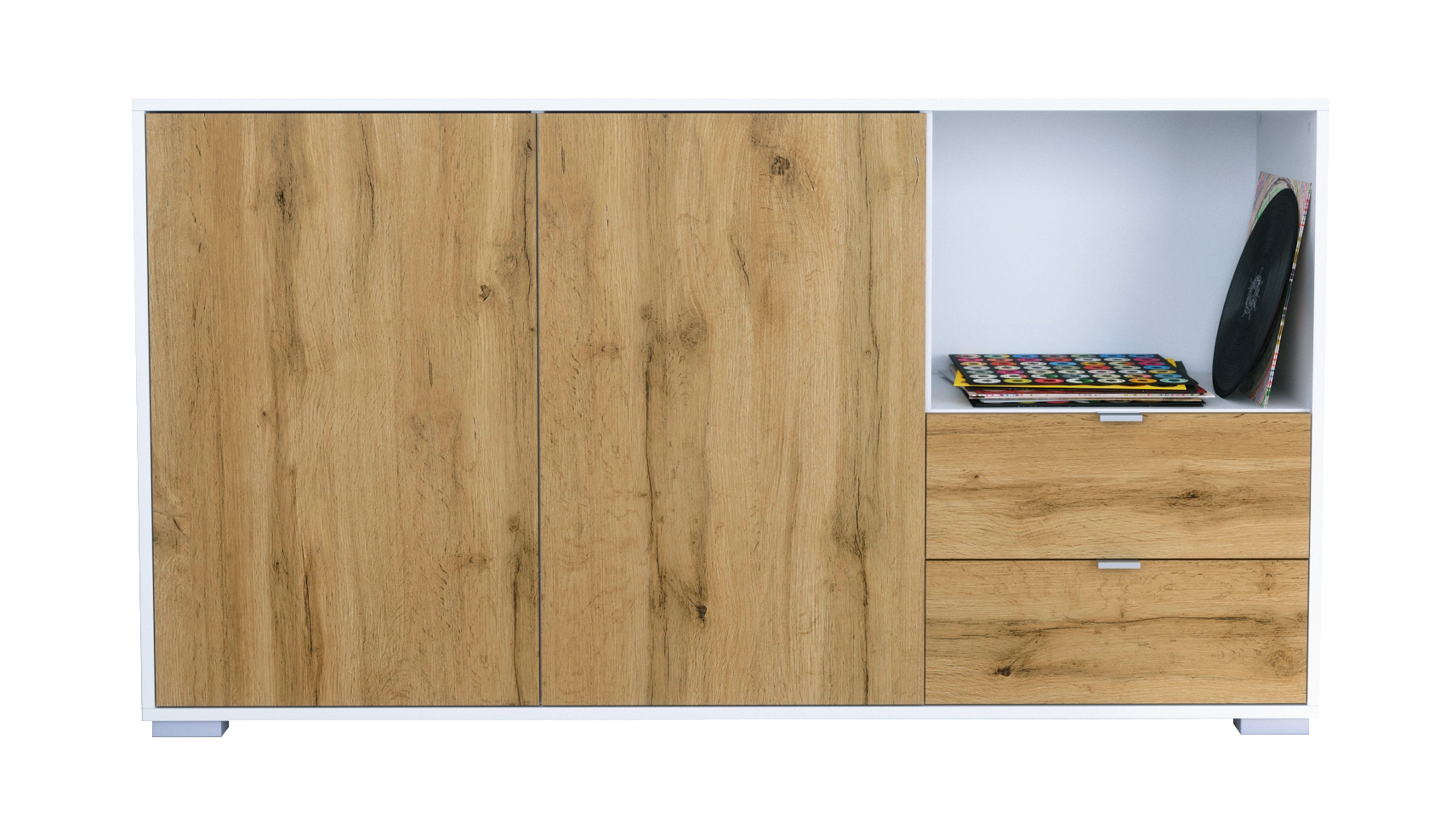 Hinter den zwei großen Türen mit Push-to-Open-Funktion befinden sich insgesamt vier geschlossene Fächer – perfekt zur Nutzung als Kommode, Schrank oder Aufbewahrungsschrank für Geschirr, Deko oder Haushaltsartikel. Auf der rechten Seite bietet ein offenes Fach Platz für Dekoelemente, Pflanzen oder Technik. Direkt darunter befinden sich zwei praktische Schubladen mit Metallgriffen – ideal für Kleinteile, Besteck oder Dokumente.