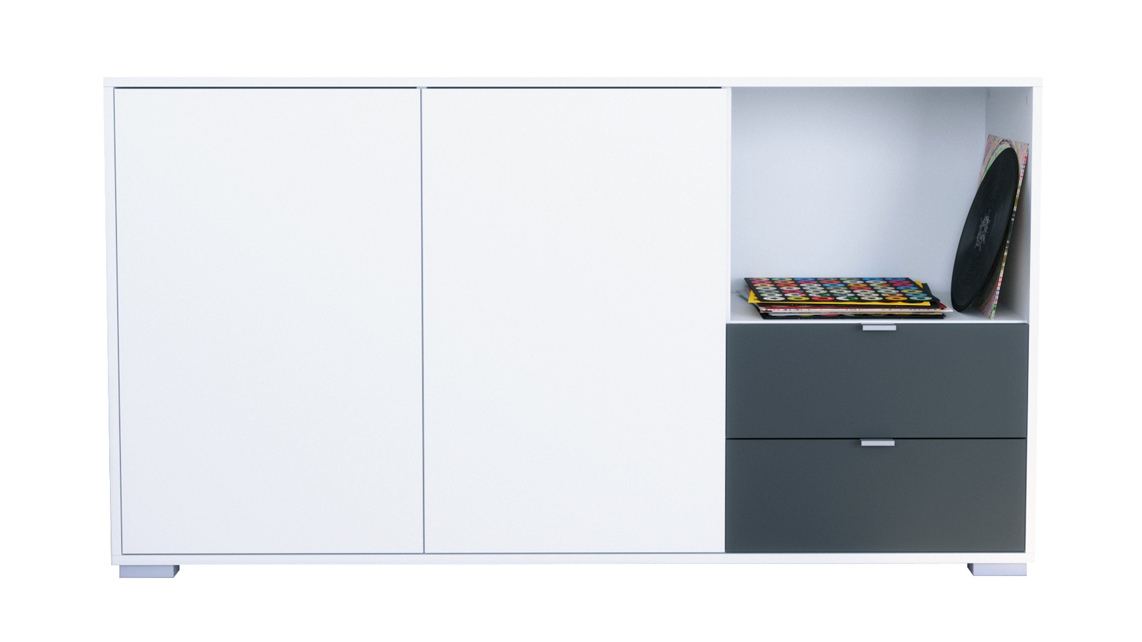 Das Milano Sideboard vereint modernes Design mit cleverem Stauraum. Der Korpus in Weiß matt verleiht dem Möbelstück eine zeitlose, elegante Ausstrahlung. Silberne Füße sorgen für Stabilität und dezente Akzente. Die Frontfarbe ist individuell wählbar – ideal für Wohnzimmer, Schlafzimmer, Esszimmer oder Flur.