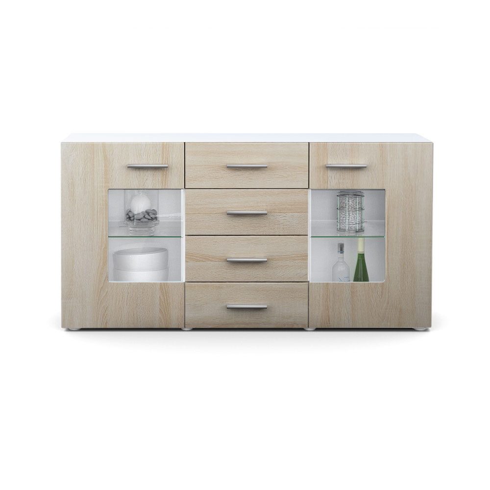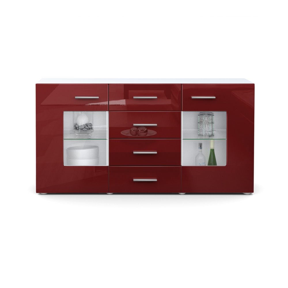 Die Schubkästen gleiten sanft und leise auf stabilen Metalllaufschienen, sodass Sie Ihre Lieblingsstücke übersichtlich organisieren können. Die beiden Vitrinentüren mit Glaseinlegeböden verleihen dem Möbelstück eine besonders elegante Optik und setzen Dekorationen stilvoll in Szene.