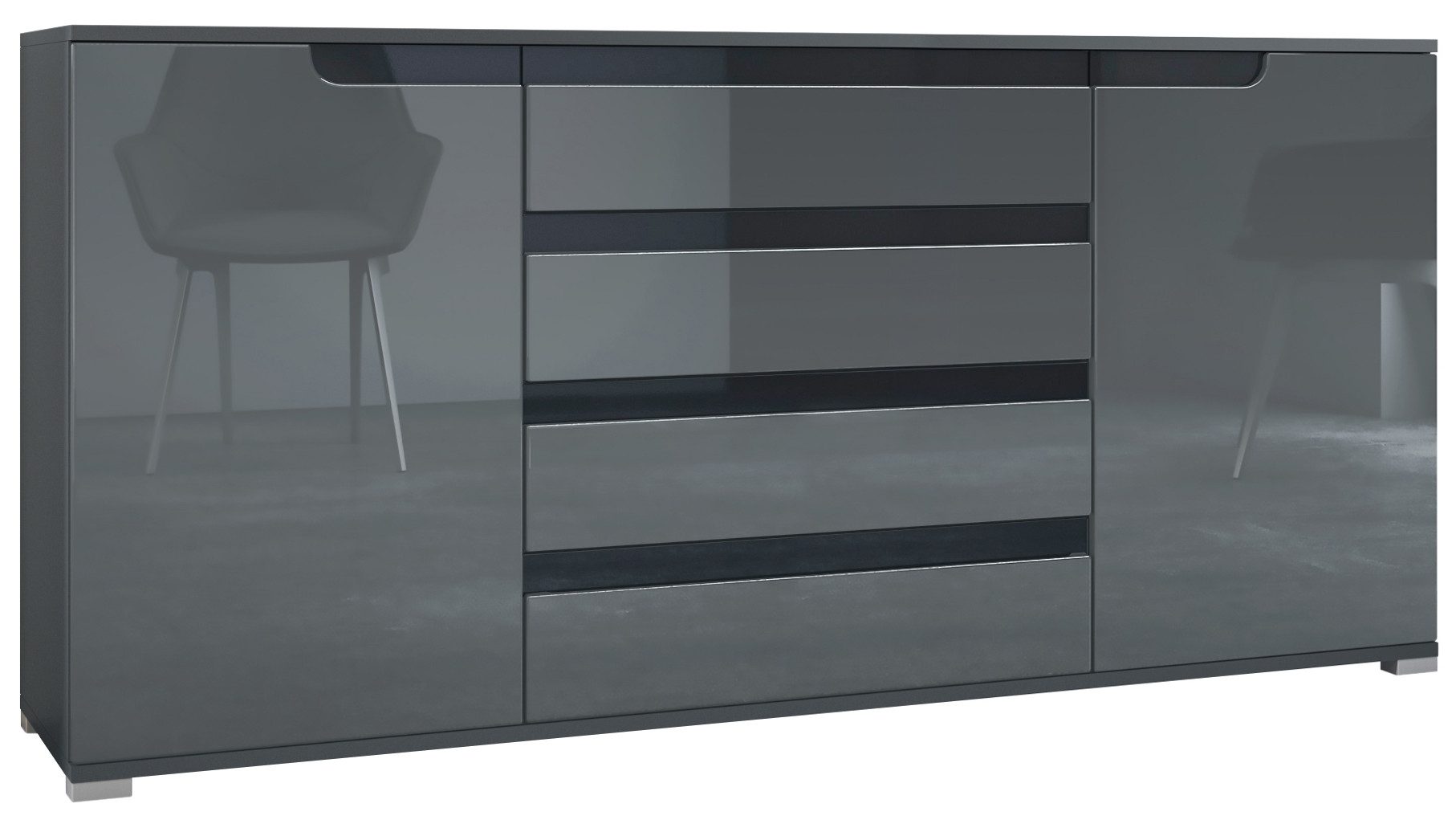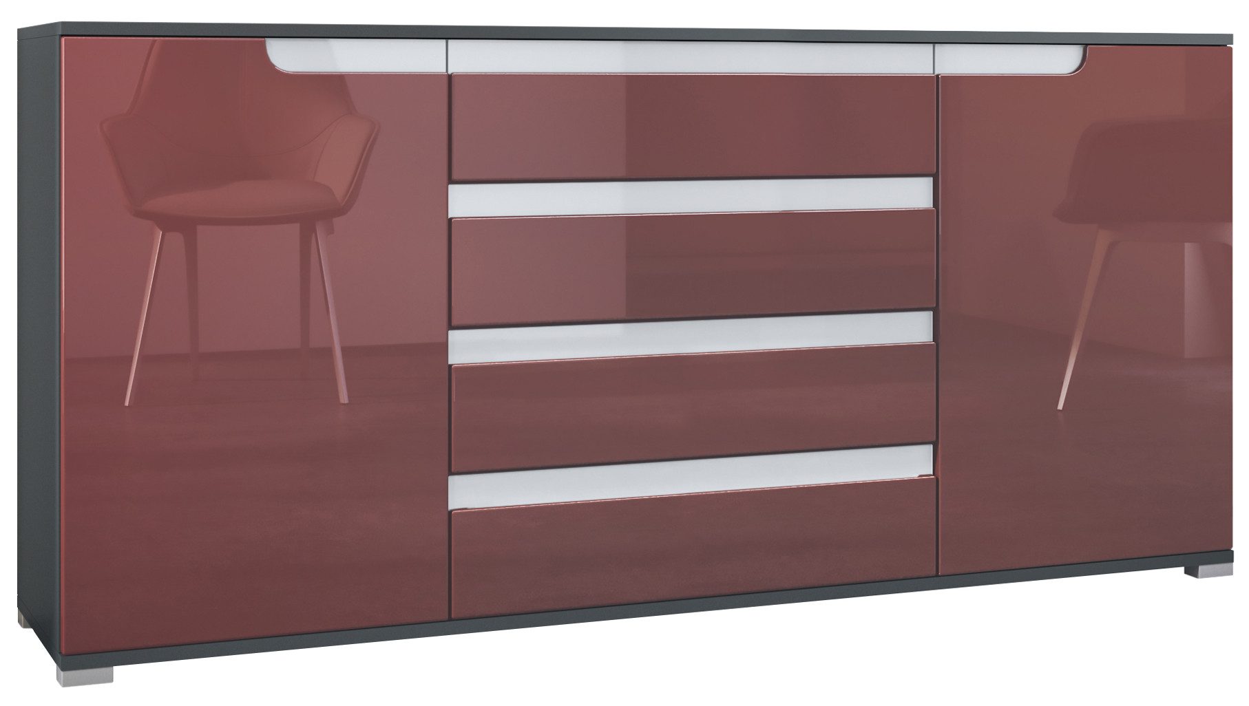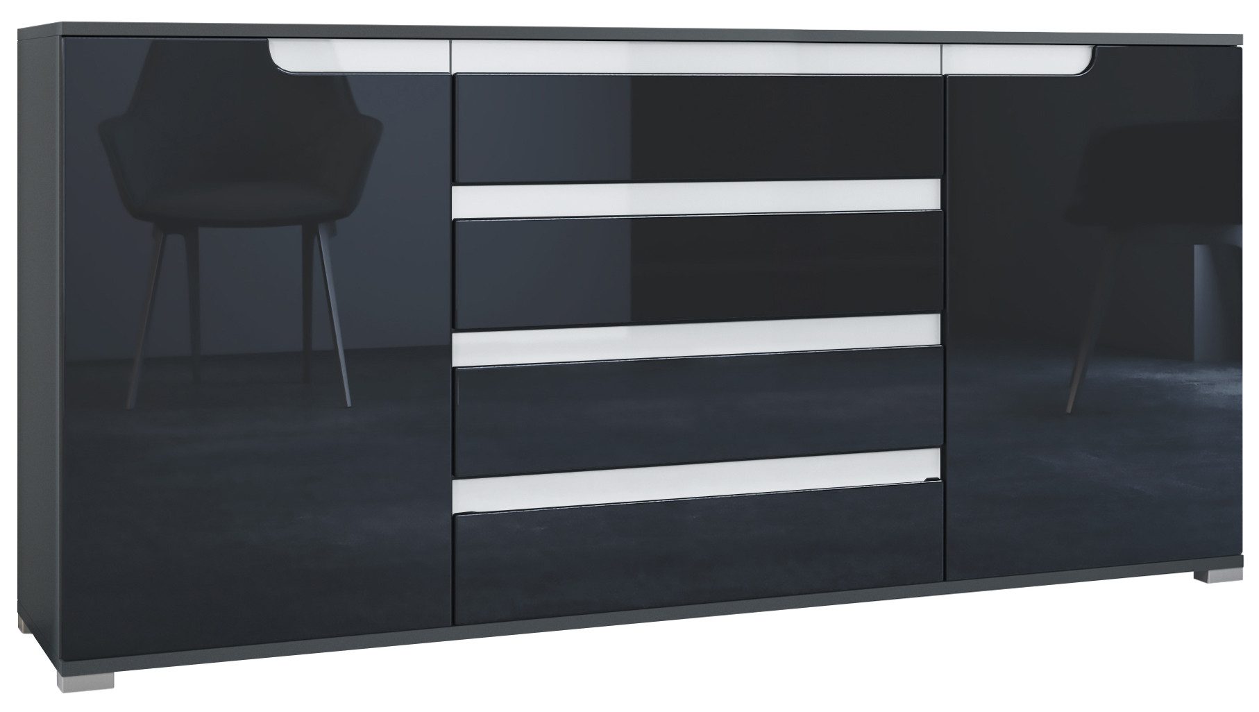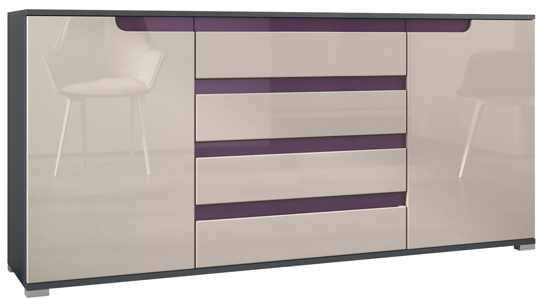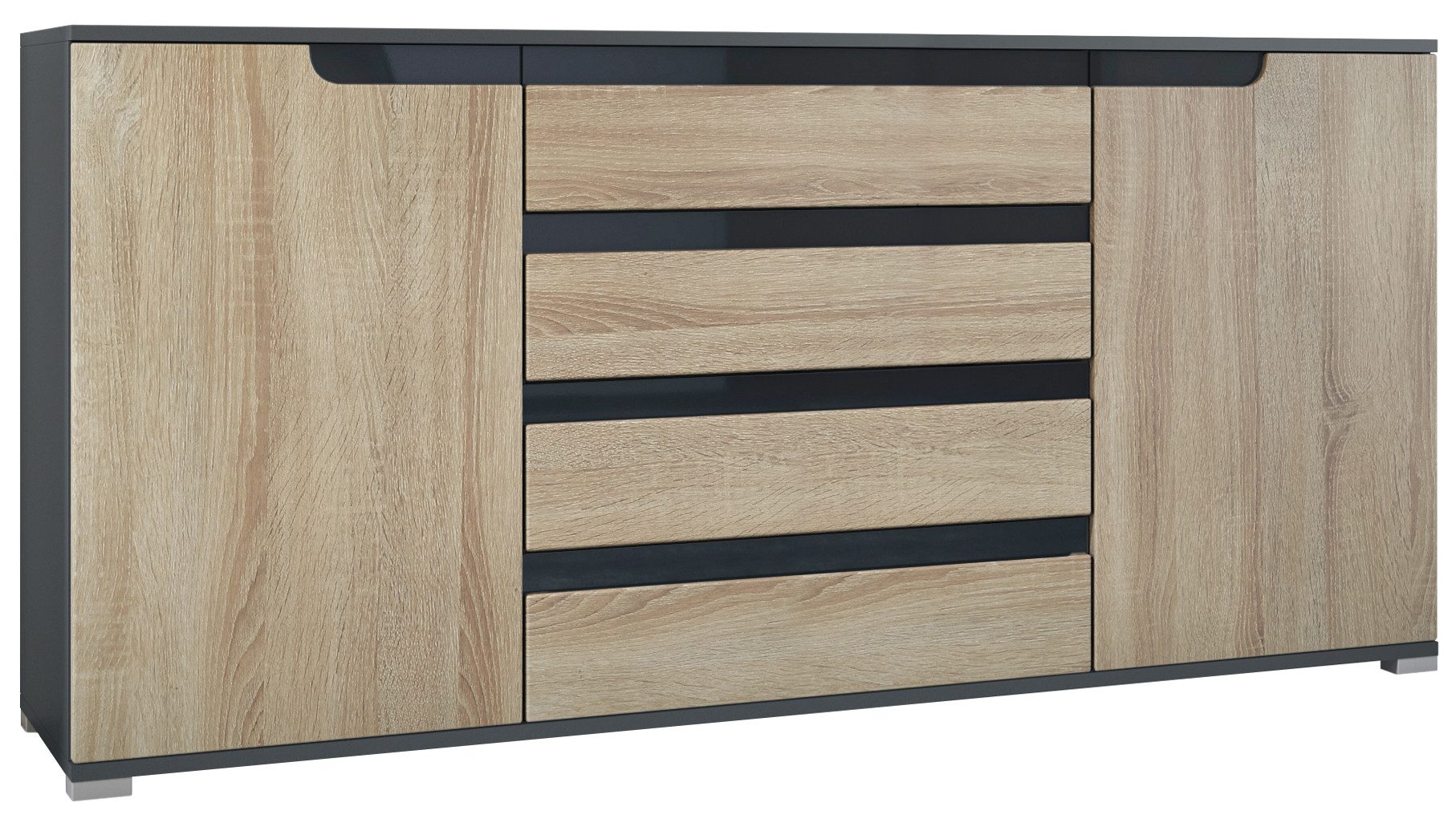 Der Korpus des Sideboards ist in Anthrazit matt gehalten. Wählen Sie die passende Frontfarbe für Ihren Wohnstil: edle Hochglanz-Optik, natürliche Holztöne oder moderne matte Farben.