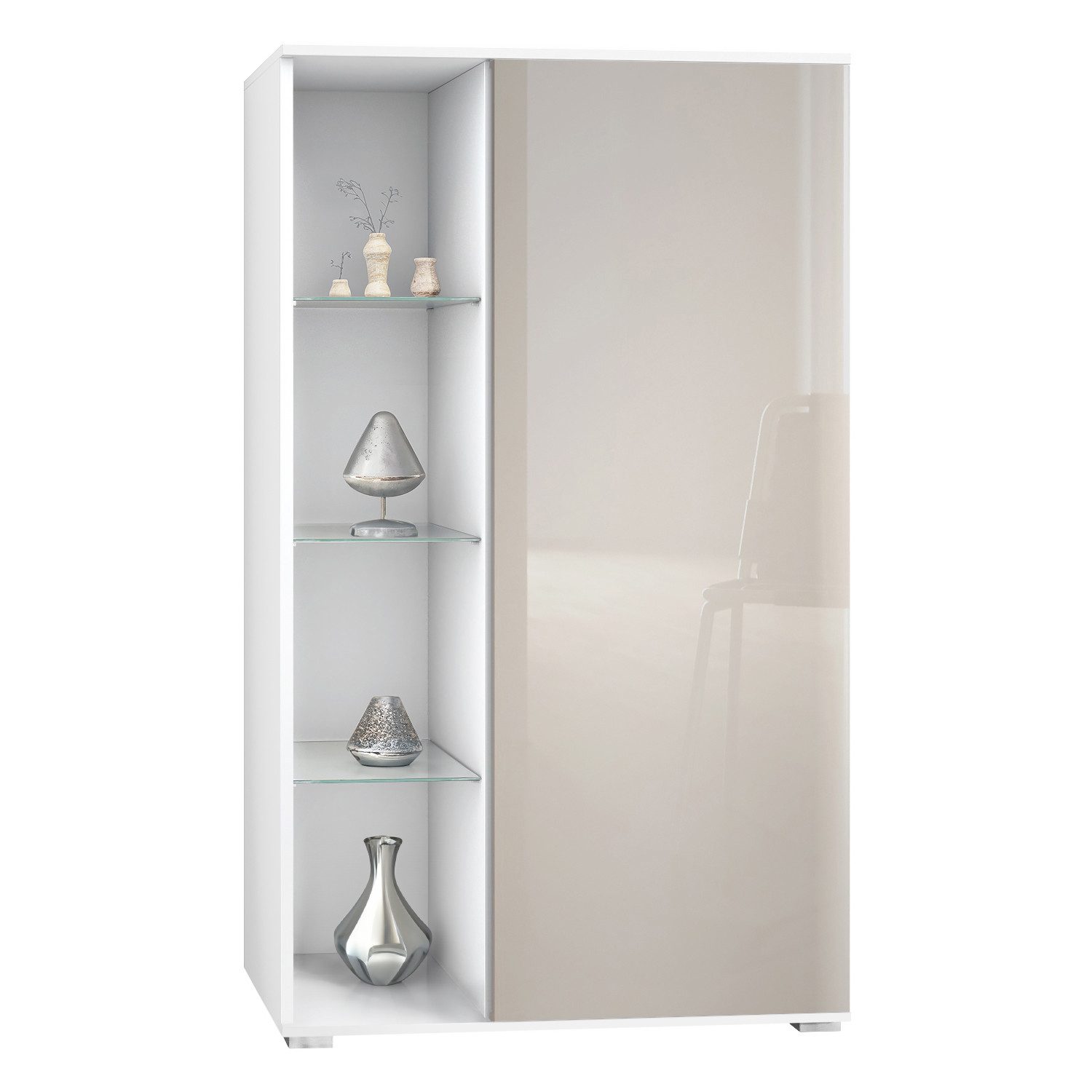 Diese Vitrine besticht durch ihre Flexibilität: Sie können selbst entscheiden, ob die offenen Fächer links oder rechts positioniert werden sollen und ob die Tür sich nach links oder rechts öffnen soll. Diese Anpassungsfähigkeit ermöglicht es Ihnen, die Vitrine perfekt an Ihre Raumgestaltung anzupassen.