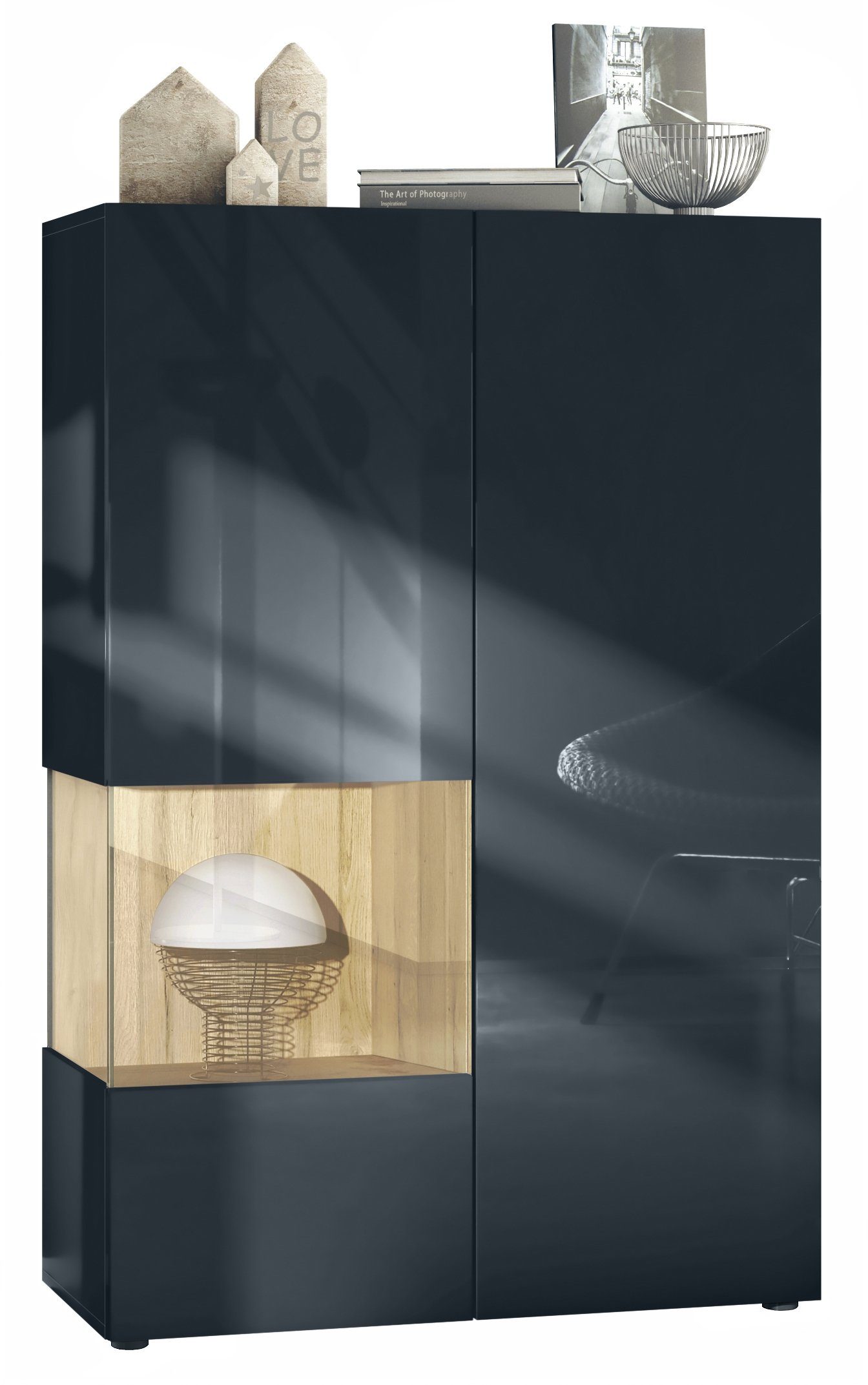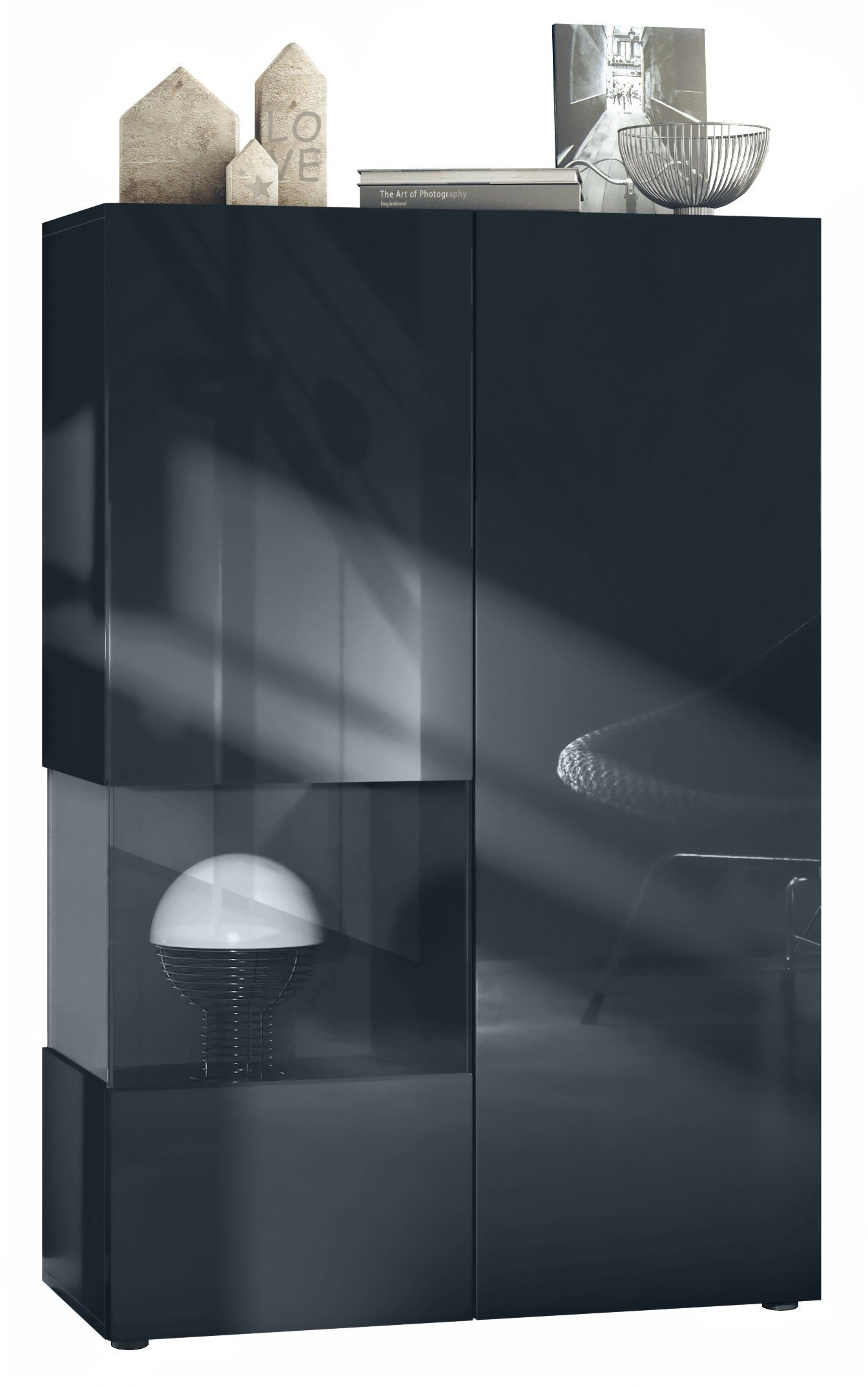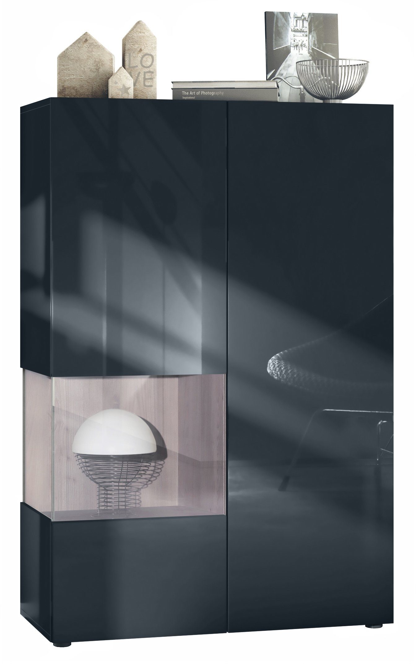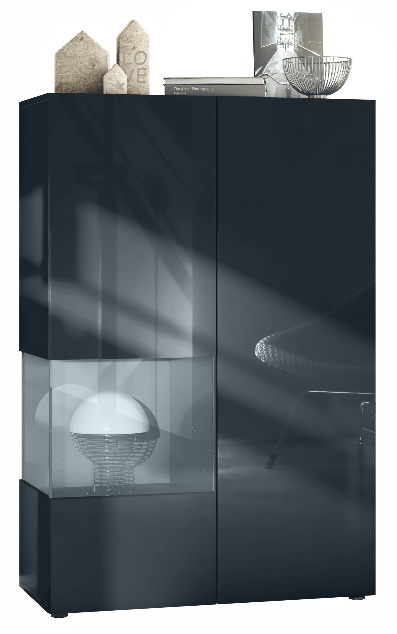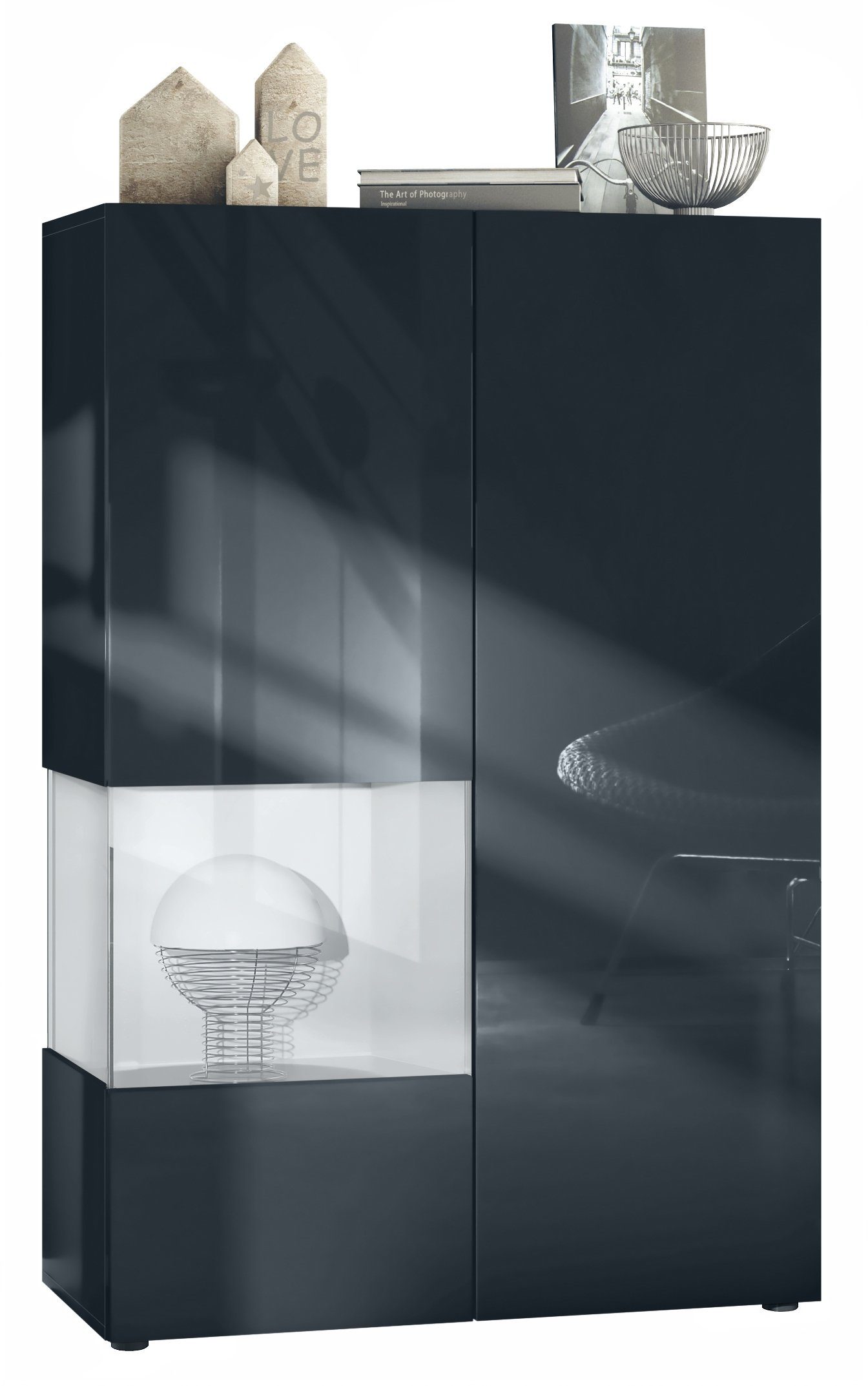 Der Vitrinenschrank Morena V2 eignet sich perfekt für jeden Wohnraum und ist dazu noch ein echter Eye-Catcher. Die geräumige Vitrine präsentiert sich als praktisches Möbelstück mit modernem Design, hergestellt in Deutschland. Die Glasvitrine ist mit zwei Türen ausgestattet, hinter denen sich insgesamt 7 Fächer verbergen. Eine der Türen ist mit einem dekorativen Einsatz aus ESG-Sicherheitsglas versehen, durch den man das sich farblich vom Rest der Vitrine abhebende Fach sehen kann. Dieses kreativ eingesetzte farbige Fach sorgt in Kombination mit den hochglänzenden schwarzen Türen für eine besondere Eleganz. Der Cube ist in vielen verschiedenen Farbvarianten erhältlich. Das Glasfenster kann optional mit einer LED-Beleuchtung mit weißem Licht bestückt werden. Der Vitrinenschrank ist mit einer Rückwand in Holzoptik aus Hartfaserplatten ausgestattet.