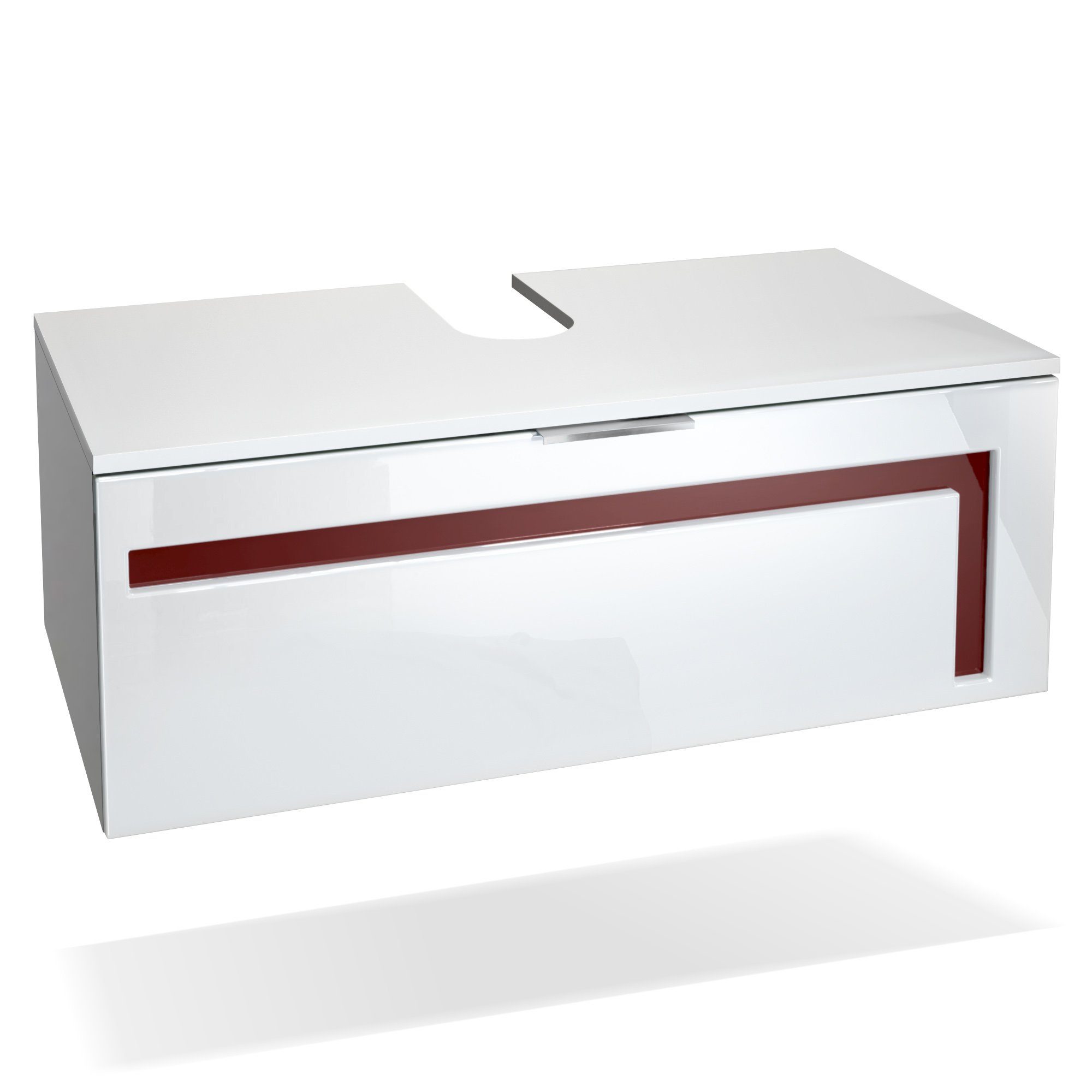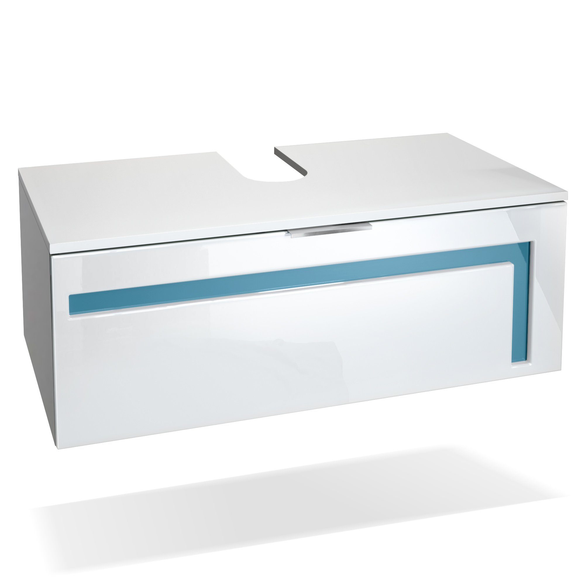 Der Korpus (Oberböden und Seiten) des Unterschranks sind in einem matten Weiß gehalten. Die Front besteht aus MDF und ist in Weiß Hochglanz mit abgerundeten Kanten verfügbar. Die Absetzungen sind in verschiedenen Trendfarben erhältlich.