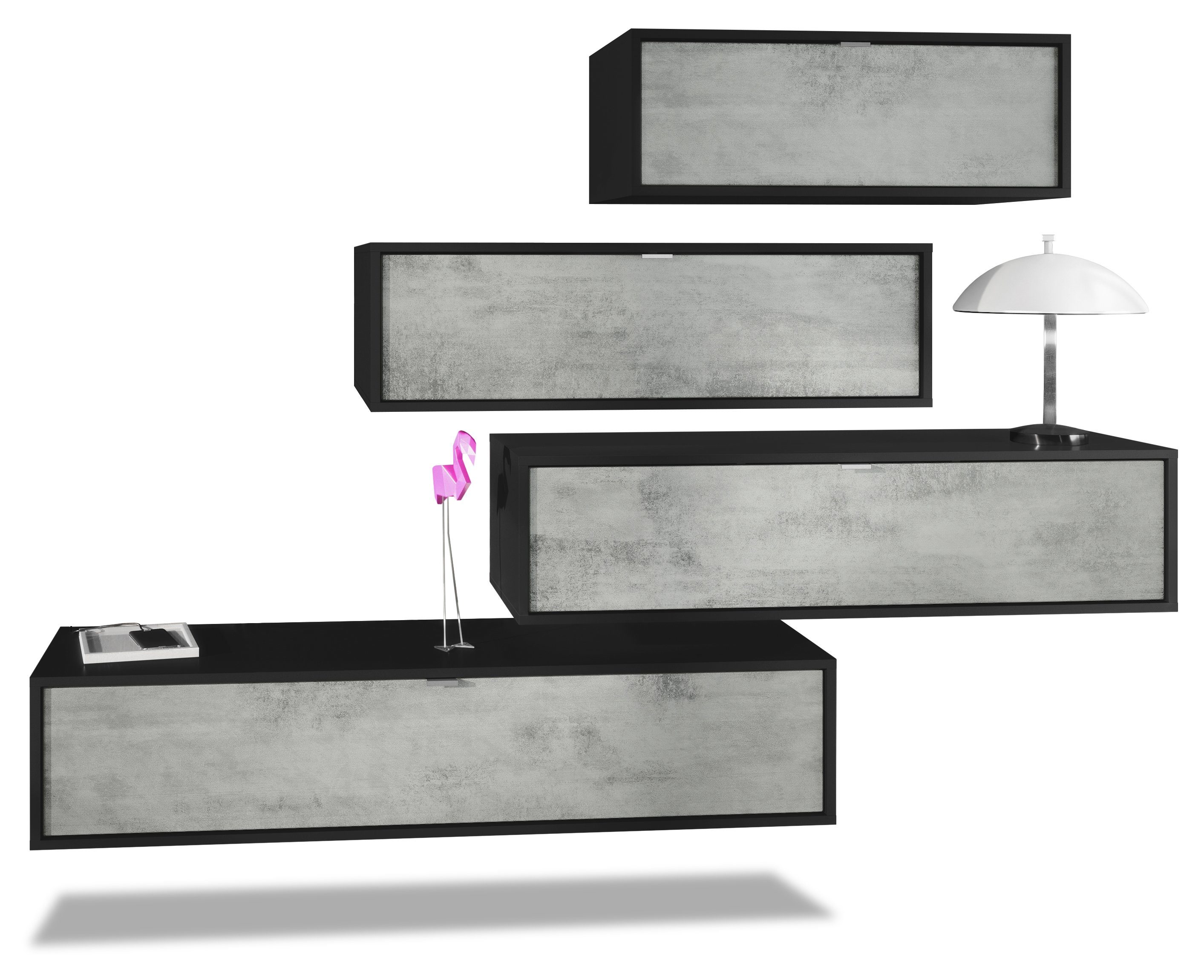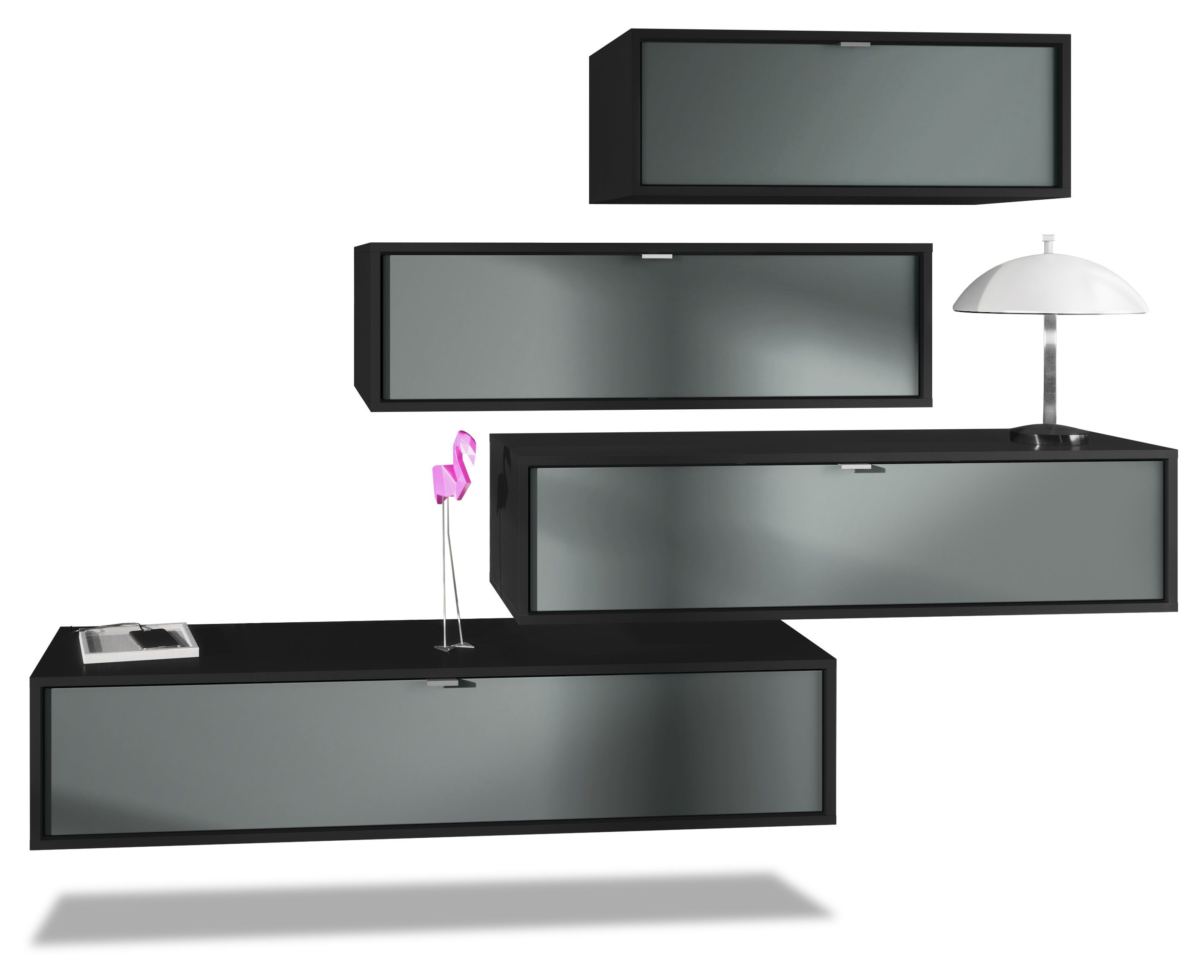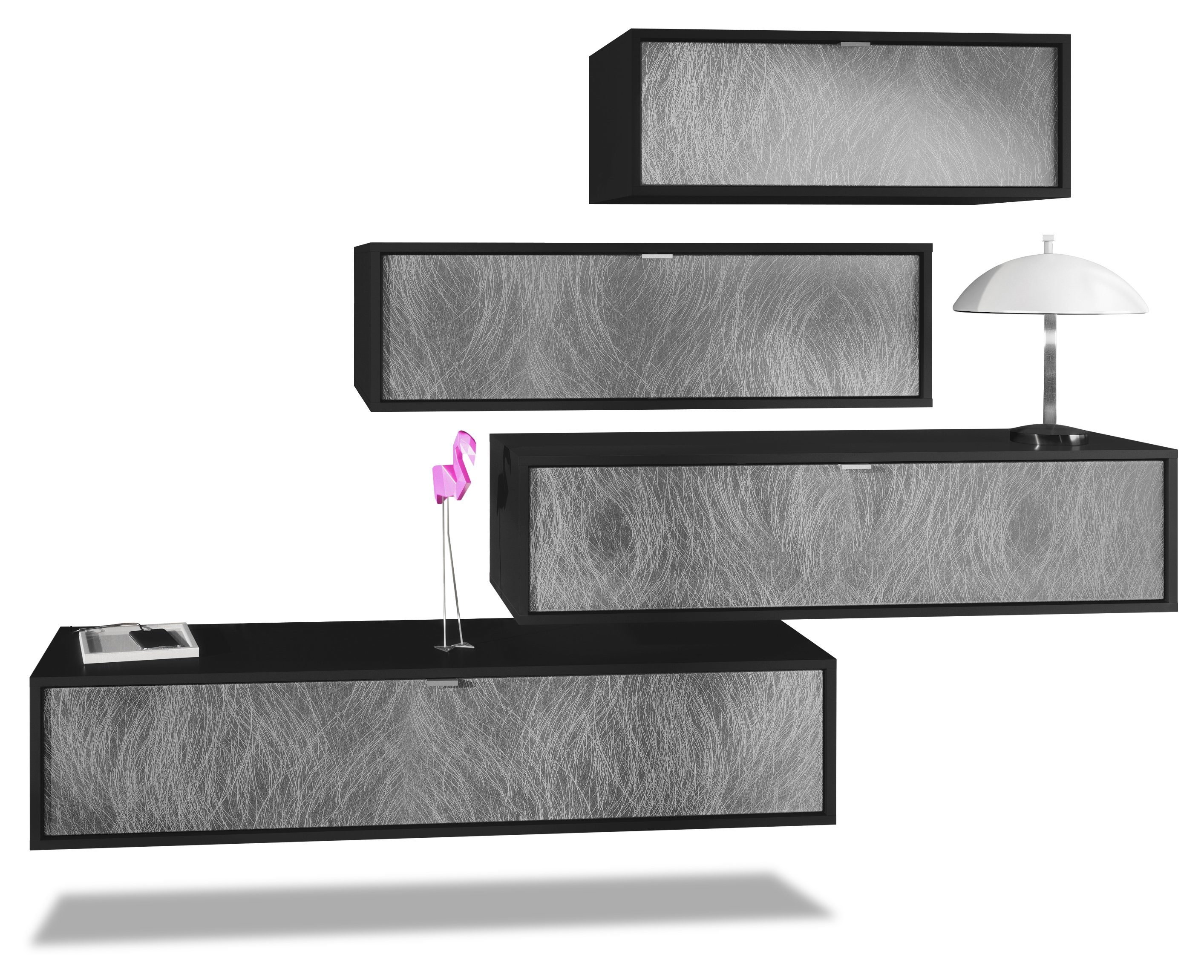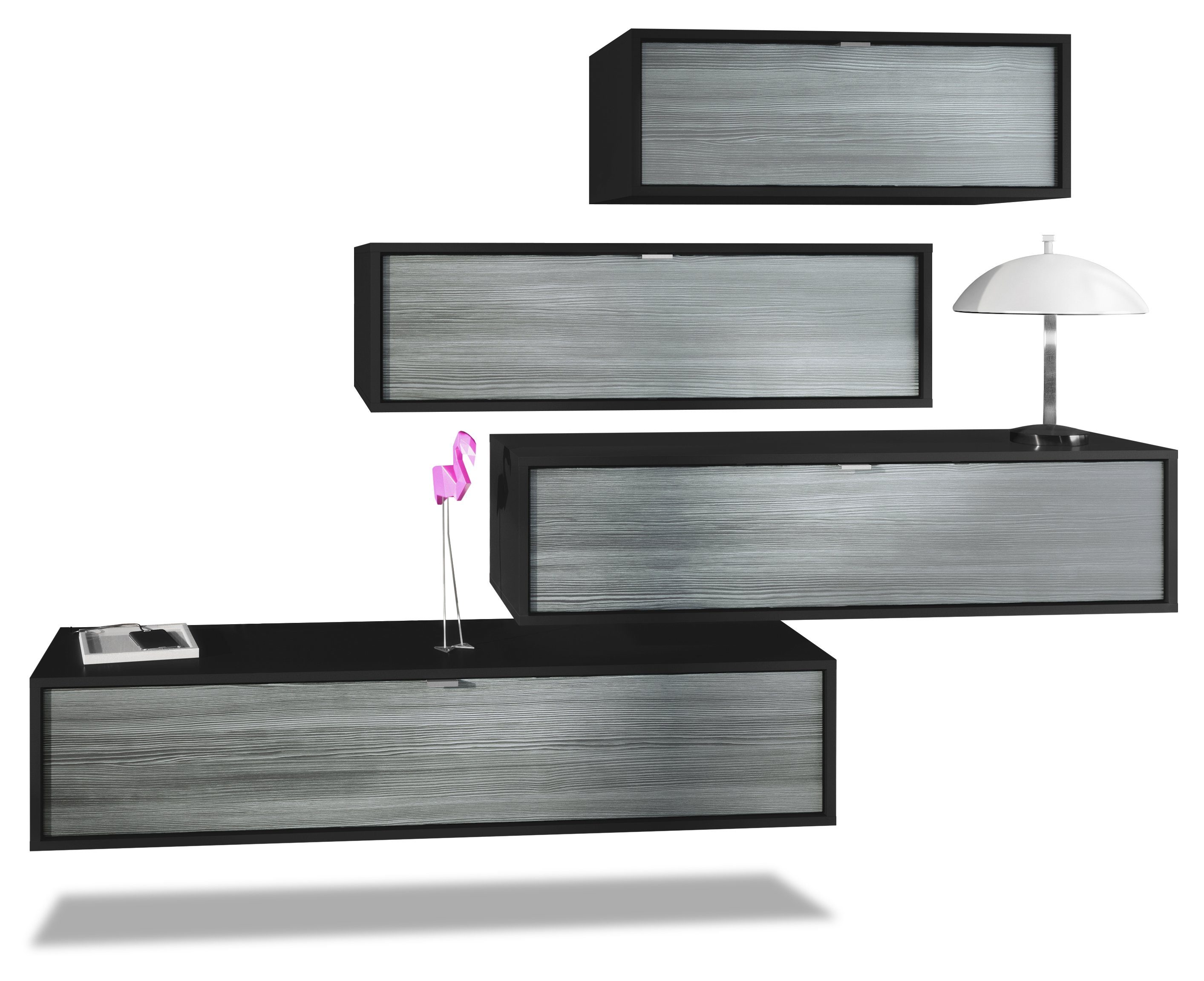 Der Korpus der verschiedenen TV Boards hat die Farbe Schwarz matt. Um der Wohnwand einen futuristischen Stil zu verleihen, werden alle Teile hängend an der Wand befestigt. Dies ist gerade dann praktisch, wenn auf dem Boden nicht genügend Platz für stehende Möbel verfügbar ist.