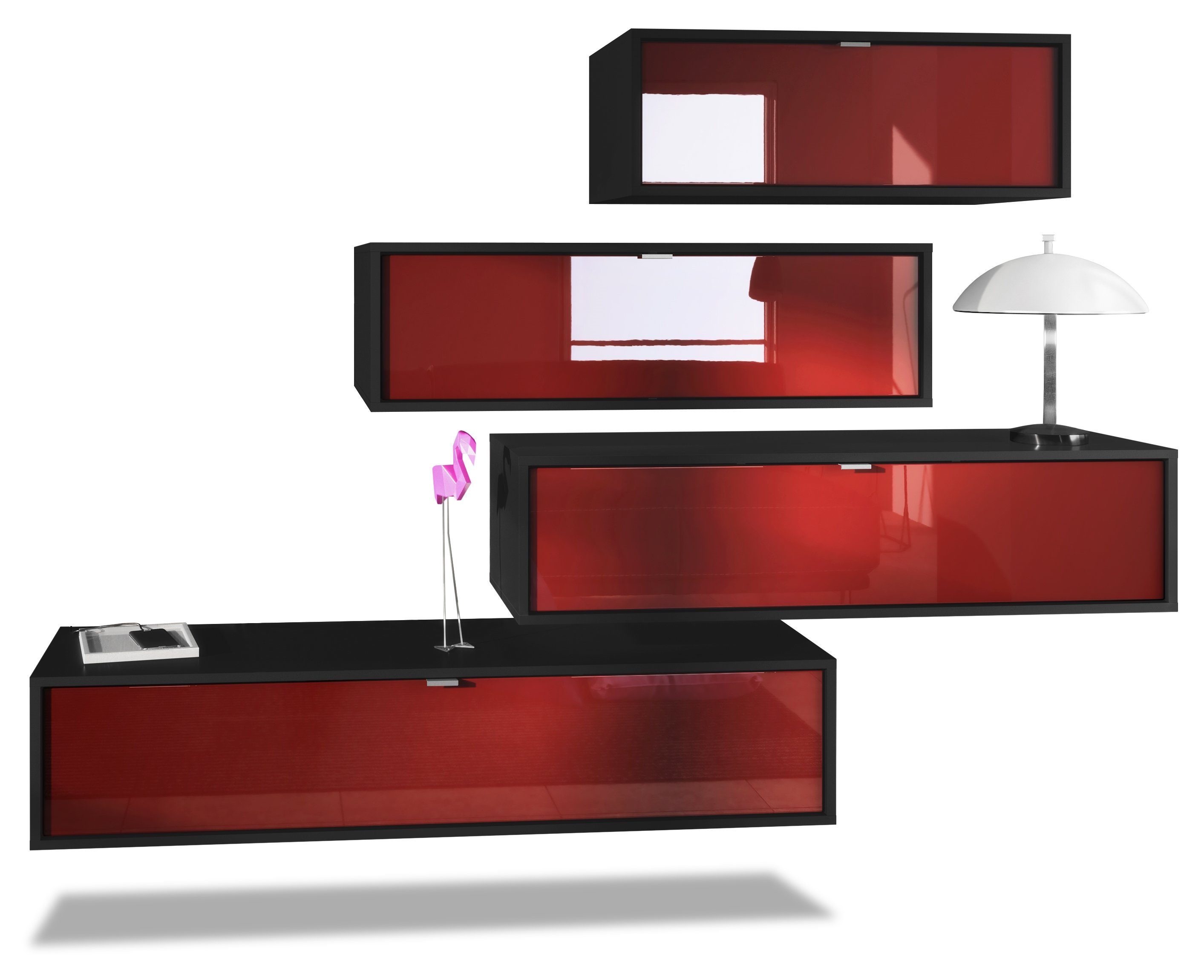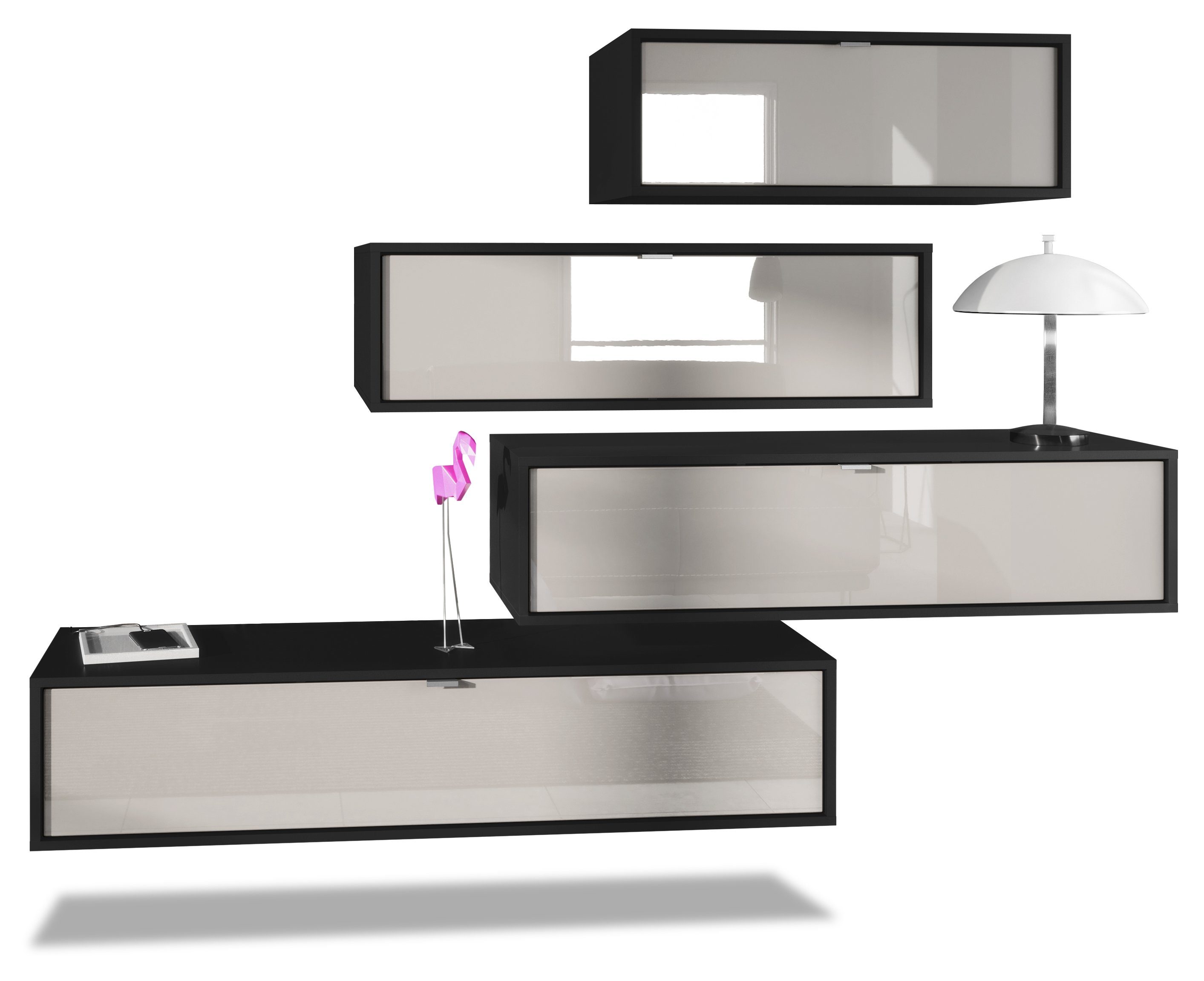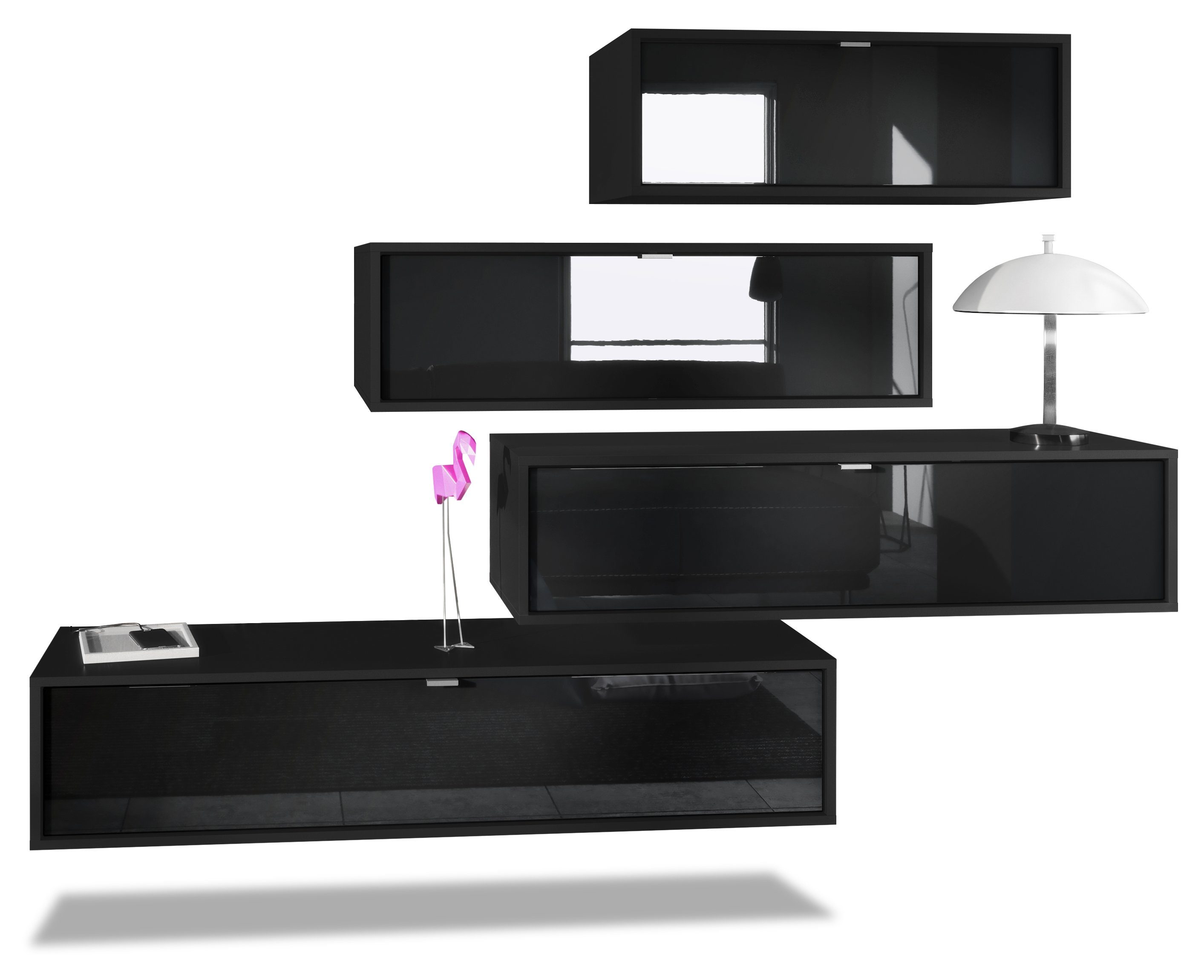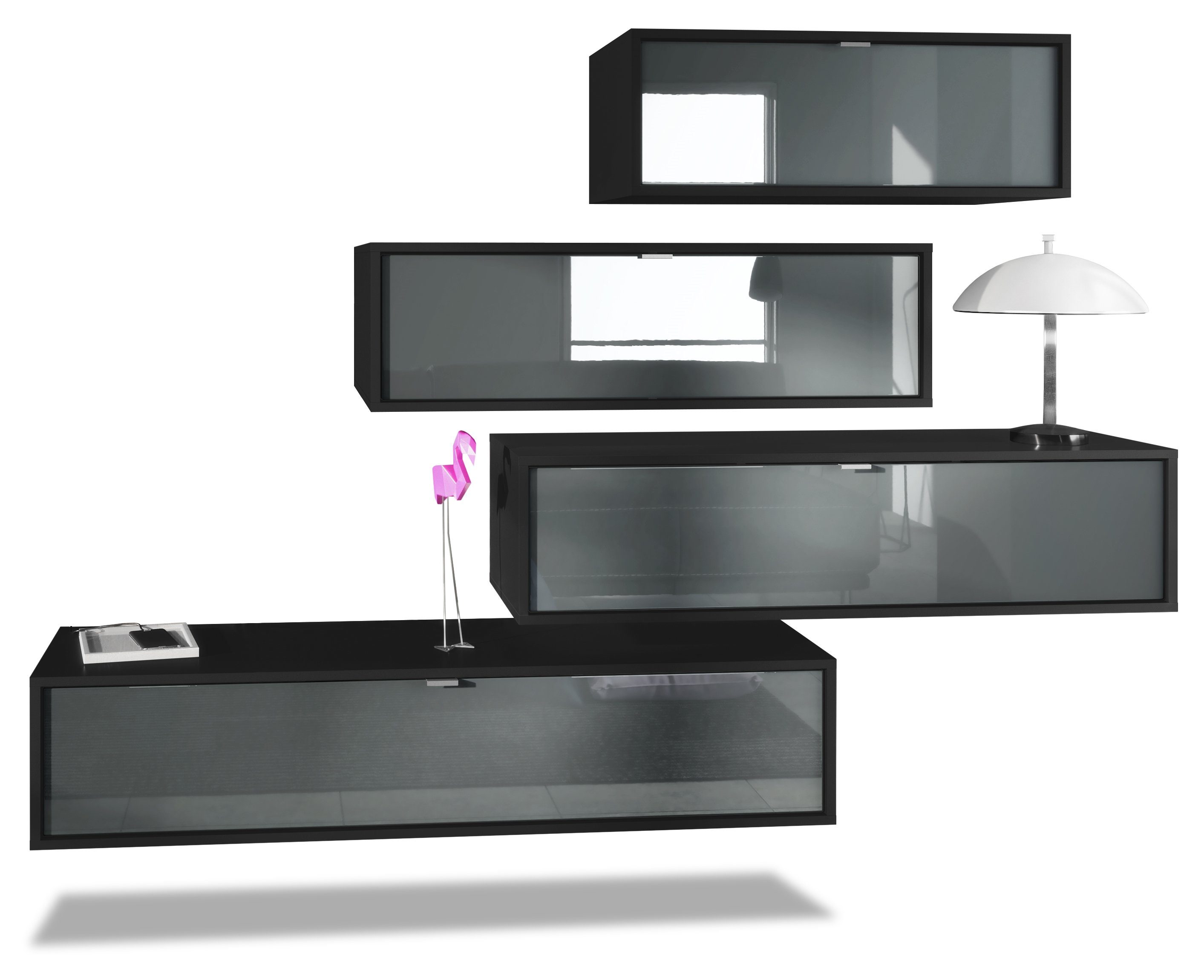Der Korpus der verschiedenen TV Boards hat die Farbe Schwarz matt. Um der Wohnwand einen futuristischen Stil zu verleihen, werden alle Teile hängend an der Wand befestigt. Dies ist gerade dann praktisch, wenn auf dem Boden nicht genügend Platz für stehende Möbel verfügbar ist.