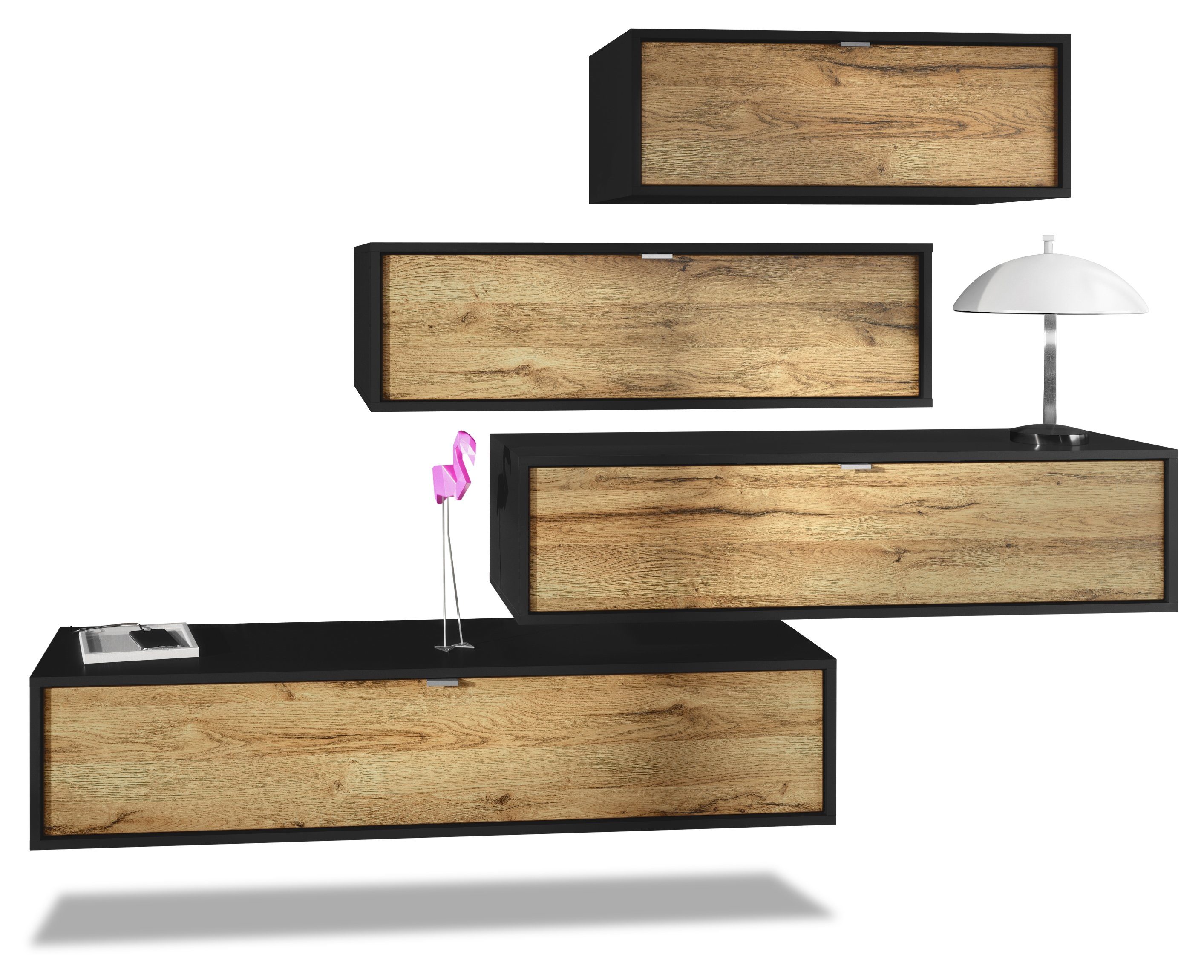 Die Wohnwand Lana V3 bietet so viel mehr Flexibilität als andere Wohnwände: Die einzelnen Hängeelemente können derart unterschiedlich an der Wand des Wohnzimmers angebracht werden, dass ein jeder seine eigene, individuelle Wohnwand bauen kann. Die zu sehenden Bilder und Вариантыn zeigen nur einen Bruchteil der Möglichkeiten, die dem Besitzer offenstehen.
