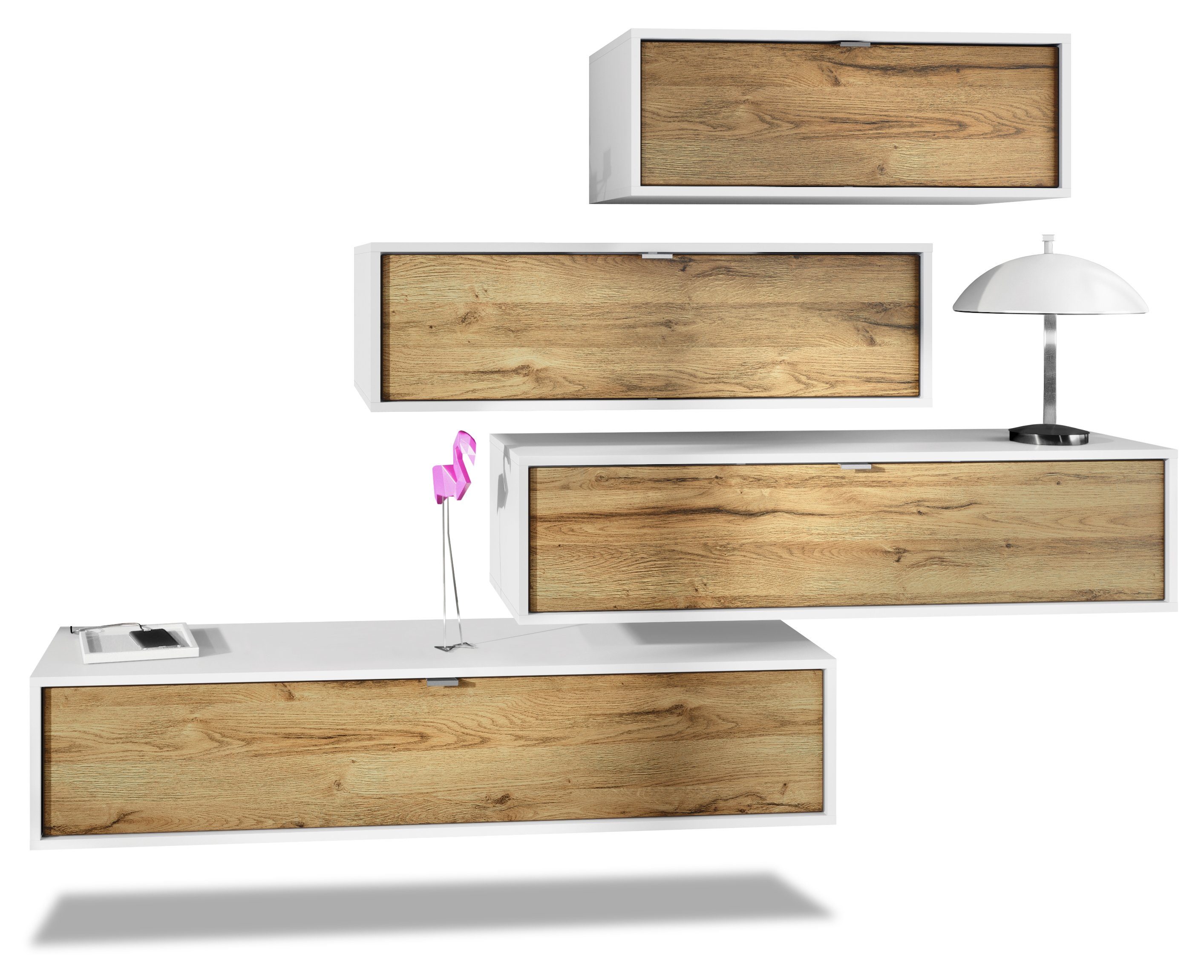 Die Wohnwand Lana V3 bietet so viel mehr Flexibilität als andere Wohnwände: Die einzelnen Hängeelemente können derart unterschiedlich an der Wand des Wohnzimmers angebracht werden, dass ein jeder seine eigene, individuelle Wohnwand bauen kann. Die zu sehenden Bilder und Вариантыn zeigen nur einen Bruchteil der Möglichkeiten, die dem Besitzer offenstehen.