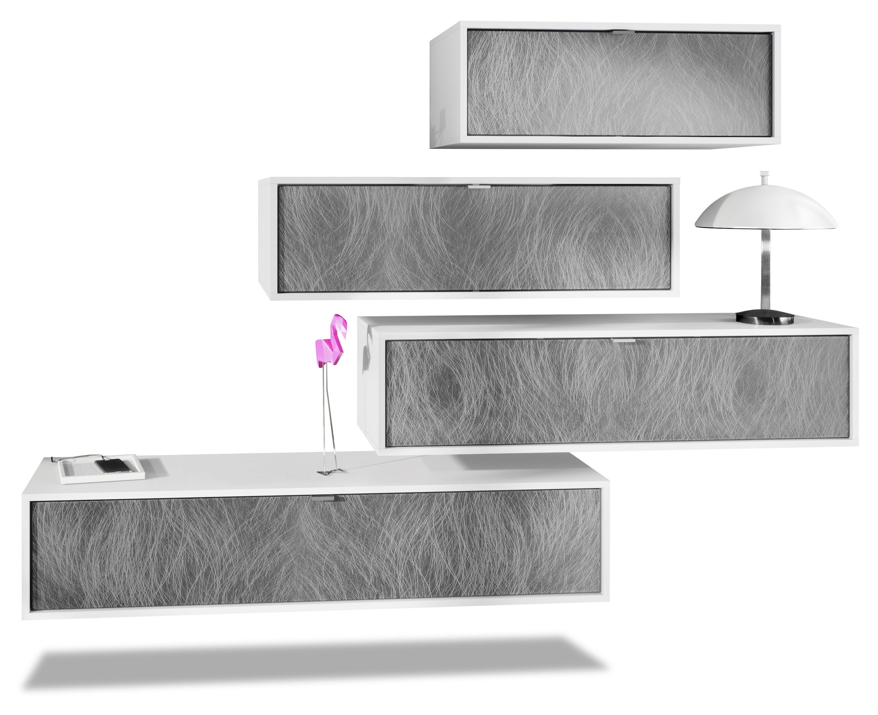 Der Korpus der verschiedenen TV Boards hat die Farbe Weiß matt. Um der Wohnwand einen futuristischen Stil zu verleihen, werden alle Teile hängend an der Wand befestigt. Dies ist gerade dann praktisch, wenn auf dem Boden nicht genügend Platz für stehende Möbel verfügbar ist.