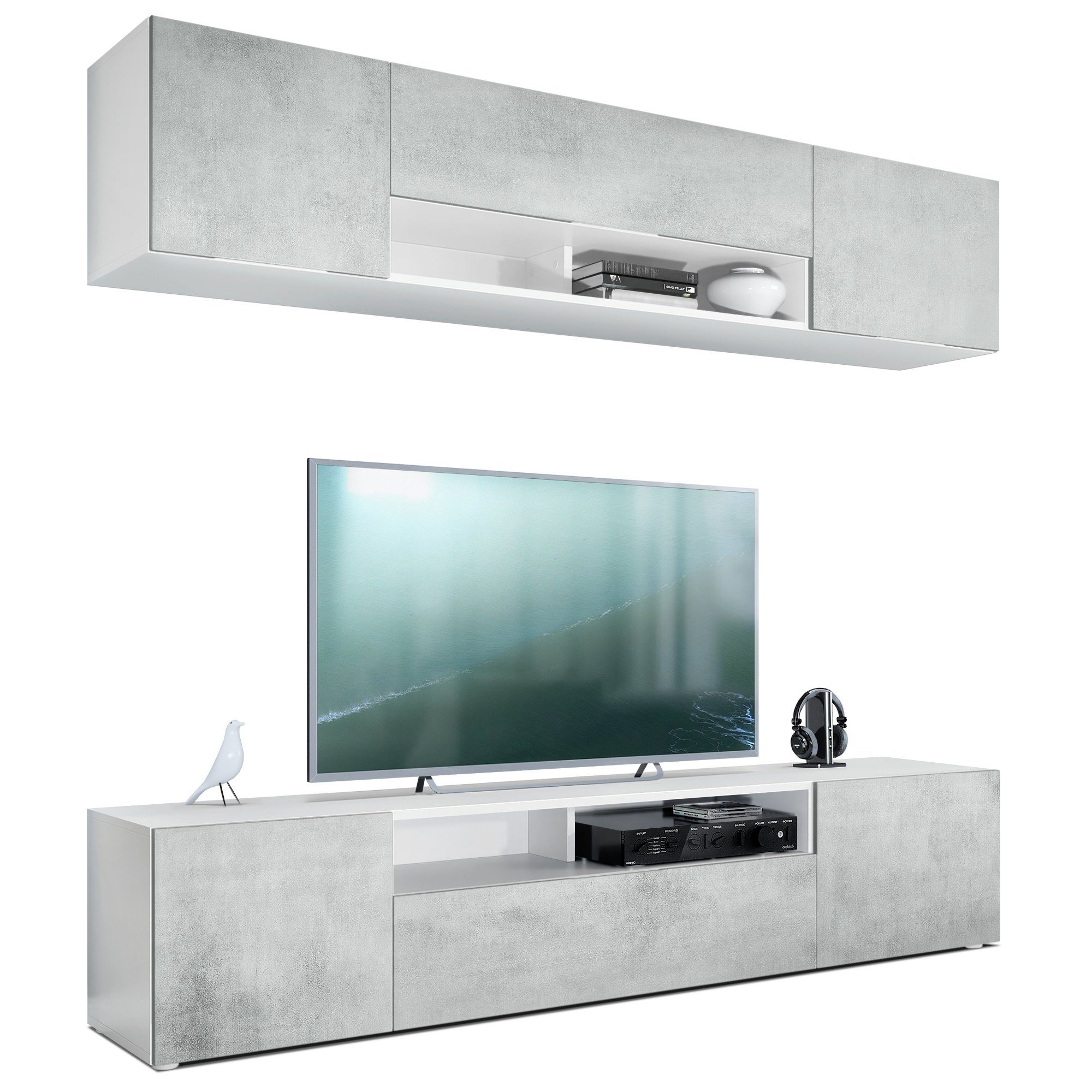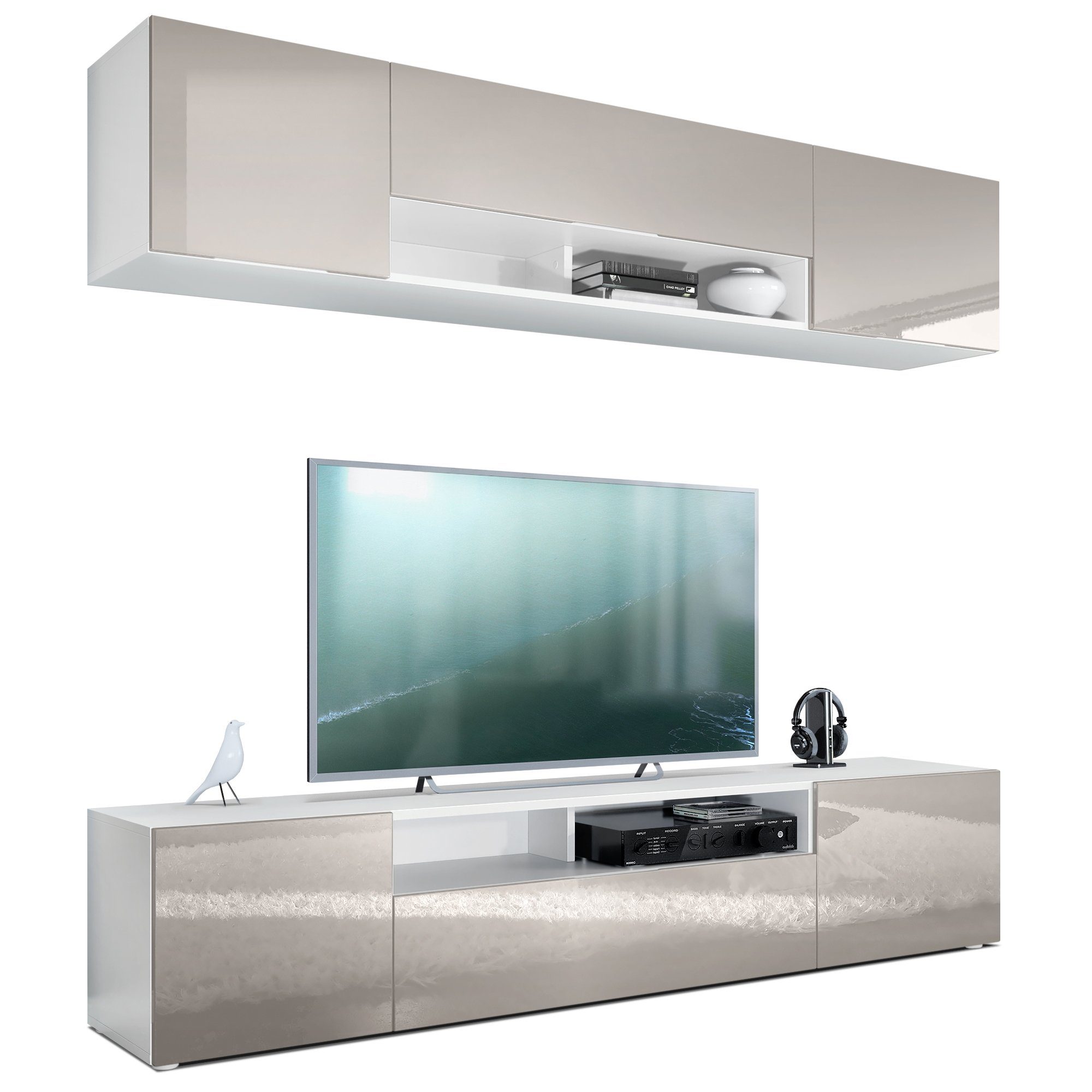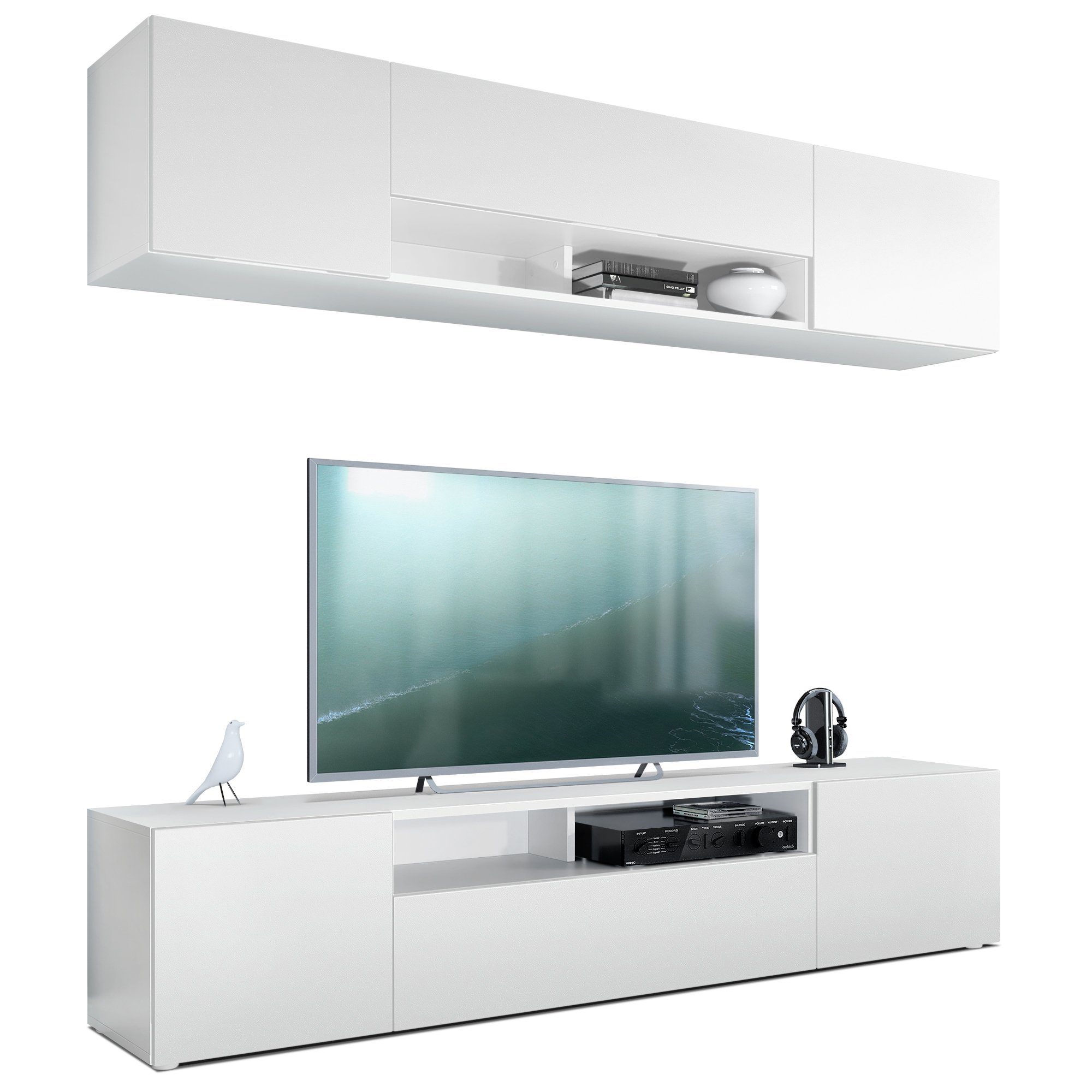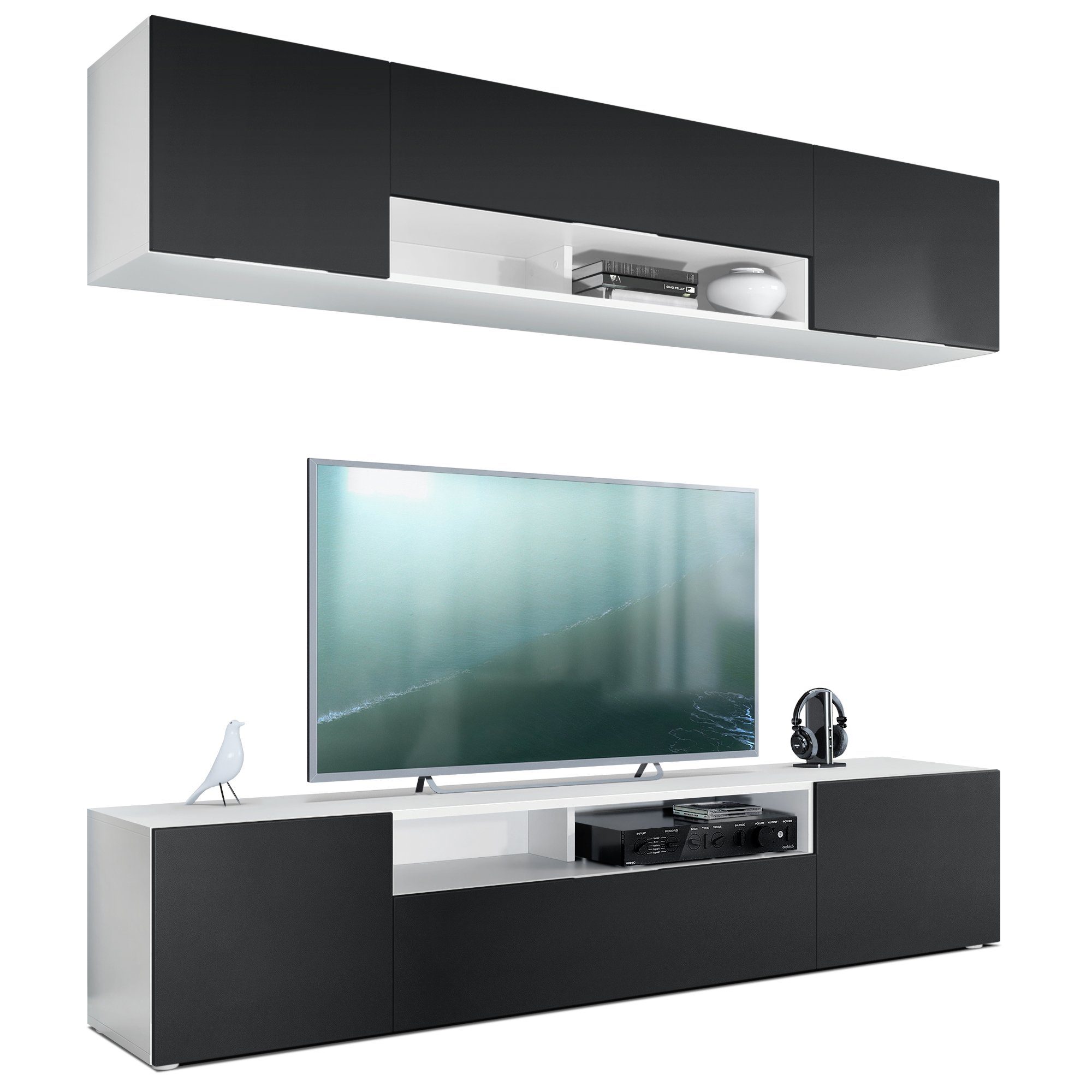 Die Wohnwand Mogan besteht aus zwei identischen Lowboards: Eins wird auf dem Boden platziert, das andere kommt umgedreht darüber an die Wand. Zwischen den zwei Elementen kann so beliebig Platz für jede Art von Fernseher gelassen werden.