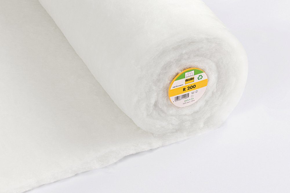 Vlieseline R 200 – Volumenvlies, Breite ca. 155 cm, Gewicht ca. 200 g/m². Eine Meterware aus 100 % recyeltem Polyester, nachhaltig. Ein schweres und extrem bauschiges Volumenvlies, das eingenäht werden kann. Das Volumenflies ist waschbar bei 40 °C Feinwäsche, kuschelig mit guter Wärmeisolation, formstabil und atmungsaktiv. Perfekt geeignet für warme Kleidung oder als Patchwork- und Quilteinlage. Das Vlies wird untergelegt und von Hand oder mit der Nähmaschine eingenäht. Der Quiltabstand sollte ca. 15 – 20 cm betragen.