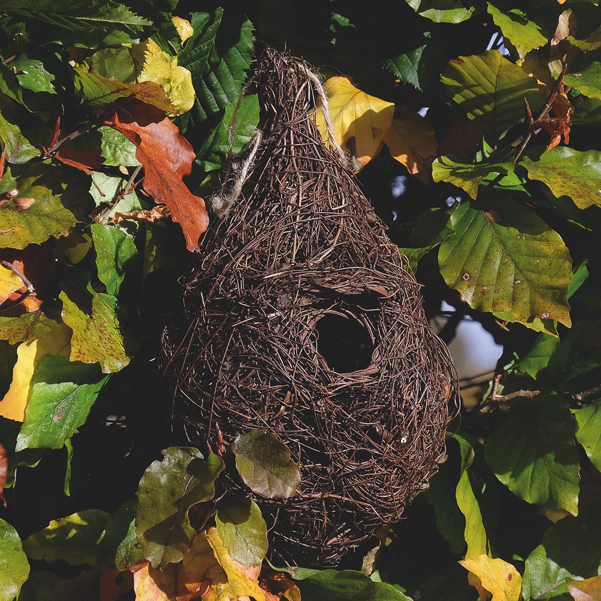 Sehr einladend sieht dieses Vogelnest für kleine Vögel aus, nicht wahr Es mutet ein wenig wie ein Eichhörnchen-Kobel an und besteht aus Reisig, das mit einem Drahtgeflecht zusammengehalten wird. In das eiförmige Nest können sich dank der kleinen Öffnung nur Vögel wie Kleiber, Meisen, Gartenrotschwänze und Zaunkönige zurückziehen. In der sicheren, wind- und wettergeschützten Höhle können die Vögel nisten, schlafen und ihre Jungtiere versorgen. Solche »gemütlichen« Rastplätze können für kleine Vögel zum Beispiel auch bei rauen Wetterbedingungen lebensrettend sein. In so einem Schutzraum wie diesem Nest können die Tiere dann in Ruhe auf besseres Wetter warten, frieren nicht so stark und sparen dadurch Energiereserven. Und Sie können Ihren fliegenden Besuchern die Nisthöhle auch ganz einfach zur Verfügung stellen, denn der englische Hersteller hat bereits rückseitig zwei Befestigungsschlaufen aus dickem Draht in das Reisiggeflecht integriert. So können Sie das Nest zum Beispiel in einen Busch, in eine Hecke oder eine efeubewachsene Wand einbinden. Im Frühjahr werden die Tiere es Ihnen wahrscheinlich danken! Und vielleicht zwitschern und piepsen dann eines Tages kleine Blaumeisen in Ihrem Garten oder der Zaunkönig-Nachwuchs lässt von sich hören ...