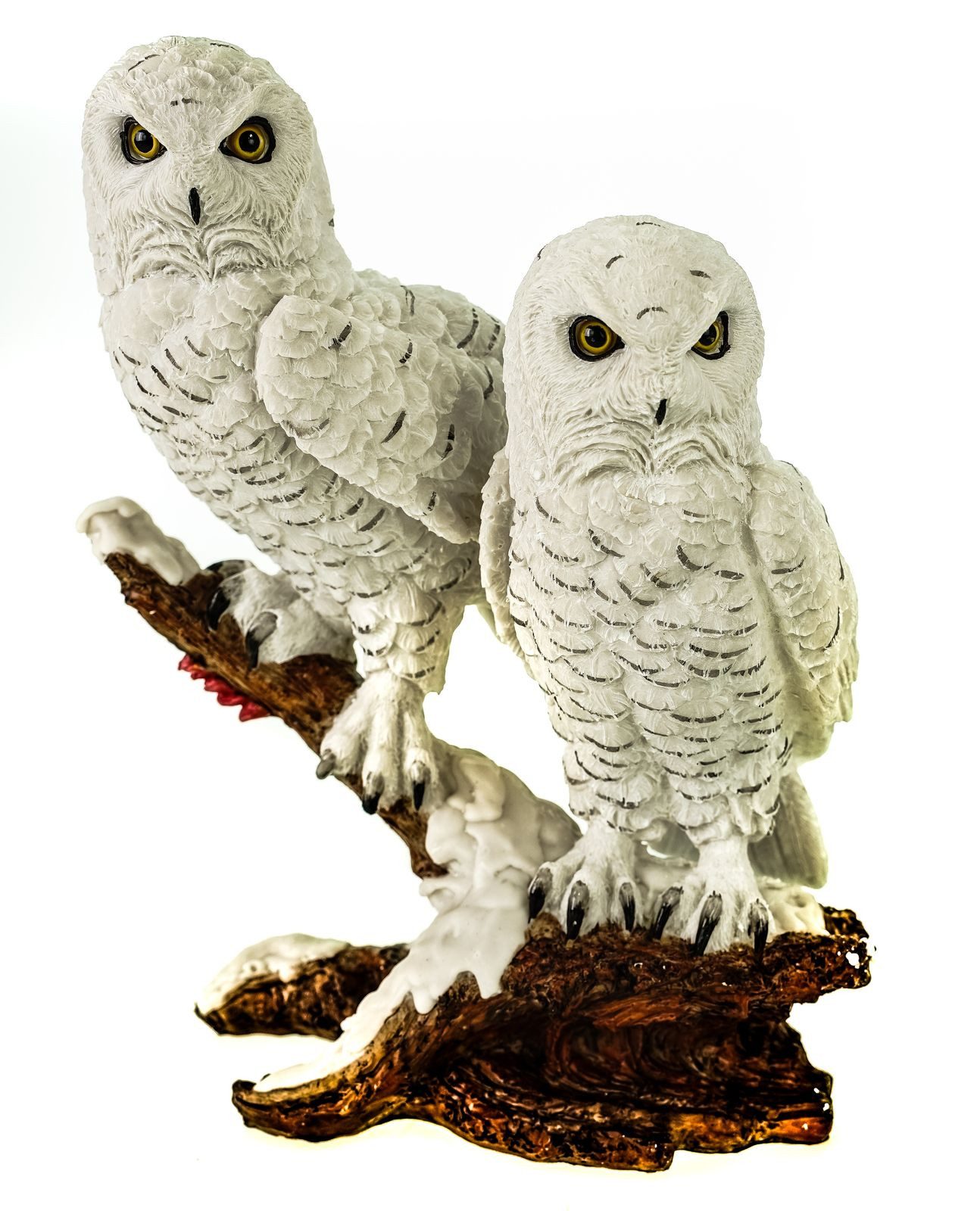 Detailreiche Dekofigur in Form eines Schneeeulenpärchens auf einem Ast sitzend