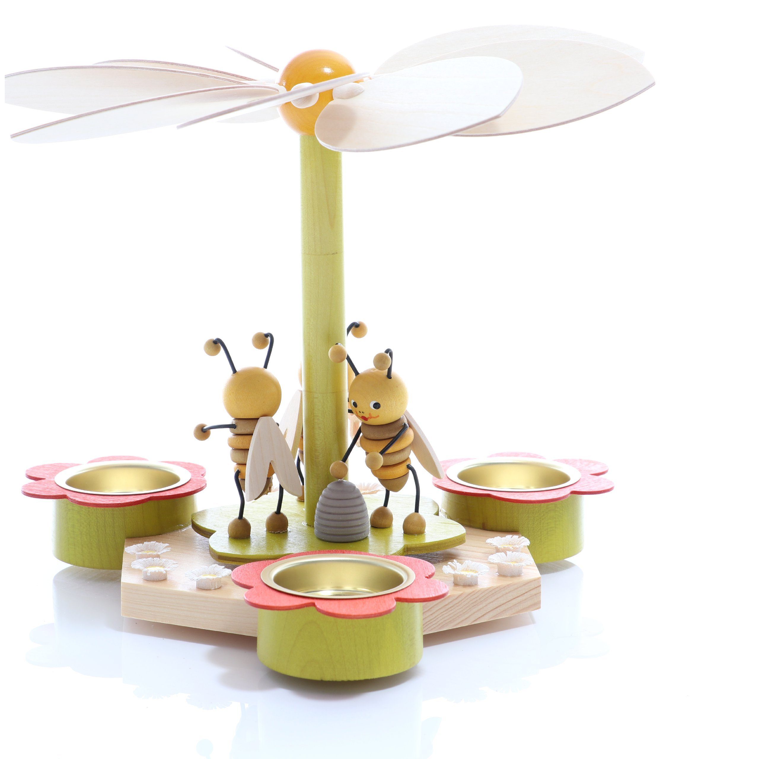 Tischpyramide Bienen mit Waben und Teelichter Mit dieser tollen Pyramide holen Sie sich ein Stück Erzgebirge in Ihre Wohnung. Sie hat eine Размер von 18,5 cm und wird in verschiedenen Arbeitsschritten komplett im Erzgebirge in einer Firma mit langer Tradition gefertigt. Auf dem Teller drehen sich 3 kleine Bienen mit ihren Waben voller Honig. Angetrieben wird die Pyramide mit 3 Teelichtkerzen dafür hat die Pyramide 3 Messingtüllen. Die Figuren und das Gestell der Pyramide sind aus verschiedenen heimischen Hölzern hergestellt und farbig gestaltet BxHxT 23x18,5x23cm NEU |