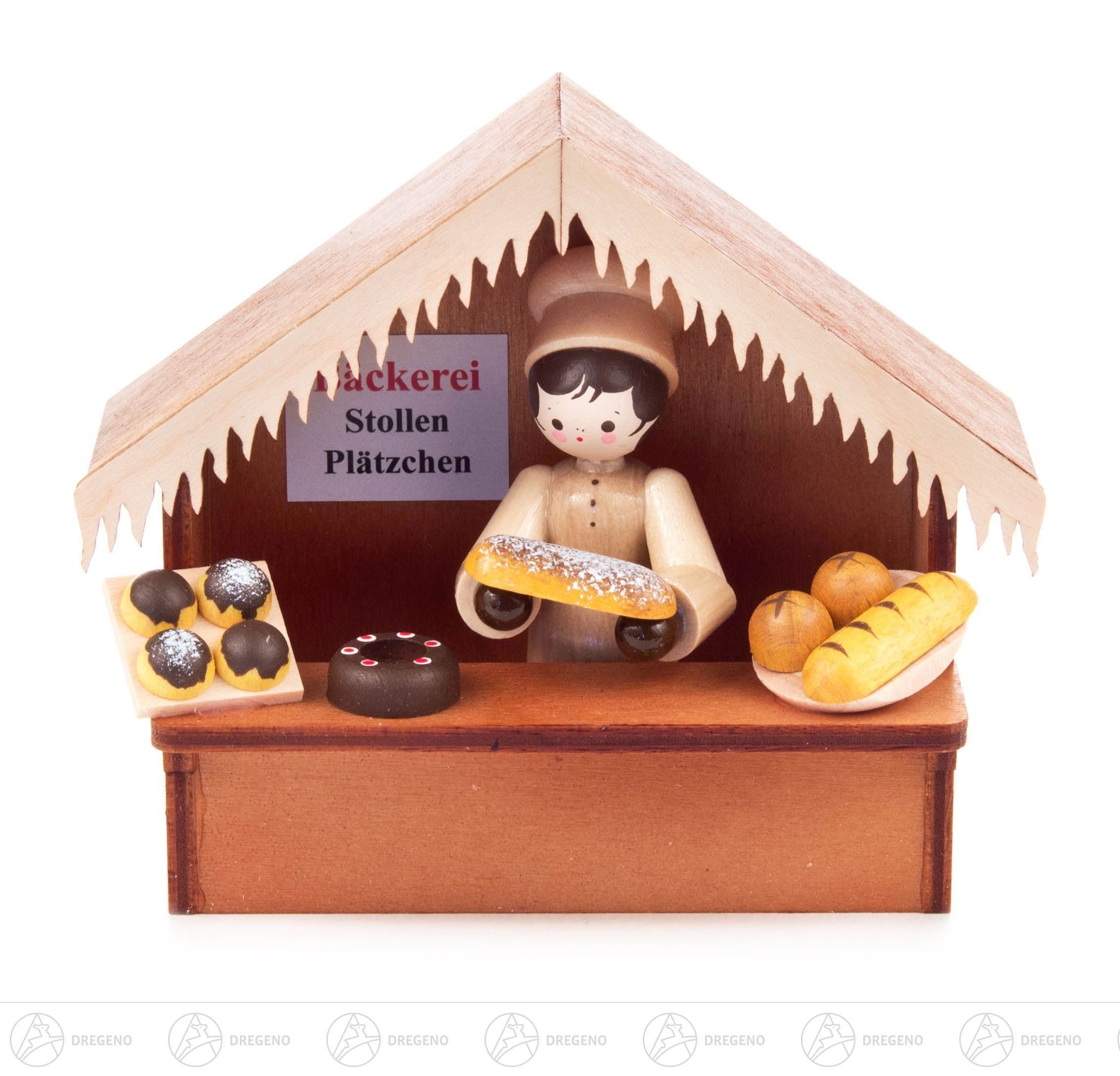 Dregeno Erzgebirge Weihnachtsfigur Weihnachtliche Miniatur Weihnachtsmarktbude Bäckerei Höhe ca 7,5 cm