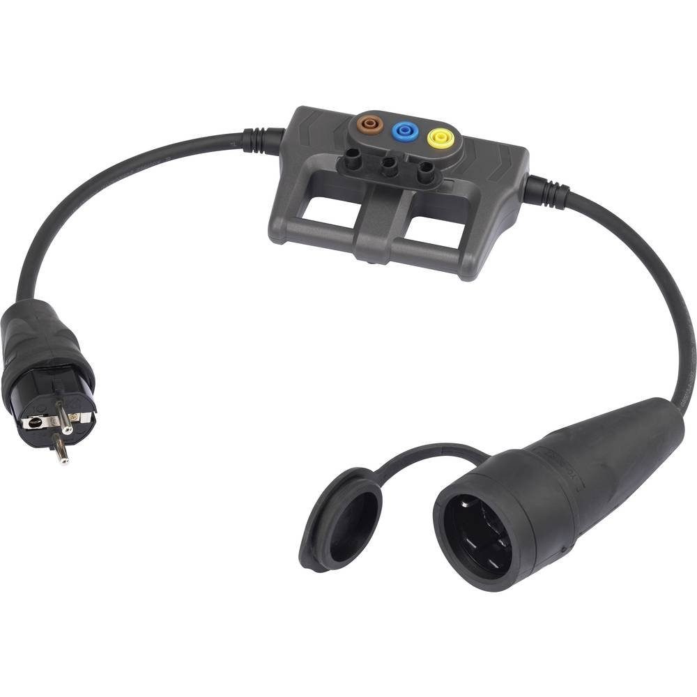 Der Adapter ermöglicht die unkomplizierte Wechselstrom- und Wechselspannungsmessung an Geräten mit angeschlossenem Netzstecker. Der Adapter wird einfach zwischen Gerät und Steckdose gesteckt. Es können Einzelströme der Phase L und des Neutralleiters N berührungslos abgegriffen werden. Die isolierten Messstege sind für die meisten AC-Stromzangen geeignet. Zusätzlich stehen Sicherheitsmessbuchsen zum direkten Messen der einzelnen Leiter z. B. Spannungsmessung zur Verfügung..