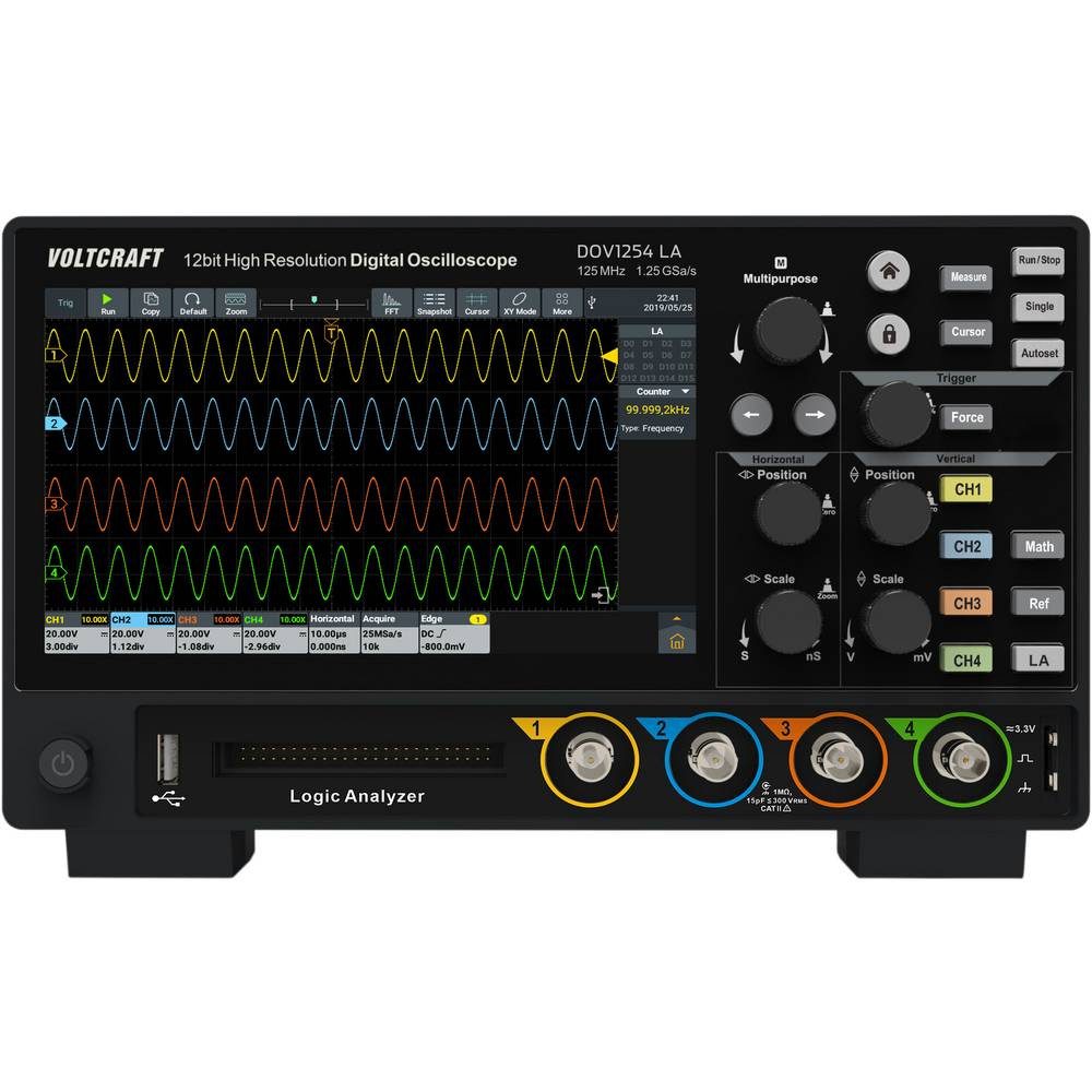 Hochwertig, innovativ und kompakt Die DOV-Oszilloskop-Serie von Voltcraft besticht durch eine ganze Reihe technischer Highlights und höchsten Bedienungskomfort: Ein Analog-Digital-Wandler mit 12-bit-Auflösung gehört ebenso zur Grundausstattung wie USB-, LAN- und HDMI-Schnittstellen. Im Zentrum steht das 7-Zoll-Touchdisplay, mit einer Auflösung von 1024 x 600 Pixeln. Es reagiert nicht nur auf Berührungen, sondern auch auf Gesten und macht damit umständliche Menübedienung weitestgehend unnötig. Hervorragende technische Daten Все digitalen DOV-Oszilloskope von Voltcraft arbeiten mit einer maximalen Abtastrate von 1,25 GSa/s. Die Echtzeit-Erfassung liegt bei 50.000 wfms/s und die Segmenterfassung bei 700.000 wfms/s, wodurch auch unregelmäßige Signale schnell und exakt erfasst werden können. Die horizontale Abtastgeschwindigkeit reicht von 1 ns/div bis 1000 s/div (1-2-5 Schritt). Zahlreiche Triggerfunktionen Eine der Stärken der DOV-Serie von Voltcraft liegt in den umfangreichen Triggerfunktionen. Auch schwer zu trigggernde Signale können dank der Triggertypen Flanke, Video, Impuls, Steigung, Runt, Fenster, Timeout, Nth, Logik, RS232/UART, I2C, SPI, CAN, LIN-Trigger eingefangen werden. Spezifikationen des Voltcraft DOV1254 LA Das DOV1254 LA verfügt über 125 MHz Bandbreite und vier analoge Eingänge. Die Signalaufzeichnungslänge beträgt 100 M und für übersichtliche Darstellung und Auswertung ist die Echtzeit-Signalwellenanzeige auf dem PC möglich. Als Trigger-Quellen stehen die vier Eingänge CH1 bis CH4 sowie der 16-Kanal-Logik-Analyzer zur Verfügung. Es kann zwischen den Erfassungsmodi Sample, Spitze, hohe Auflösung, Mittelwert und Segmentierung gewählt werden. Die vertikale Empfindlichkeit ist von 200 µV/div bis 10 V/div einstellbar. Lieferpaket mit Zubehör Das Voltcraft DOV1254 LA wird mit USB Type-C Netzteil, USB-Kabel, vier Prüfspitzen sowie zwei Probenjustierset geliefert.
