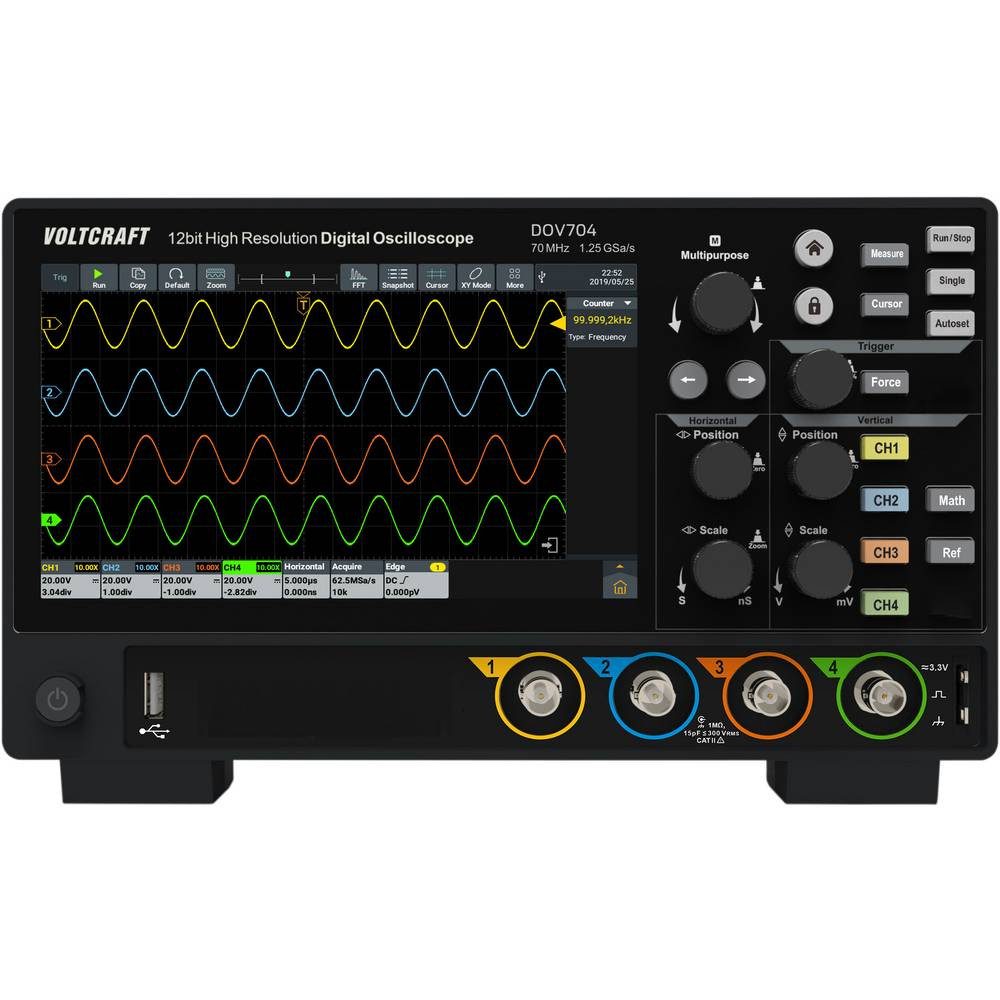 Hochwertig, innovativ und kompakt Die DOV-Oszilloskop-Serie von Voltcraft besticht durch eine ganze Reihe technischer Highlights und höchsten Bedienungskomfort: Ein Analog-Digital-Wandler mit 12-bit-Auflösung gehört ebenso zur Grundausstattung wie USB-, LAN- und HDMI-Schnittstellen. Im Zentrum steht das 7-Zoll-Touchdisplay, mit einer Auflösung von 1024 x 600 Pixeln. Es reagiert nicht nur auf Berührungen, sondern auch auf Gesten und macht damit umständliche Menübedienung weitestgehend unnötig. Hervorragende technische Daten Все digitalen DOV-Oszilloskope von Voltcraft arbeiten mit einer maximalen Abtastrate von 1,25 GSa/s. Die Echtzeit-Erfassung liegt bei 50.000 wfms/s und die Segmenterfassung bei 700.000 wfms/s, wodurch auch unregelmäßige Signale schnell und exakt erfasst werden können. Die horizontale Abtastgeschwindigkeit reicht von 1 ns/div bis 1000 s/div (1-2-5 Schritt). Zahlreiche Triggerfunktionen Eine der Stärken der DOV-Serie von Voltcraft liegt in den umfangreichen Triggerfunktionen. Auch schwer zu trigggernde Signale können dank der Triggertypen Flanke, Video, Impuls, Steigung, Runt, Fenster, Timeout, Nth, Logik, RS232/UART, I2C, SPI, CAN, LIN-Trigger eingefangen werden. Spezifikationen des Voltcraft DOV704 Das DOV704 verfügt über 70 MHz Bandbreite und vier analoge Eingänge. Die Signalaufzeichnungslänge beträgt 50 M und für übersichtliche Darstellung und Auswertung ist die Echtzeit-Signalwellenanzeige auf dem PC möglich. Als Trigger-Quellen stehen die vier Eingänge CH1 bis CH4 zur Verfügung und es kann zwischen den Erfassungsmodi Sample, Spitze, hohe Auflösung, Mittelwert und Segmentierung gewählt werden. Die vertikale Empfindlichkeit ist von 500 µV/div bis 10 V/div einstellbar. Lieferpaket mit Zubehör Das Voltcraft DOV704 wird mit USB Type-C Netzteil, USB-Kabel, vier Prüfspitzen sowie zwei Probenjustierset geliefert. Des Впередen gehören eine Software mit englischer Anleitung auf CD, eine Kurzanleitung sowie das Sicherheitsdatenblatt zum Paket..