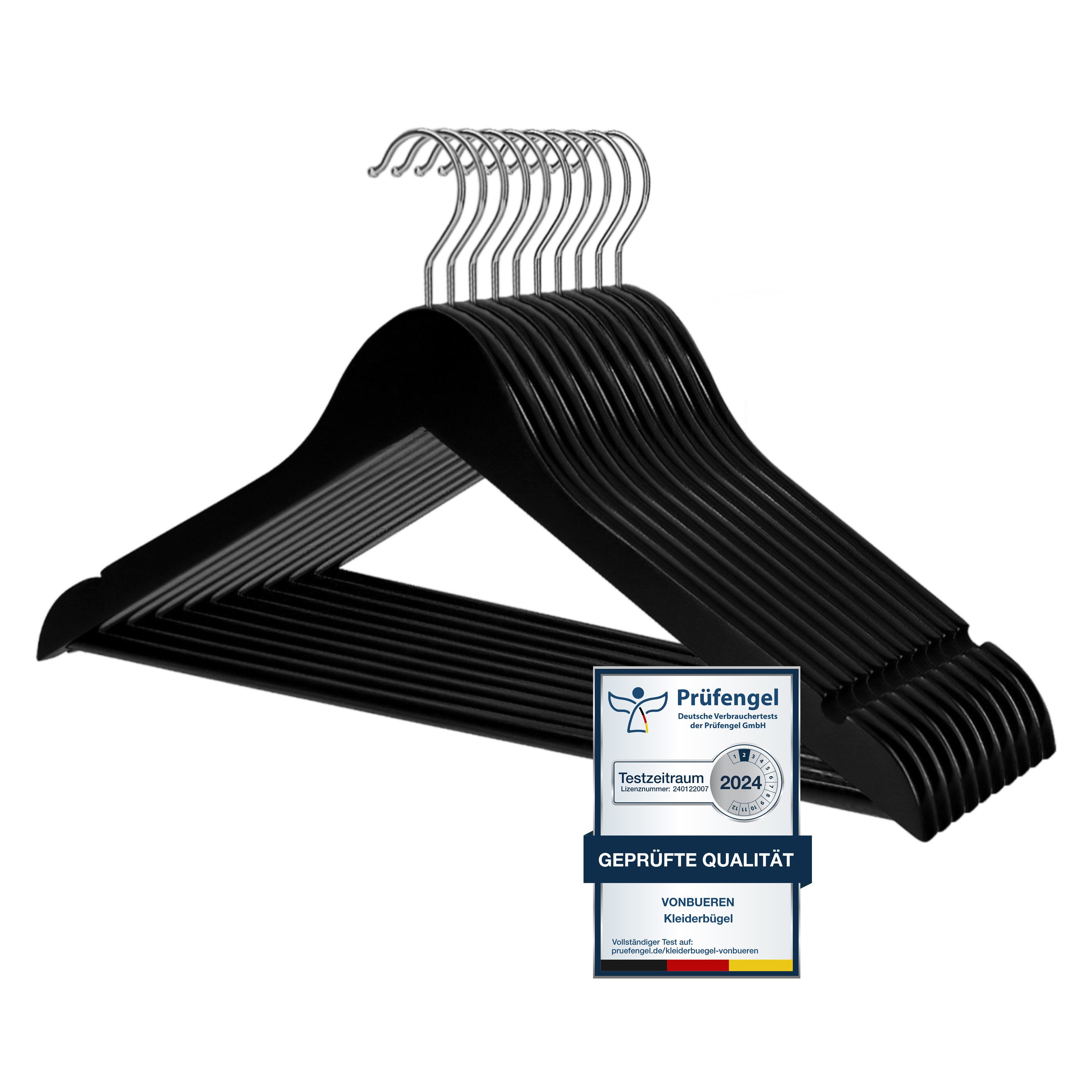 Material: Holz. Длина: ca. 44,5 x 22 cm. Farbe: schwarz. Das moderne Design der Kleiderbügel ist für jede Garderobe und für jeden Kleiderschrank geeignet. Die Holzbügel sind vielseitig einsetzbar, denn sie besitzen sowohl einen Steg für Hosen als auch Kerben für Rock- und Hosenhänger oder für Träger von Oberteilen. Aufgrund der guten Stabilität der Holzkleiderbügel können auch mehrere Teile auf einem Bügel oder schwere Jacken aufgehängt werden. Die Form der Bügel sorgt dafür, dass sich zum Beispiel der Schulterbereich Ihrer Hemden nicht mehr ausbeult. Der um 360 Grad drehbare Haken ermöglicht ein Wenden der Kleidung im Schrank.