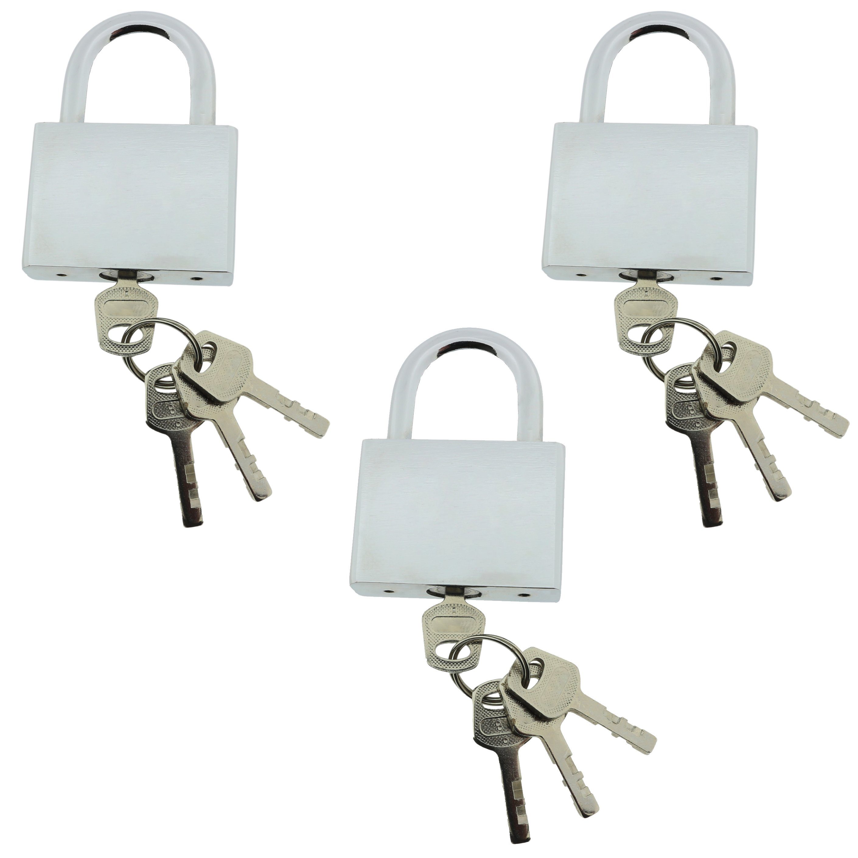 3 x verschiedenschließende Sicherheits-Vorhängeschlösser aus Stahl mit gehärtetem Bügel inklusive je 4 gefrästen Schlüsseln pro Schloss.
