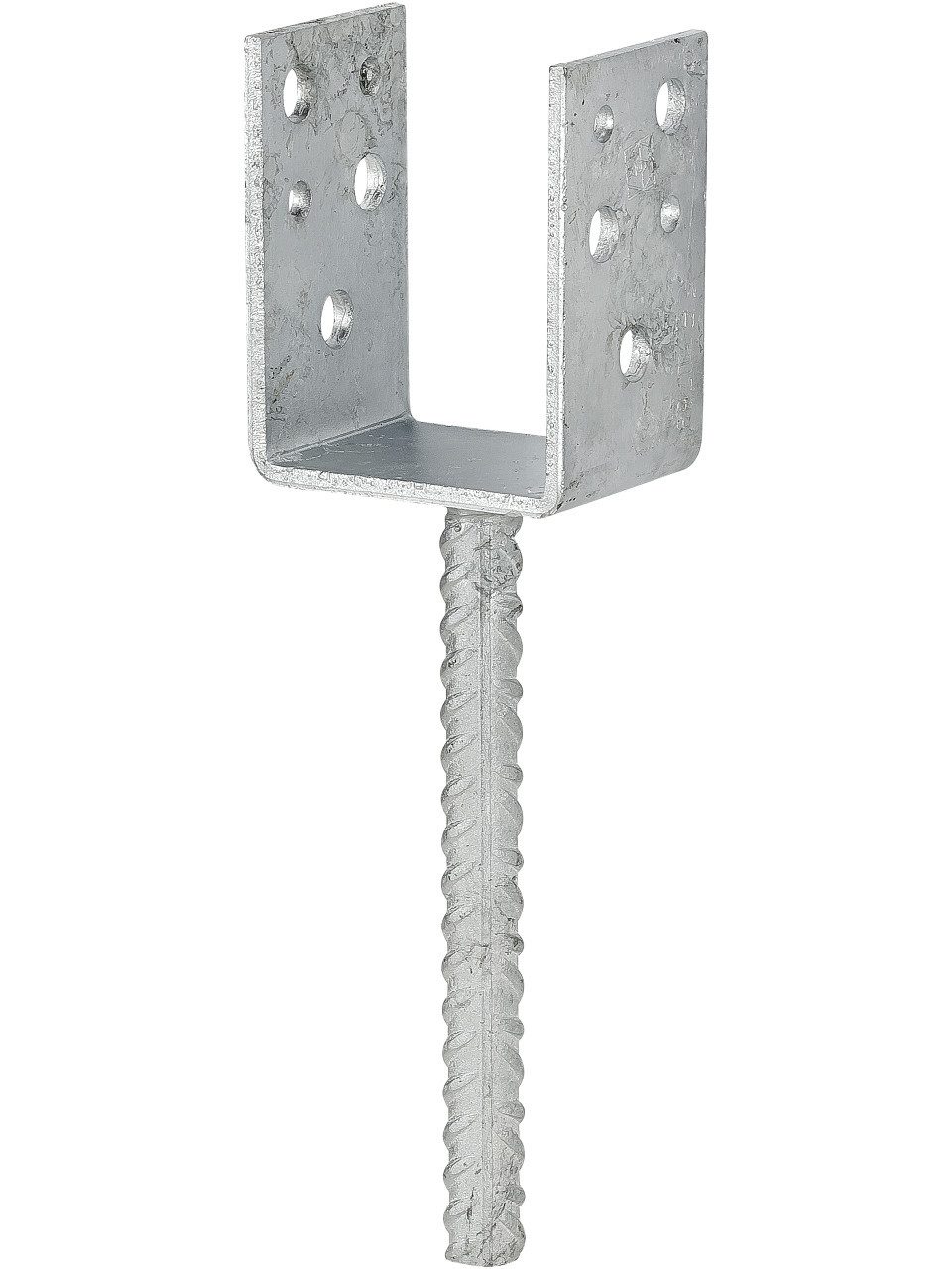 Hierbei handelt es sich um Stützenschuhe in U-Form mit Riffelstahldolle zum Einbetonieren in den Boden zur vertikalen Montage von Holzpfosten. Diese Stützenschuhe eignen sich für eher leichtere Holzbauten, die keiner direkten Windlast ausgesetzt sind.