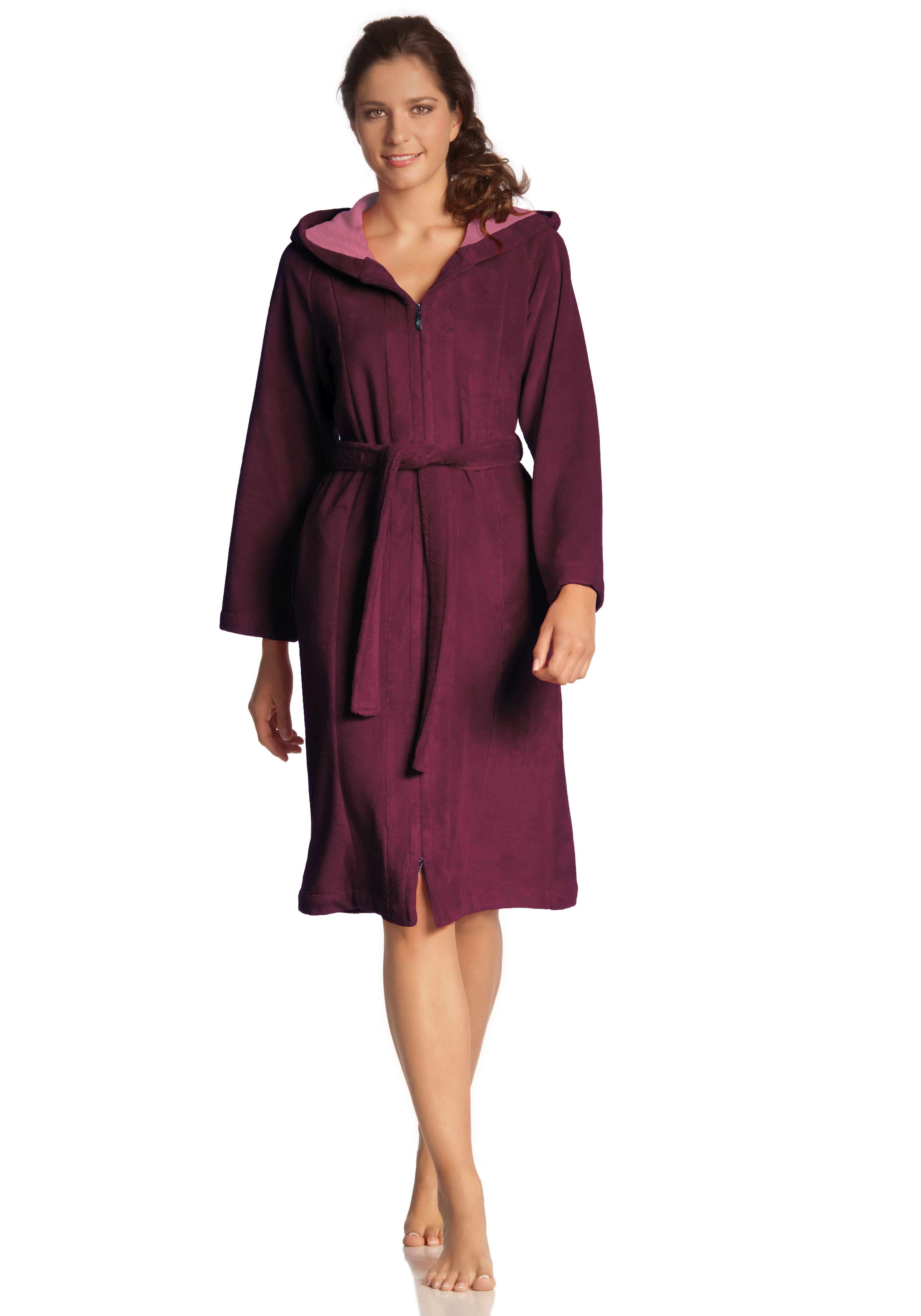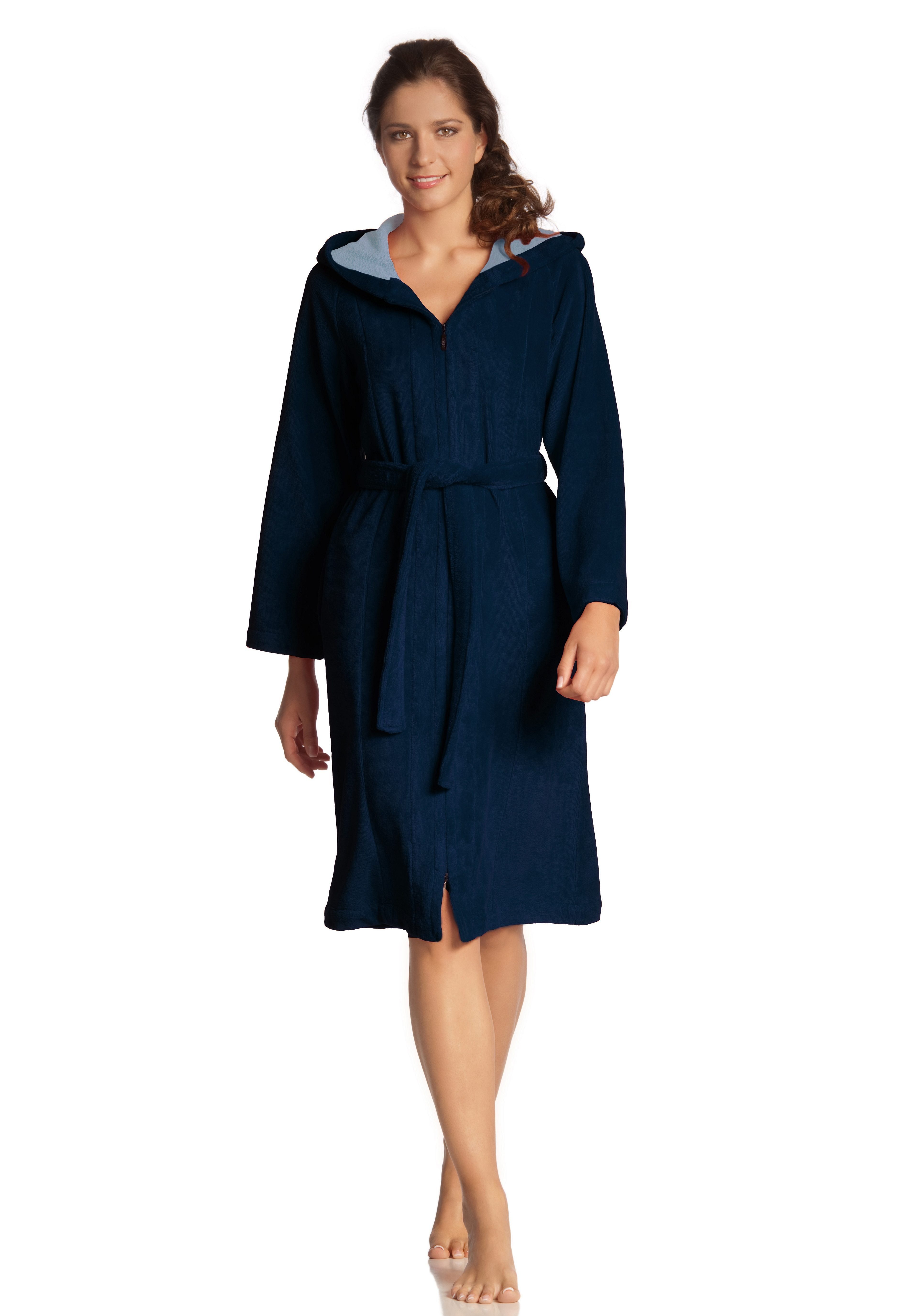 Ich wollte mir einen neuen Bademantel für die Sauna kaufen. An diesem gefallen mir der Reißverschluss und die Kapuze im helleren Blauton. Das Material ist mir für die Sauna allerdings zu flauschig und nicht saugfähig genug. Deshalb schicke ich ihn zurück. Ich bin 1,69 m groß und der Bademantel endet ungefähr bei der Mitte der Unterschenkel.