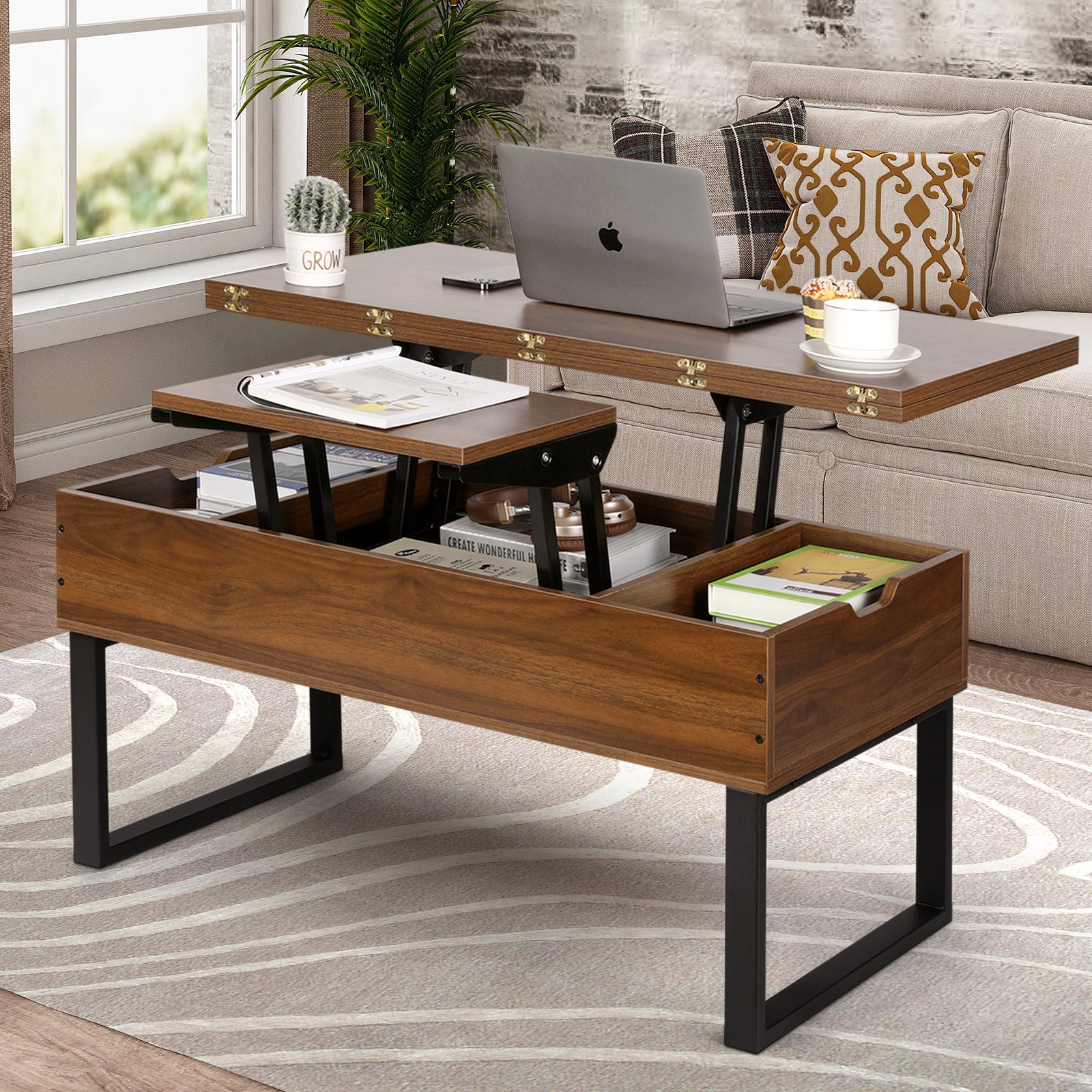 Funktionen: 3 Nutzungsarten: Couchtisch/Esstisch (8 Personen)/Doppelarbeitsplatz; Höhenverstellbarer Mechanismus; Integriertes Staufach für Zeitschriften & Bücher