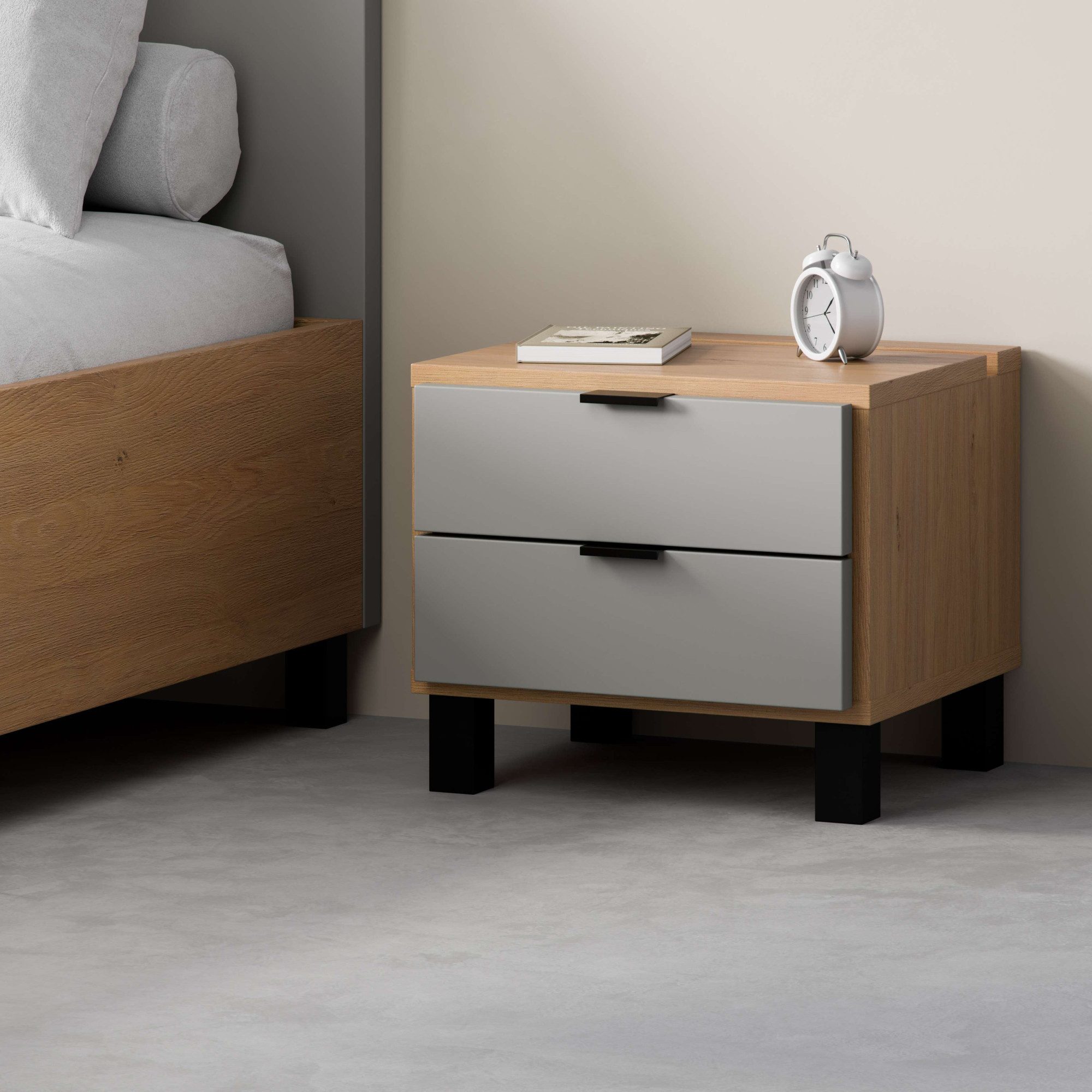 Nützliche Ablagefläche und angesagtes Einrichtungselement in einem — der Nachttisch »SIMPLE, obere Schublade mit Beleuchtung, 2 Schubladen, Metallgriffe« von VOX.