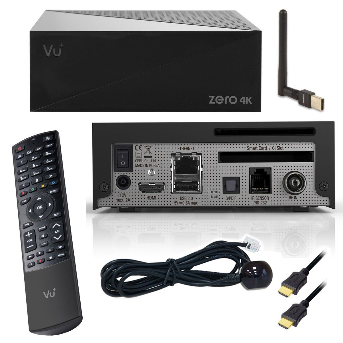 Lieferumfang | 1x VU+ ZERO 4K DVB-C/T2 UHD Receiver,1x Fernbedienung,2x Batterien (AAA),1x Netzteil (110-240V / 12V),1x Externer IR-Empfänger,1x HDMI Kabel,1x Quickmanual (DE, ENG, ESP, NL, FR, IT),1x PremiumX PX150-MEGA WLAN Stick |