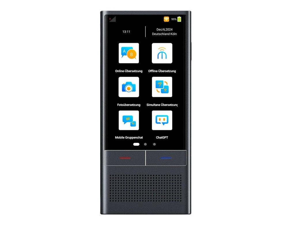 AUFNAHME-ÜBERSETZUNG: Man kann eine Rede für bis zu 1 Stunde aufnehmen und in 13 Sprachen übersetzen und lesen. Die Funktion wird für die Übersetzung der Unterrichte, Vorlesungen oder Nachrichten benutzt. Es kann auch als ein Diktiergerät verwendet werden.