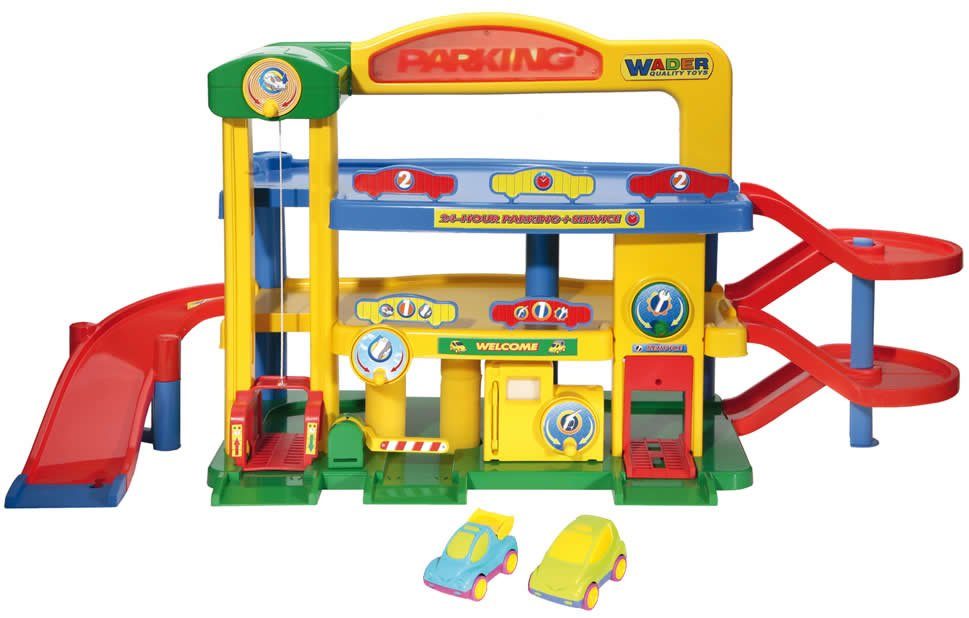 Ausgestattet mit funktionstüchtiger Tankstelle, Lift und Hebebühne welche über die griffigen runden Drehknöpfe bedient werden können sowie einer Schranke, einer Waschanlage und Straßenanschlüsse für die Erweiterung durch WADER Spielstraßen bietet die Garage jede Menge Spielspaß auf 3 Spielebenen.