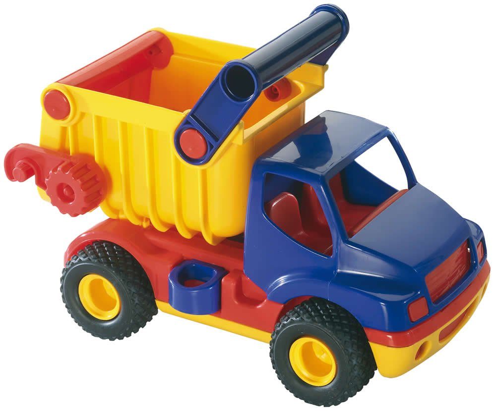 Ob beim Abtransport von Erde oder zur Anlieferung von Baumaterialien: Der WADER Muldenkipper ist der ideale Helfer für jede Baustelle. Durch das Endriegeln der Heckklappe und das Herausziehen des seitlichen Hebels kann die Mulde gekippt und das Ladegut entleert werden. Das Markenzeichen aller WADER CONSTRUCK-Fahrzeuge: Der Tragegriff, große griffige Hebel und Drehknöpfe für kleine Kinderhände sowie die extrem weichen und widerstandsfähigen Gummi-Reifen.