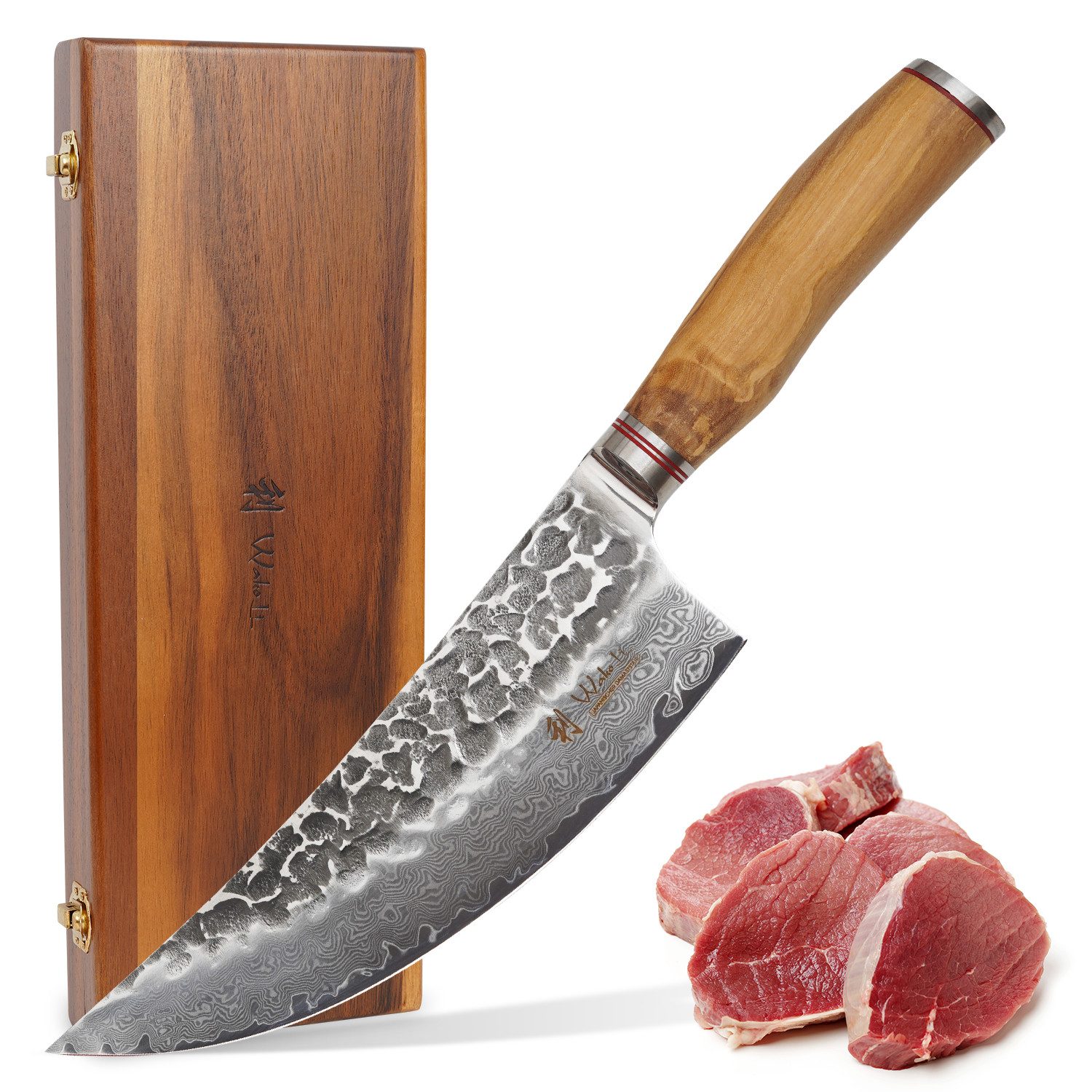 Der auffällige Hammerschlag auf der Klingenoberfläche reduziert die Anhaftung von Schnittgut und verleiht jedem Messer eine individuelle Optik. Der ergonomisch geformte Griff aus Olivenholz liegt angenehm in der Hand und bietet zuverlässige Kontrolle bei jeder Anwendung.
