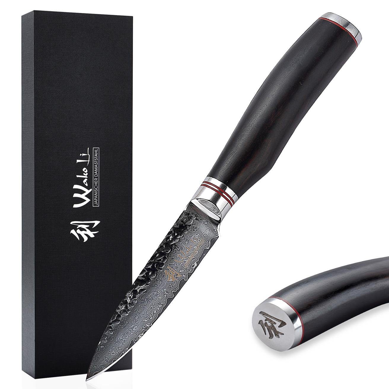 Die Klinge mit 9 cm Длина wird aus original japanischem Damaststahl mit 67 Stahllagen, VG-10 Stahlkern und einem Härtegrad von 60±2HRC gefertigt. Diese Stahllagen wurden mehrfach gewickelt, wodurch die Struktur aus unterschiedlichen Lagen jedes Messer zu einem einzigartigen Produkt macht.