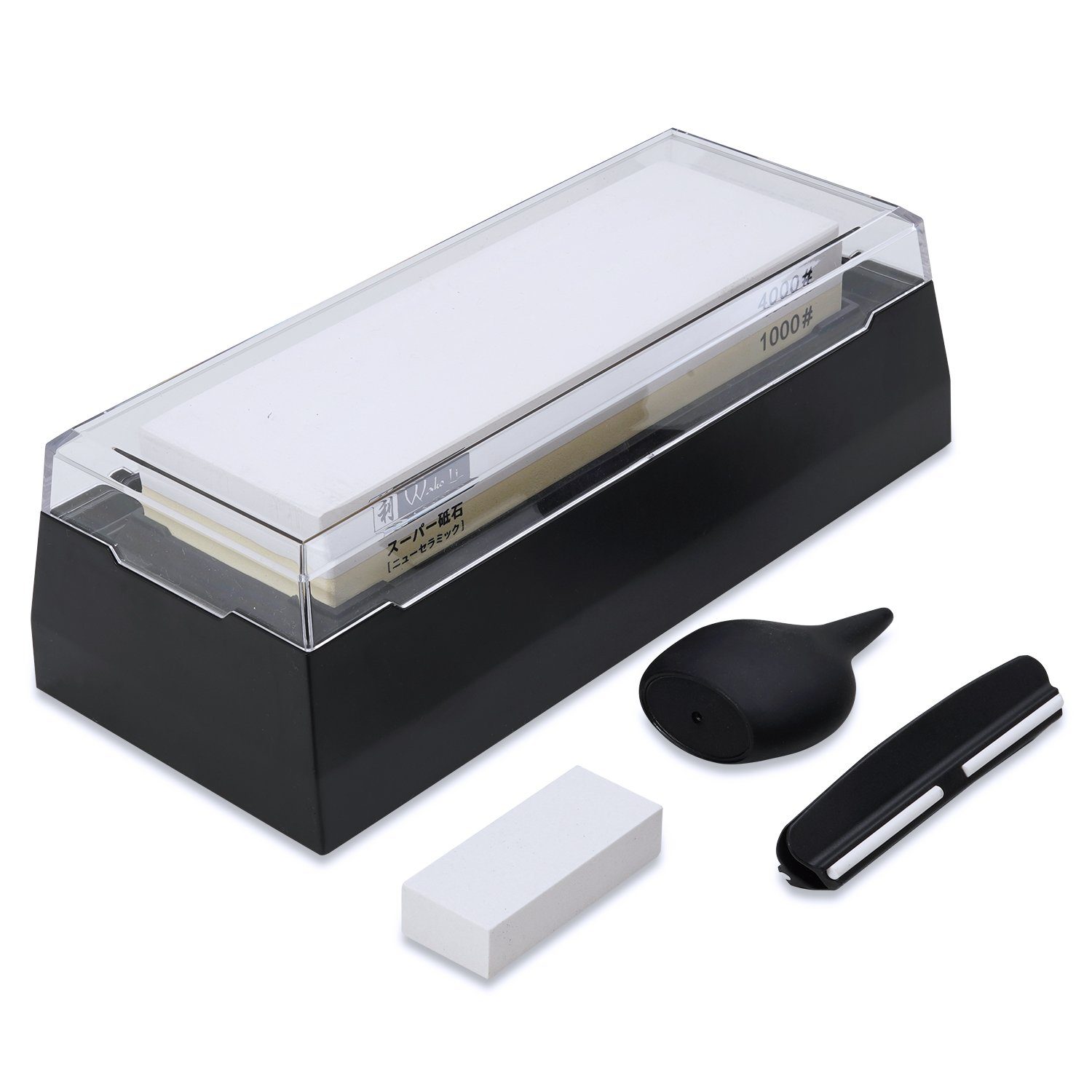 Im Set enthalten sind eine Schleifhilfe und ein Begradigungsstein, die für exakten Winkel und korrekte Ebenheit des Schleifsteins sorgen, dazu ein Wasserspender und eine Kunststoffbox für eine ordentliche Lagerung
