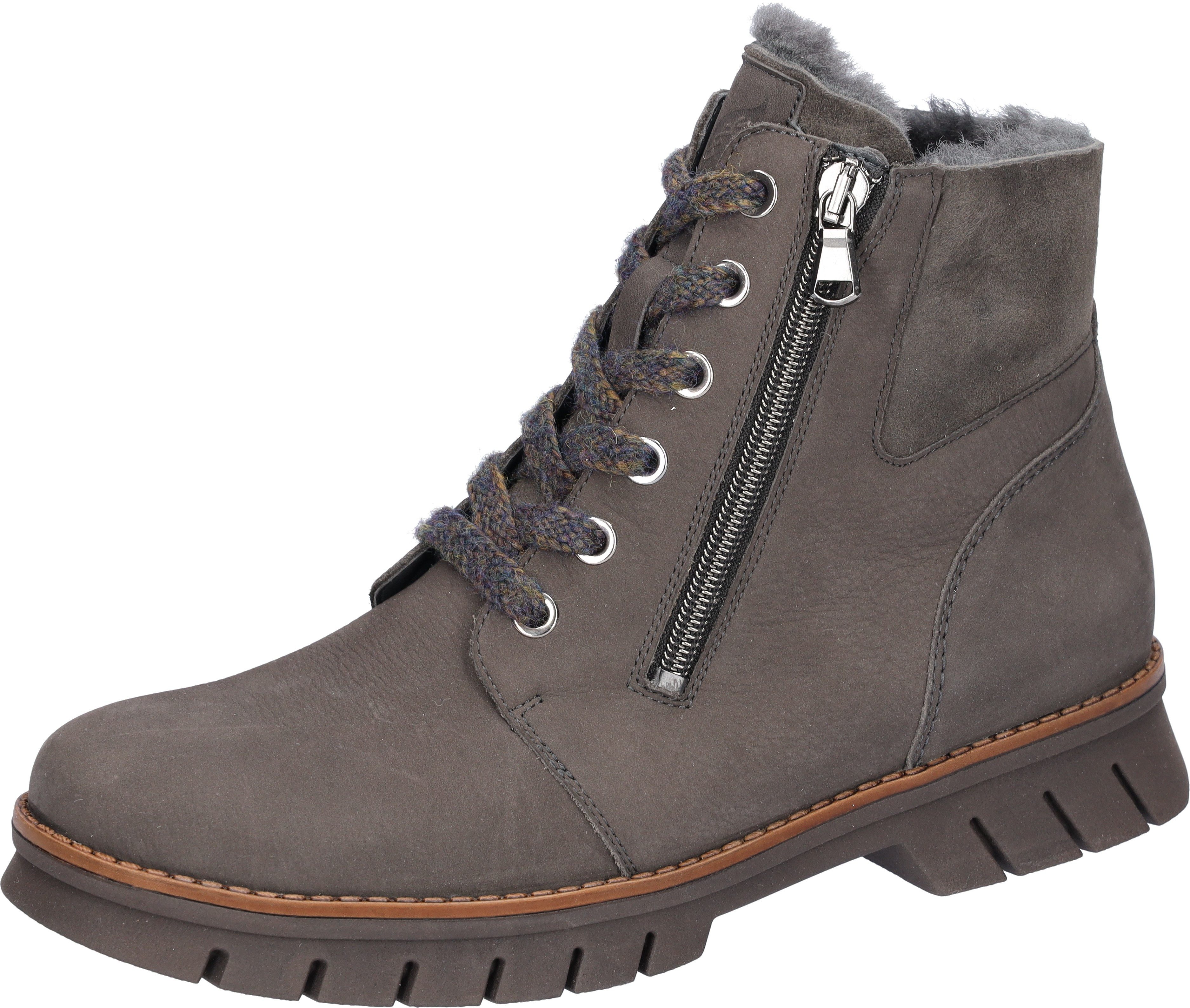 Das Obermaterial aus Lammfell und Nubukleder ist sehr fein und weich auf der Haut. Die Synthetik-Sohle der Winterstiefeletten ist profiliert und sorgt für mehr Rutschfestigkeit auf unebenem Untergrund. Innerhalb des Schuhs sorgt das Lammfell für warme Füße. Individuelle Einlagen oder orthopädische Sohlen können dank der herausnehmbaren Filz-Innensohle genutzt werden. Dank dem Blockabsatz und der runden Schuhspitze sind die Winterstiefeletten ideal für den Alltag und lange Tragezeiten. Diese Winterstiefeletten in Weite G bieten eine optimale Passform für Füße mit durchschnittlicher Breite.