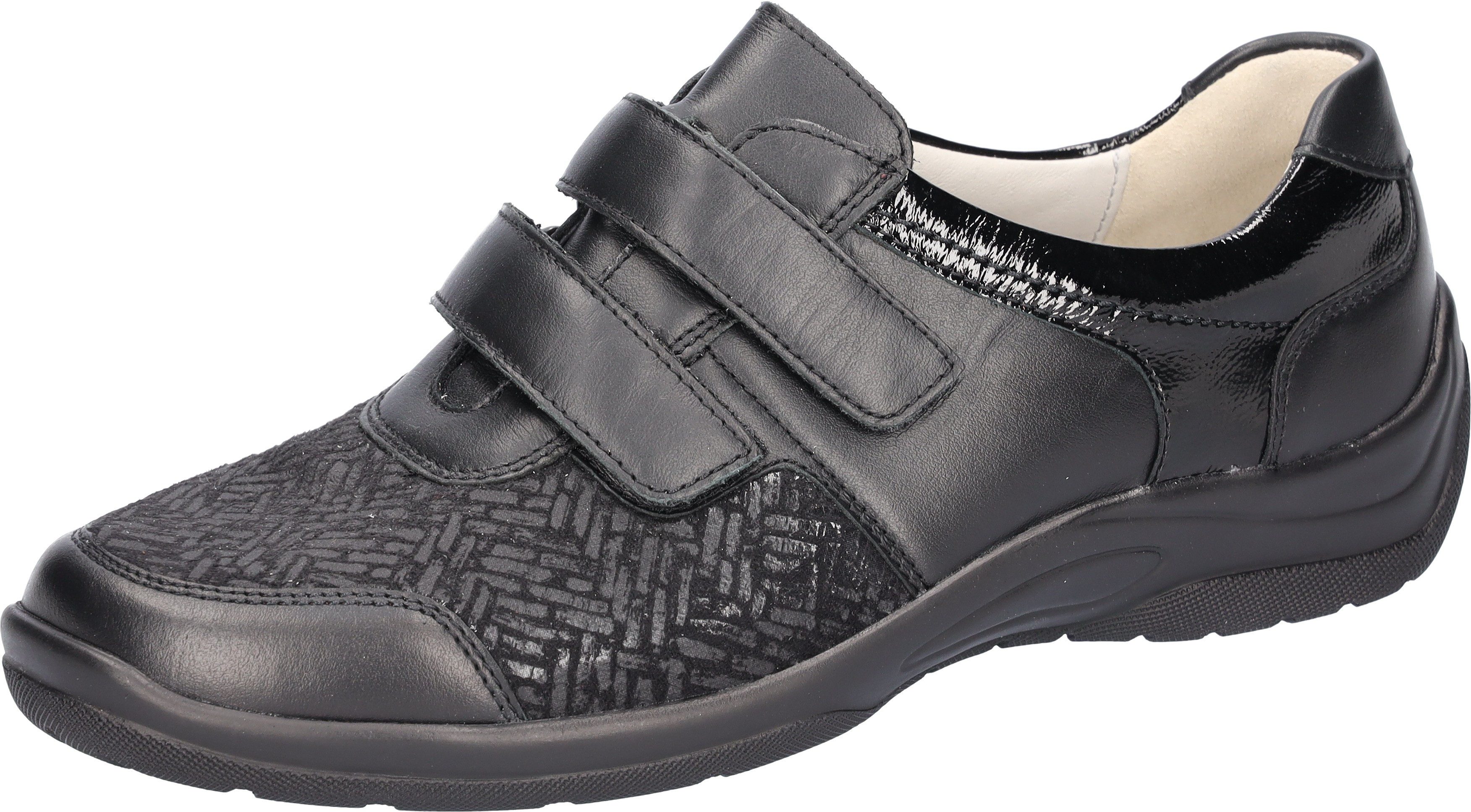 Das elastische Obermaterial besteht aus Lackleder, Nappaleder und Textil. Die Synthetik-Sohle der Klettschuhe ist profiliert und bietet dir mehr Rutschfestigkeit auf unebenem Untergrund. Die herausnehmbare Leder-Innensohle ermöglicht zusätzliche Flexibilität und erlaubt die Einbringung von individuellen Einlagen oder orthopädischen Sohlen. Der Keilabsatz ermöglicht eine größere Absatzhöhe, ohne den Komfort und die Stabilität zu beeinträchtigen. Diese Klettschuhe in Weite H sind für kräftigere, volle Füße geeignet.
