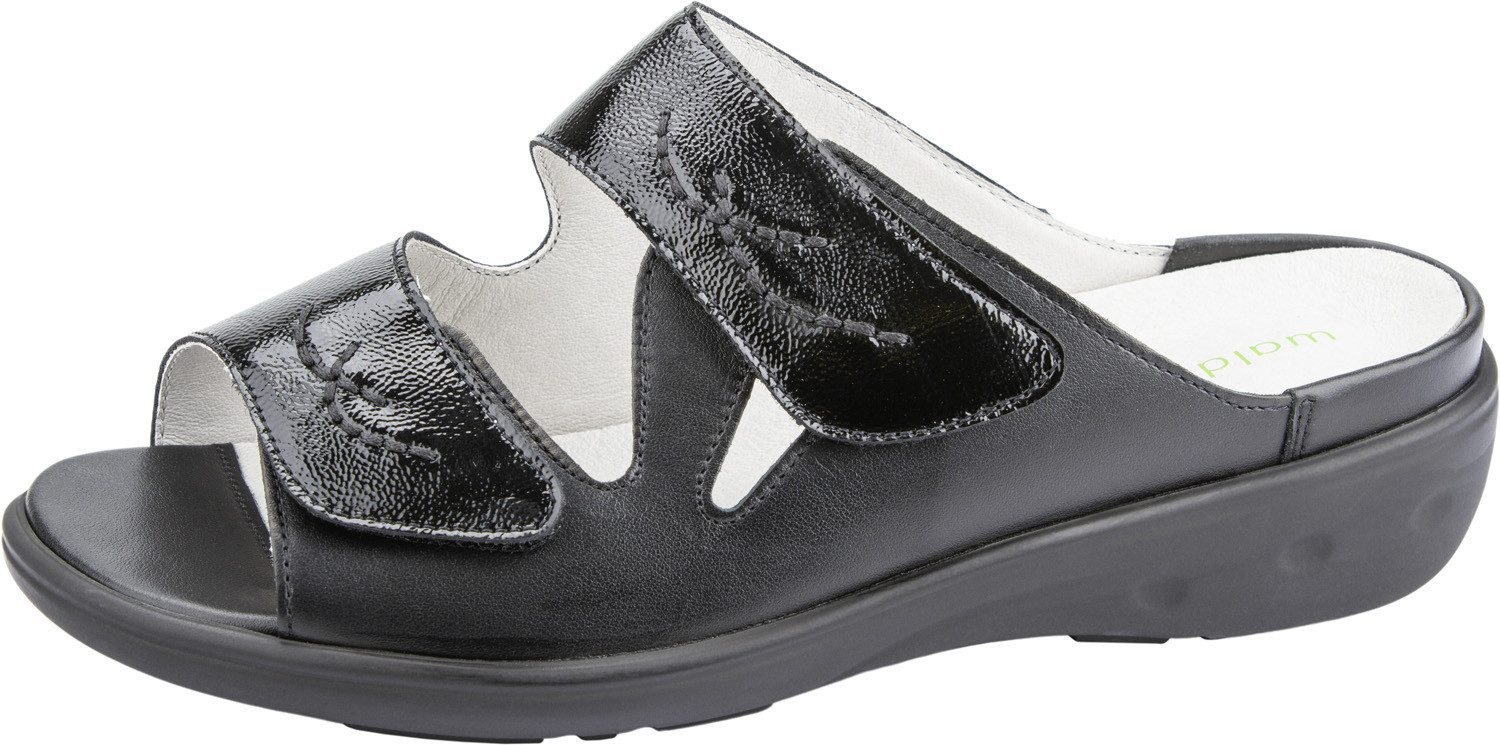 Mit dem Obermaterial aus Lackleder und Nappaleder sind die Schuhe glänzend und unempfindlich gegen Feuchtigkeit. Die Synthetik-Sohle der Pantoletten ist leicht profiliert und sorgt für mehr Rutschfestigkeit auf unebenem Untergrund. Die gepolsterte Leder-Innensohle sorgt für zusätzlichen Komfort bei jedem Schritt. Dank dem Keilabsatz sind die Pantoletten ideal für den Alltag und lange Tragezeiten. Diese Pantoletten in Weite K bieten extra Raum für Füße mit besonderen Ansprüchen, beispielsweise nach Operationen oder bei Verformungen.